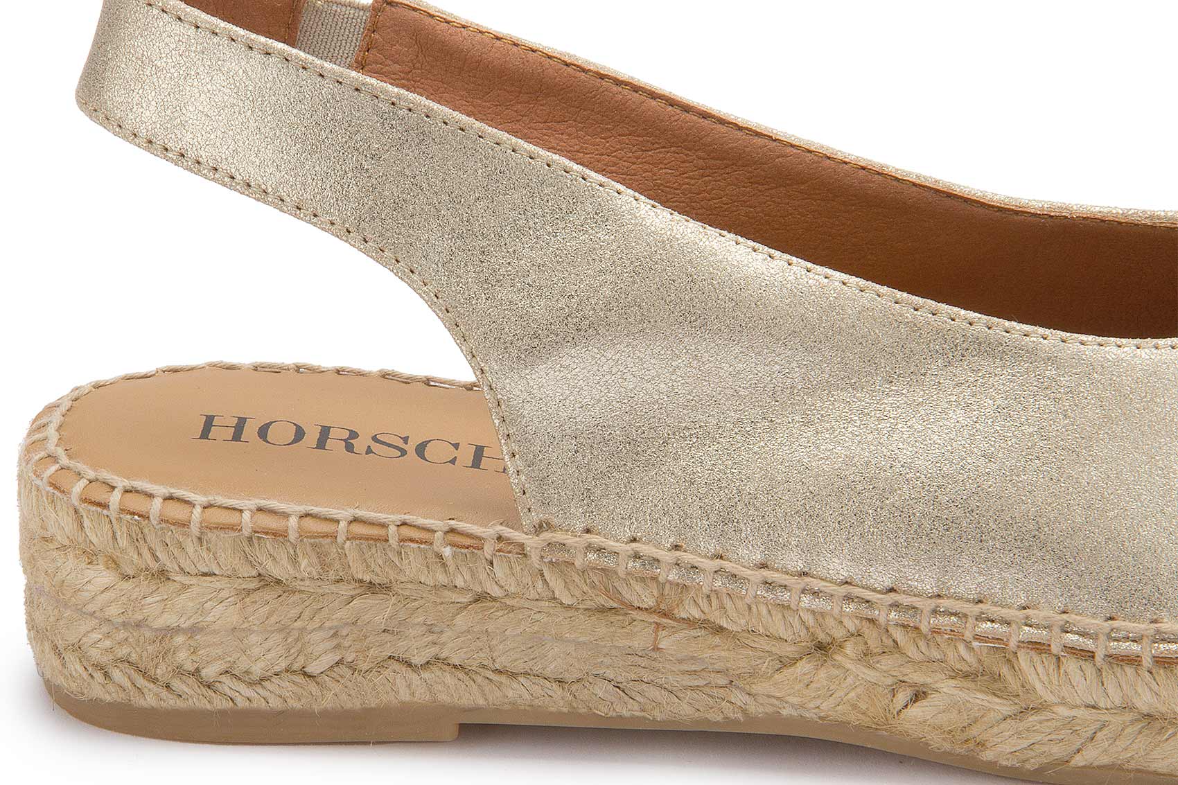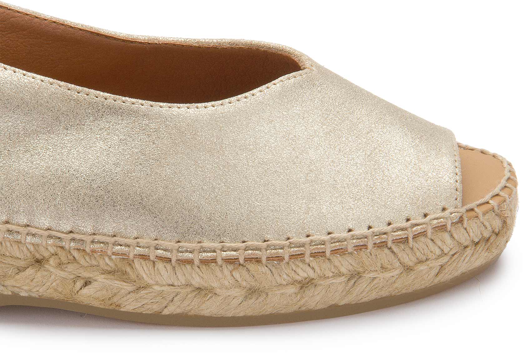 Dieser stilvolle Espadrille-Wedge in edlem Goldton vereint Eleganz und Komfort perfekt. Das weiche Leder-Obermaterial sorgt für ein angenehmes Tragegefühl, während die geflochtene Jutesohle mit moderatem Plateau eine sommerliche Note verleiht. Ideal für warme Tage, lässt sich dieser Schuh vielseitig kombinieren – ob lässig zur Jeans oder schick zum Sommeroutfit.