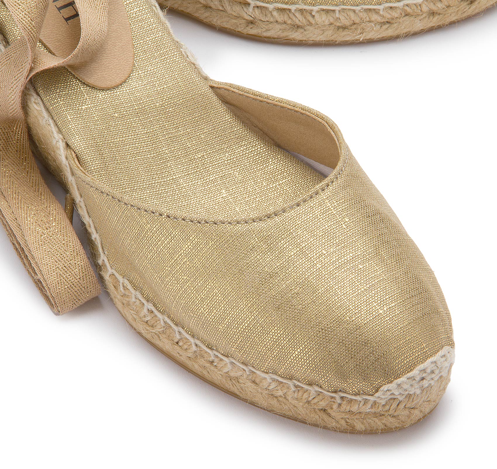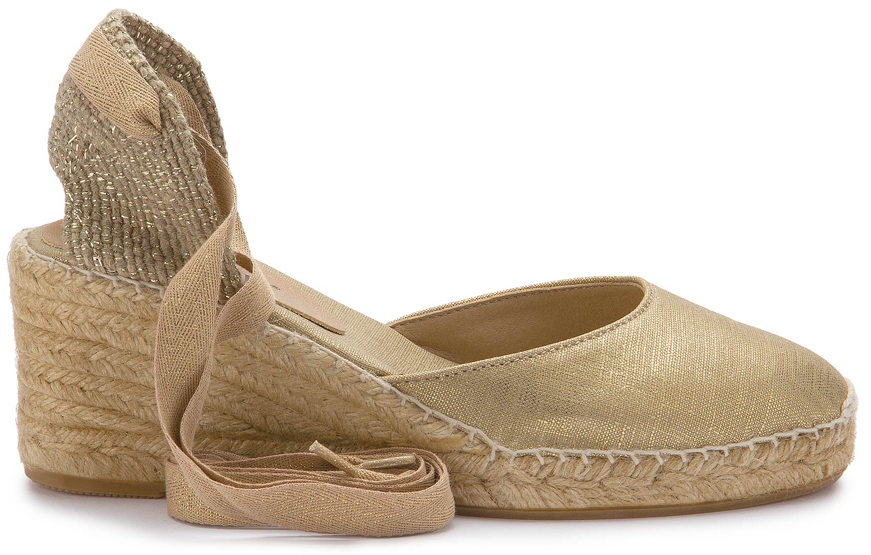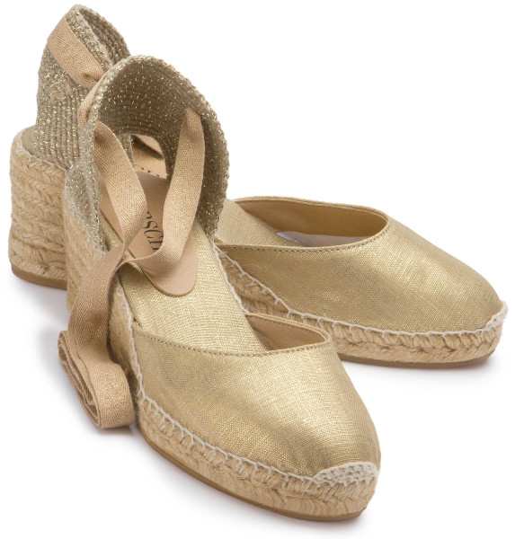Diese goldenen Espadrilles strahlen zeitlose Eleganz aus und sind die perfekte Wahl für sommerliche Auftritte. Das schimmernde Obermaterial und die feinen Bindebänder setzen stilvolle Akzente, während der geflochtene Keilabsatz für einen bequemen Sitz sorgt. Ideal für besondere Anlässe oder einen Hauch von Glamour im Alltag!