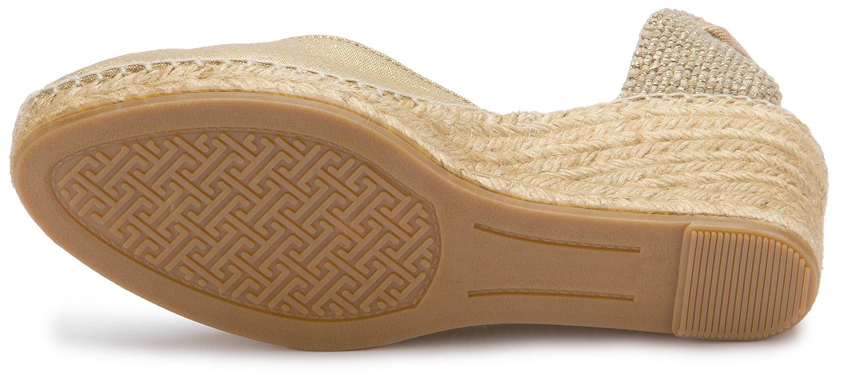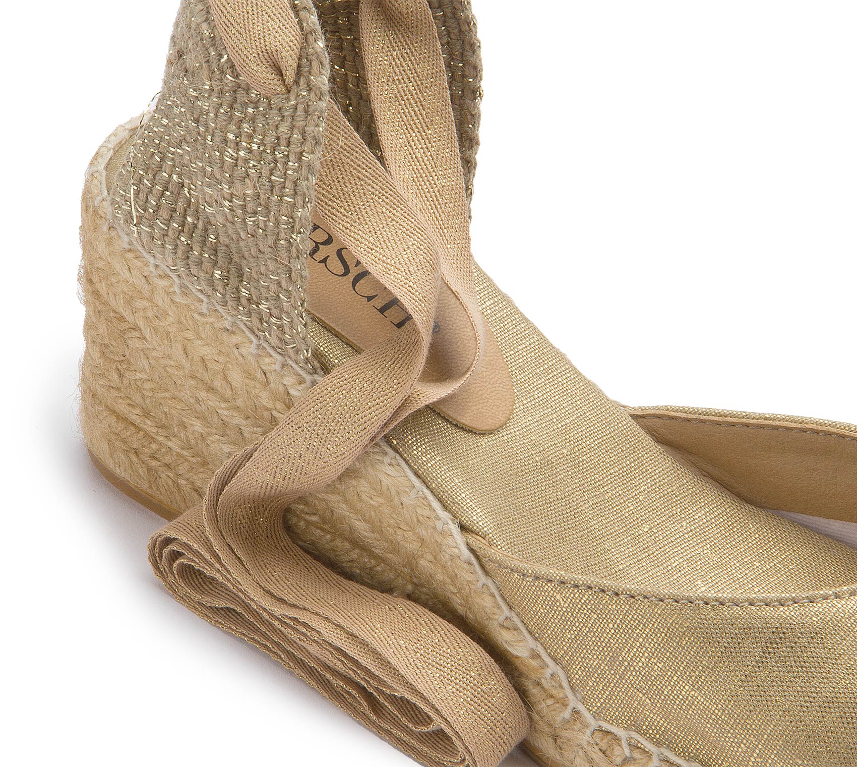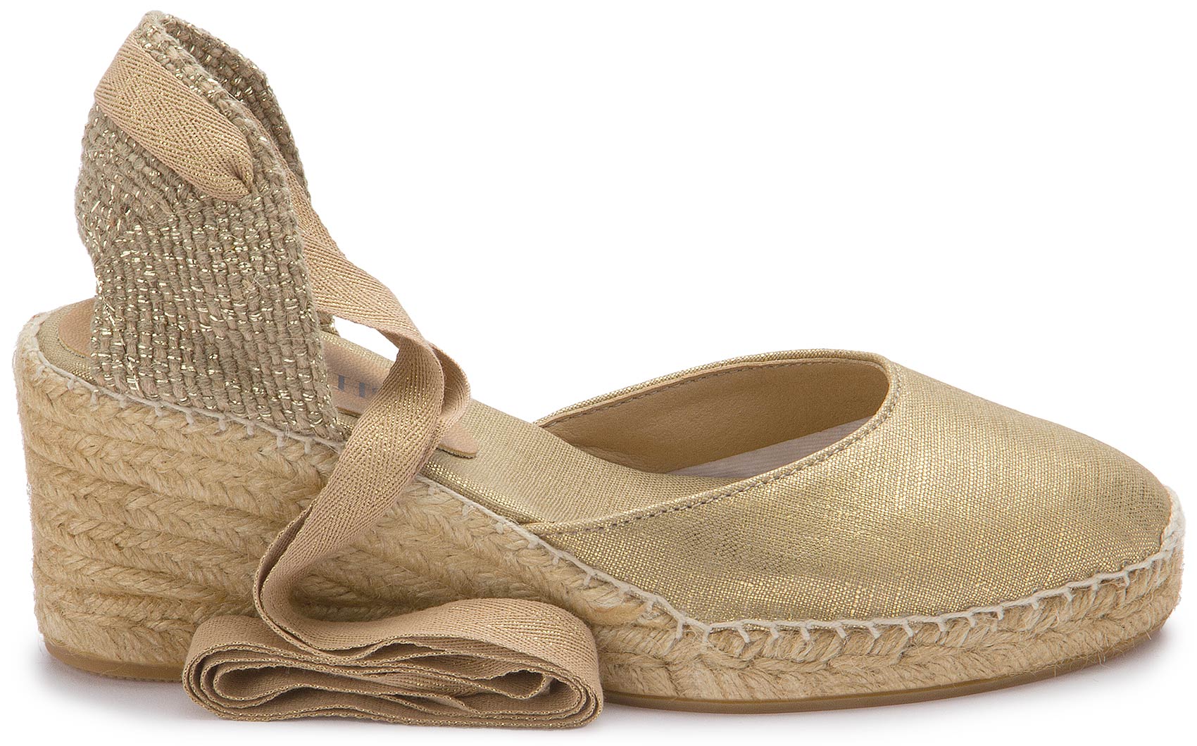 Diese goldenen Espadrilles strahlen zeitlose Eleganz aus und sind die perfekte Wahl für sommerliche Auftritte. Das schimmernde Obermaterial und die feinen Bindebänder setzen stilvolle Akzente, während der geflochtene Keilabsatz für einen bequemen Sitz sorgt. Ideal für besondere Anlässe oder einen Hauch von Glamour im Alltag!