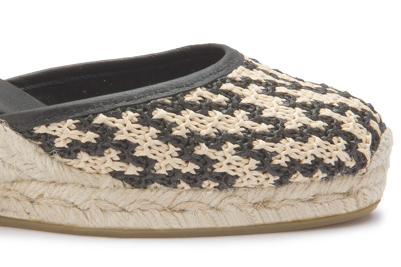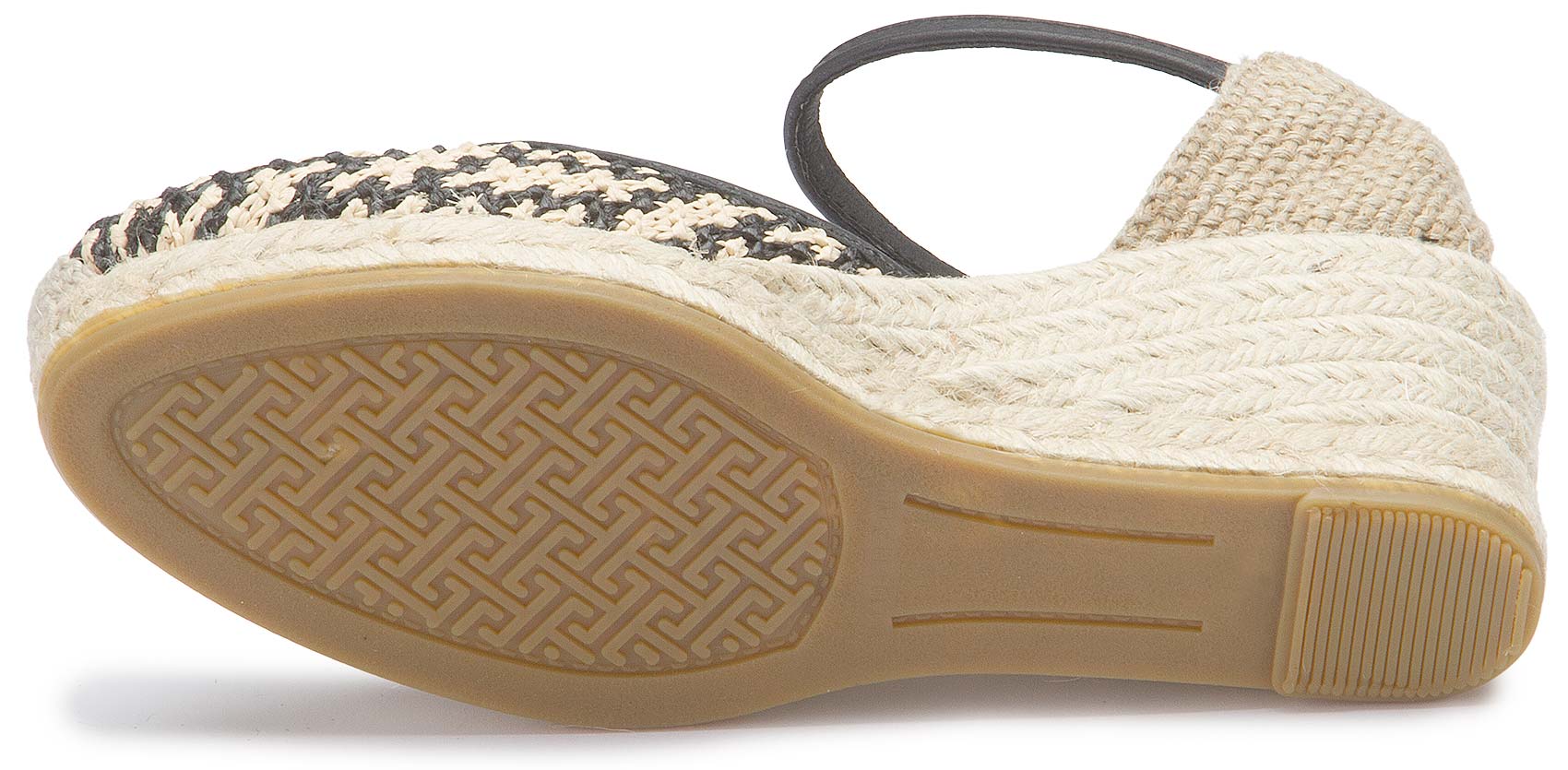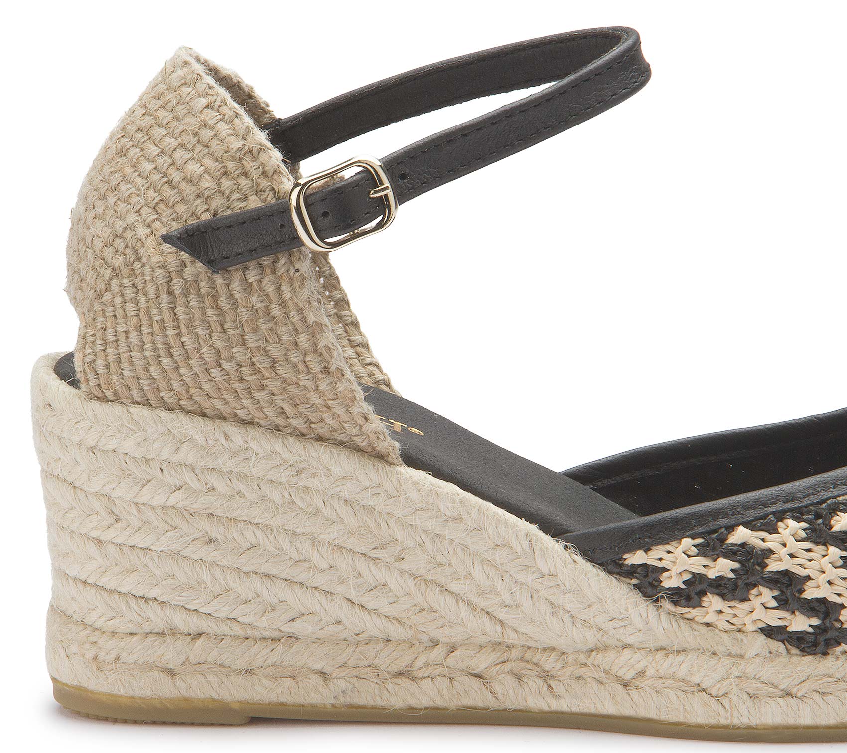 Diese eleganten Espadrilles vereinen sommerliche Leichtigkeit mit modernem Design. Das geflochtene Muster in Schwarz und Naturtönen sowie die Jute-Sohle verleihen dem Schuh einen stilvollen, luftigen Look, während der verstellbare Riemen für optimalen Halt sorgt. Perfekt für warme Tage – ob im Alltag oder zu besonderen Anlässen.