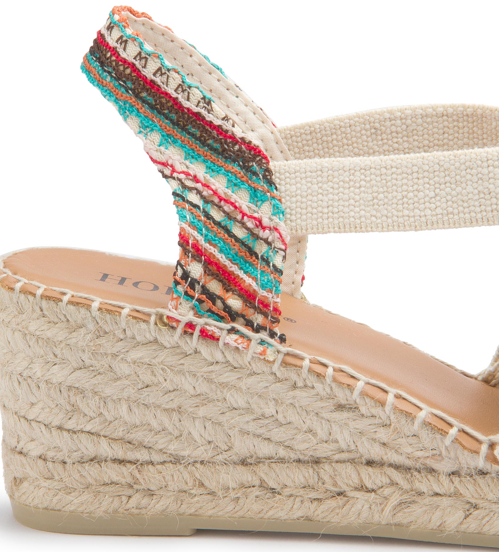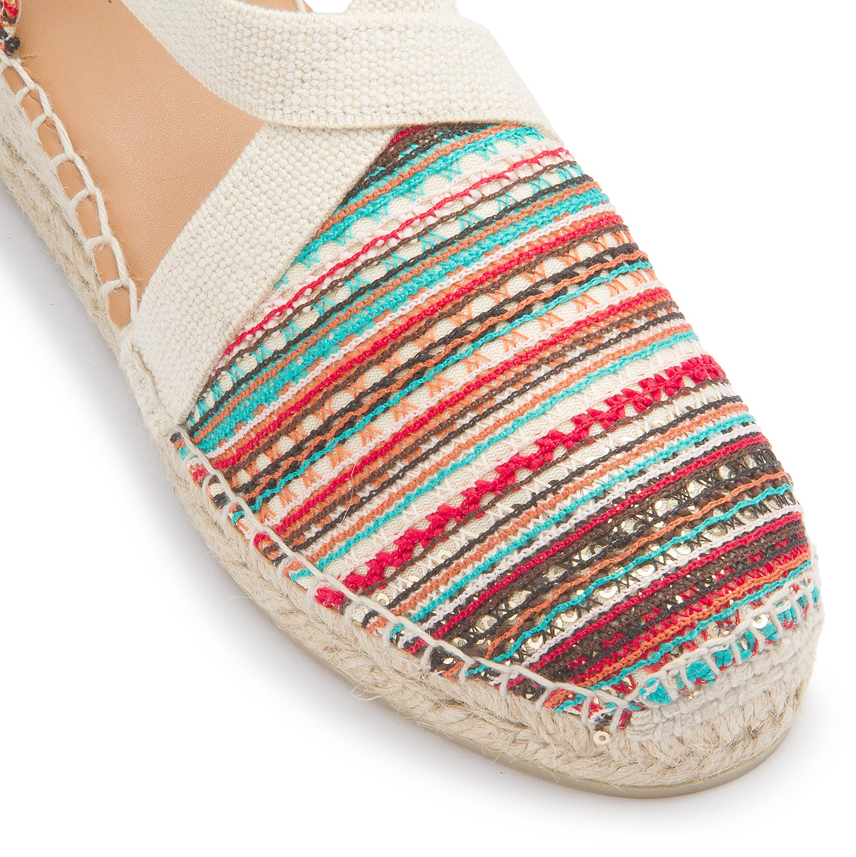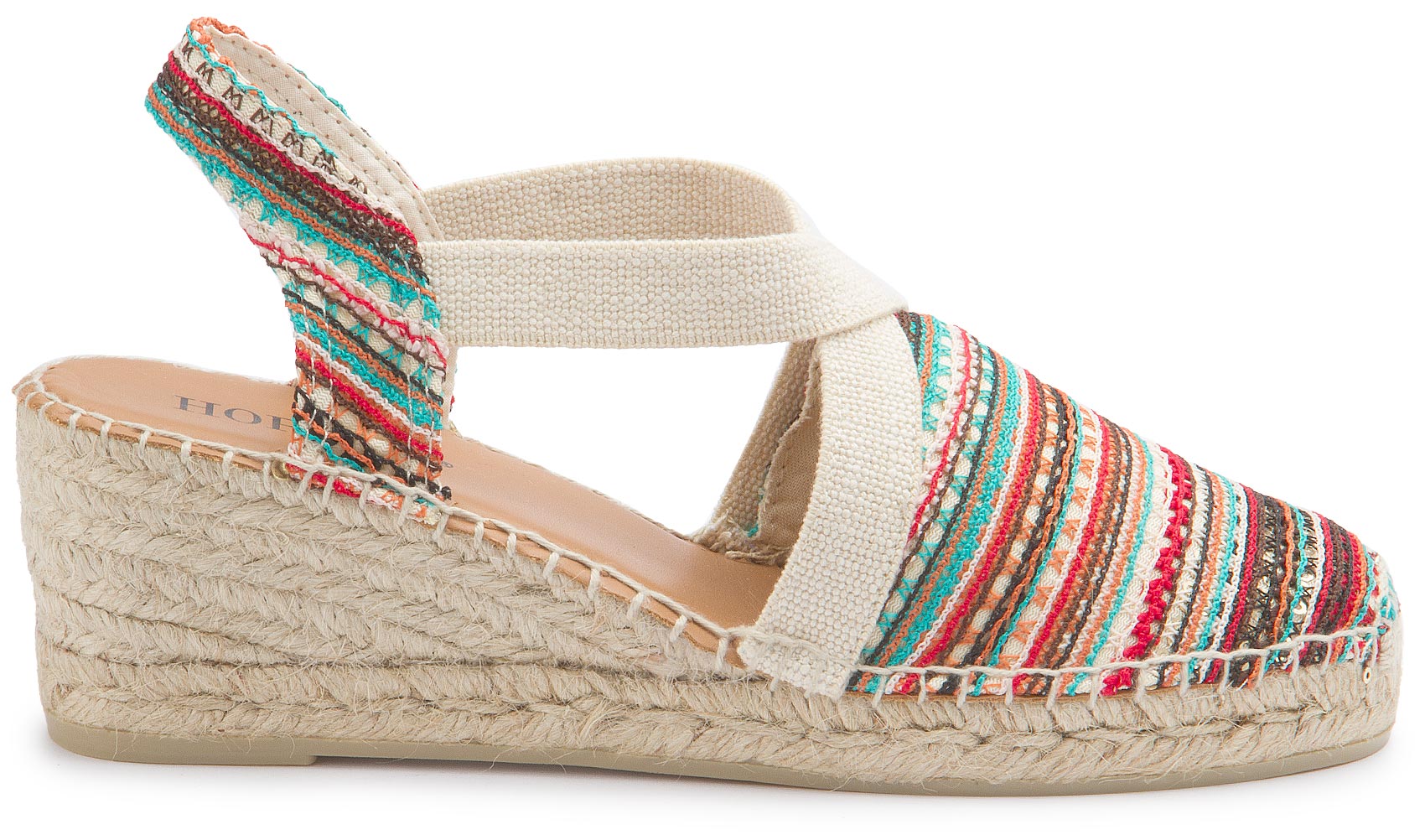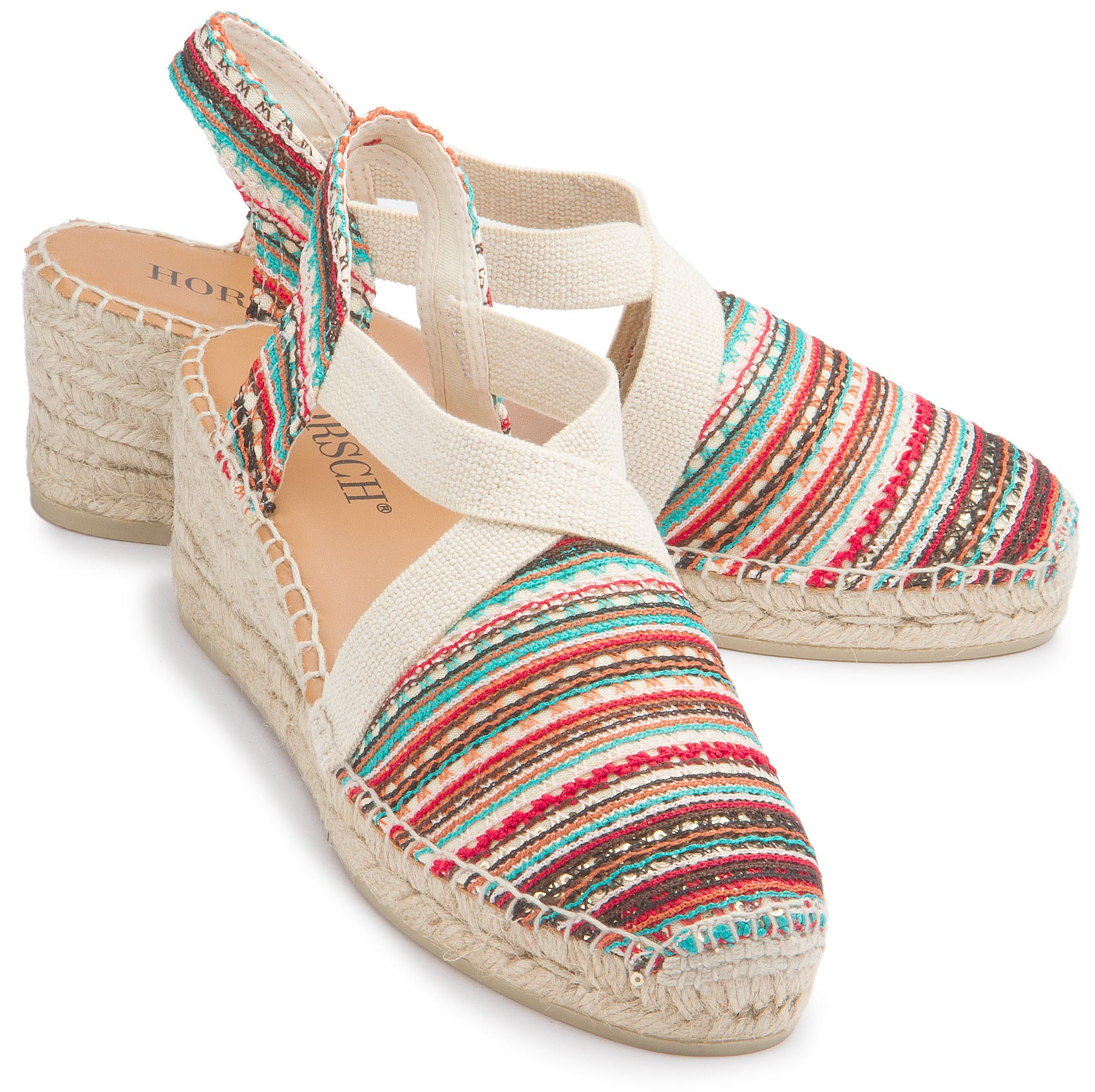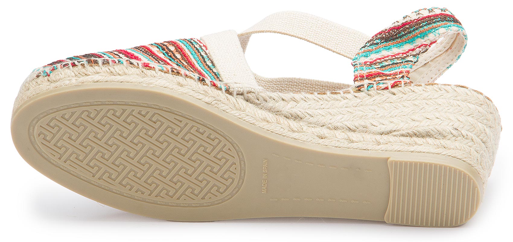 Mit diesen modischen Espadrilles wird man zum echten Blickfang. Das tolle Design und der angesagte Keilabsatz machen dieses Modell so besonders. Sehen lassen kann sich auch das Obermaterial, das aus Textil gefertigt wurde. Zu einem luftigen Kleid oder einem angesagten Jumpsuit passt der Schuh ideal.