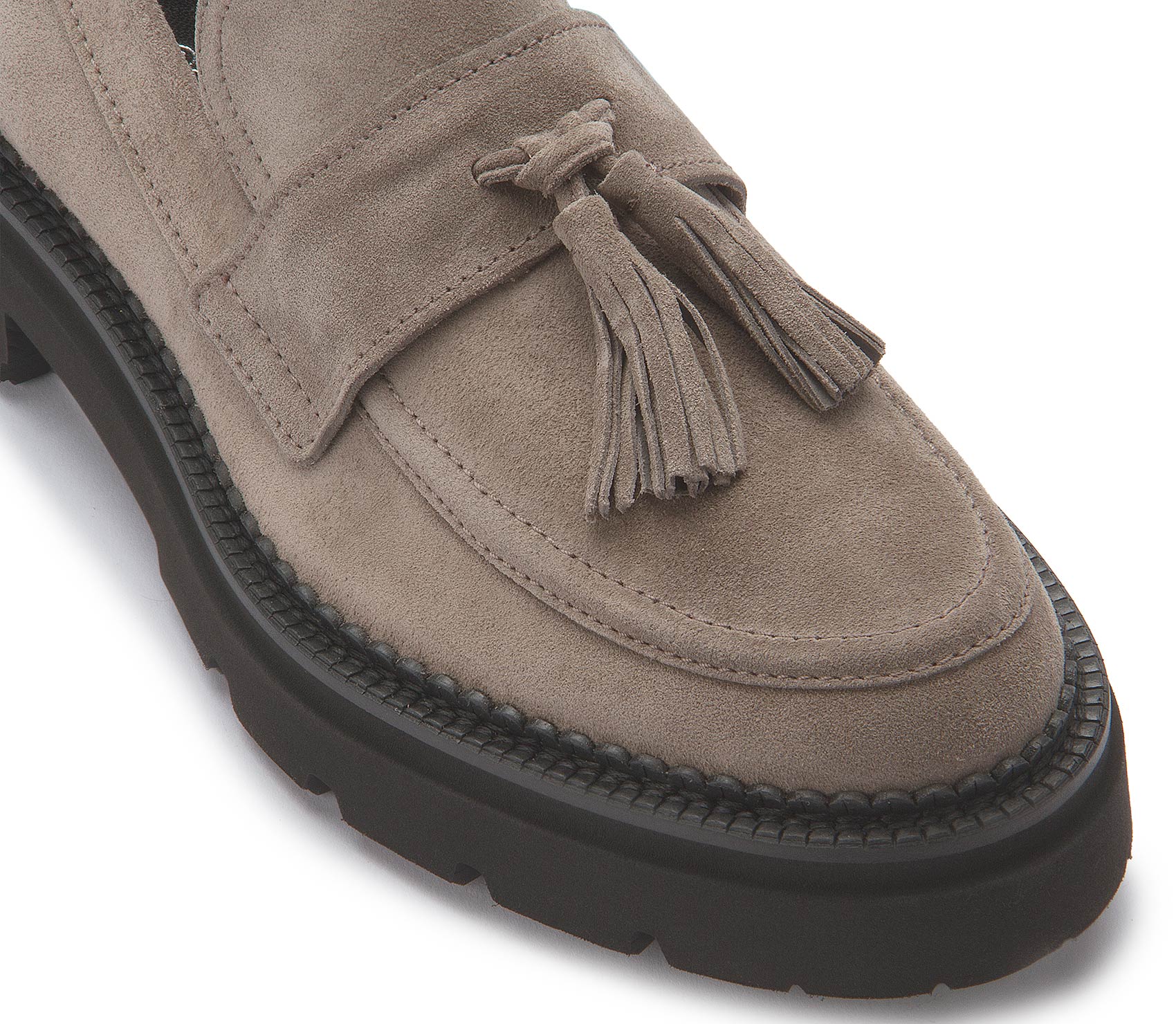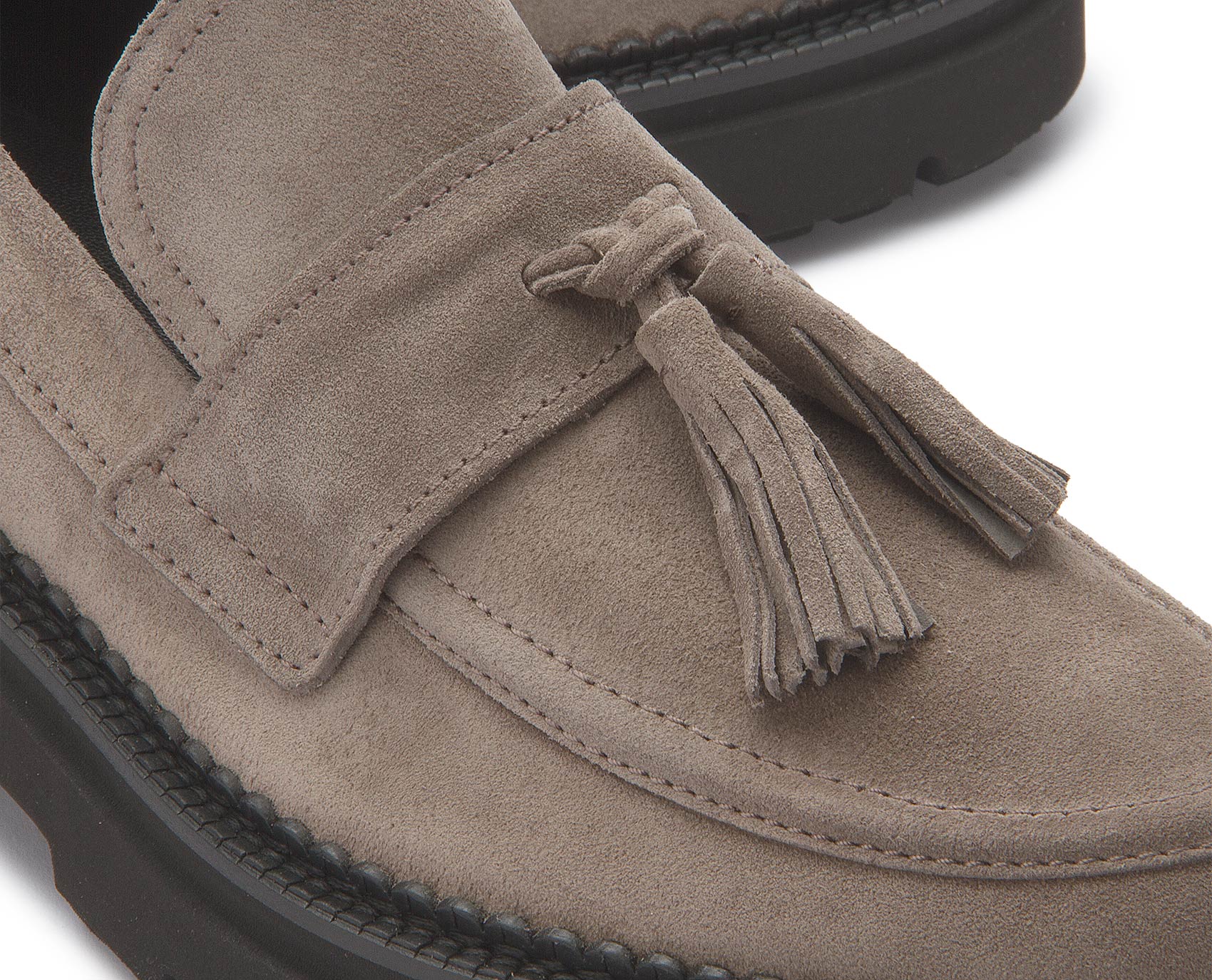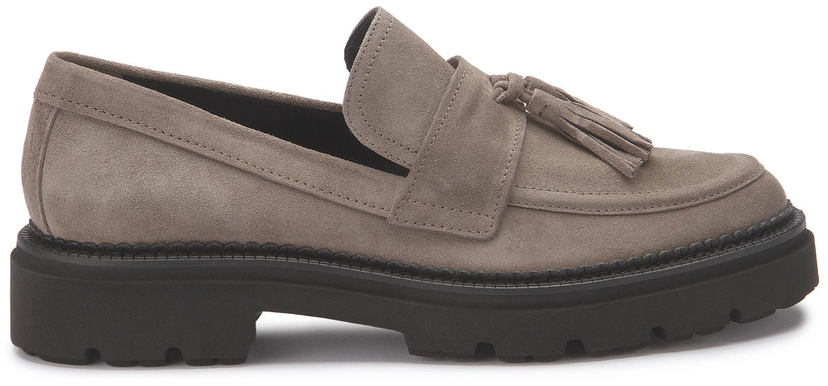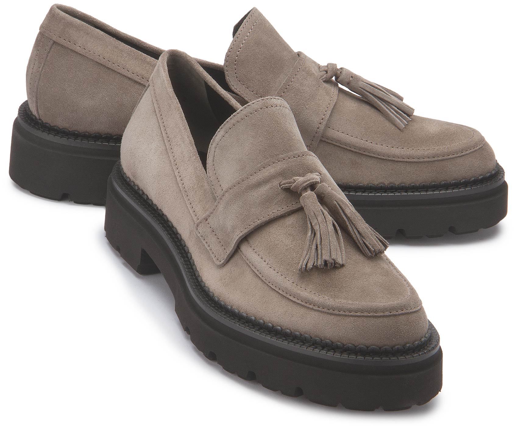 Diese edlen Loafer von Kennel & Schmenger vereinen klassischen Chic mit modernem Komfort. Das hochwertige Veloursleder in einem sanften Beigegrau wirkt besonders elegant und lässt sich vielseitig kombinieren – ob zur Anzughose, zur Jeans oder zu einem Kleid.