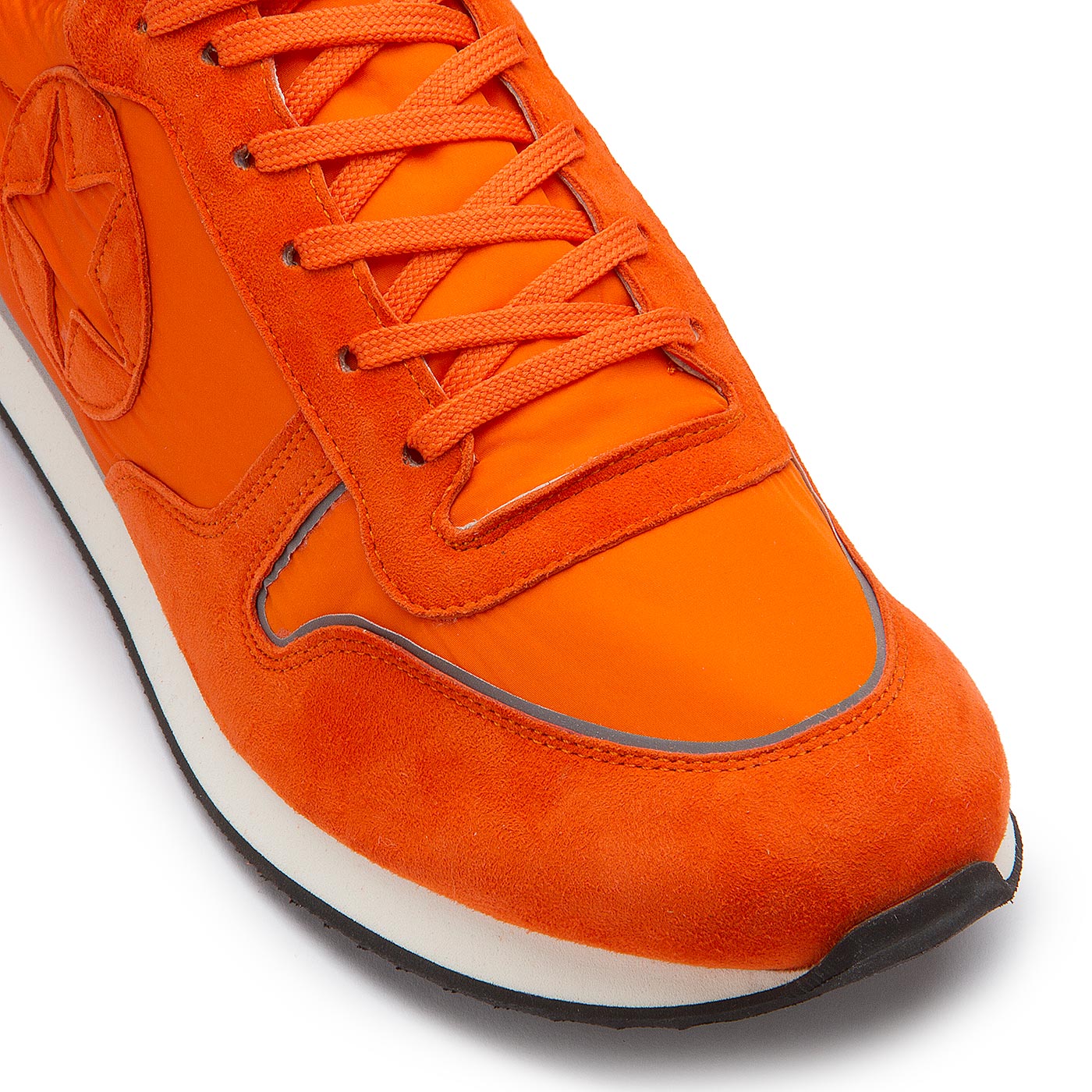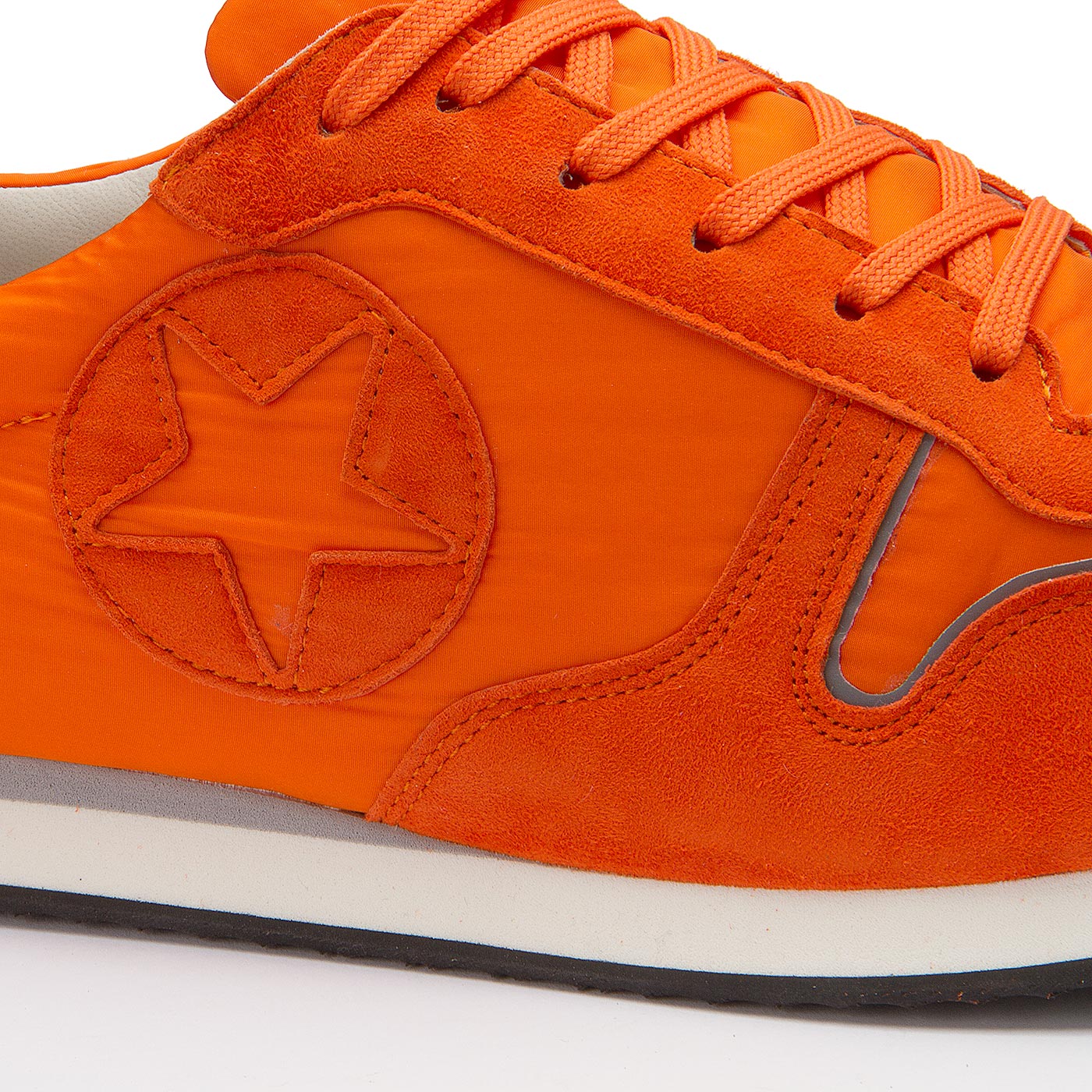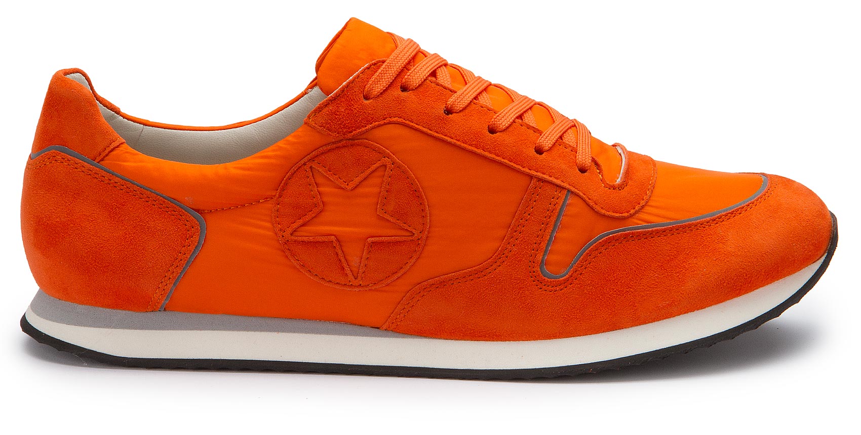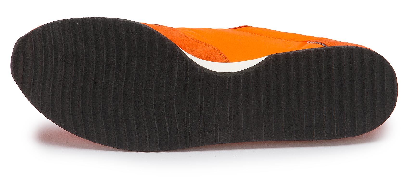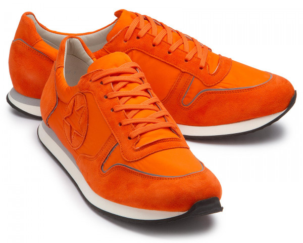 Sportlich und lässig zeigt sich dieser Sneaker der Marke Kennel & Schmenger. Orangefarbenes Nubukleder steht in attraktiver Kombination zu Nylon. Nahtakzentuierungen setzen den Sneaker sportiv in Szene. Ein schickes Detail ist der Patch mit der Aussparung in Sternenform an der Außenseite. Für ein lässiges Tragegefühl sorgen die Schnürsenkel, die von der Länge so abgemessen sind, dass sie auch ohne Schleife, dafür aber mit kleinen Knoten, guten Halt bieten. Die mehrfarbige Porosohle in Weiß und Grau hat eine dünne, weiche Laufsohle aus schwarzem Gummi.