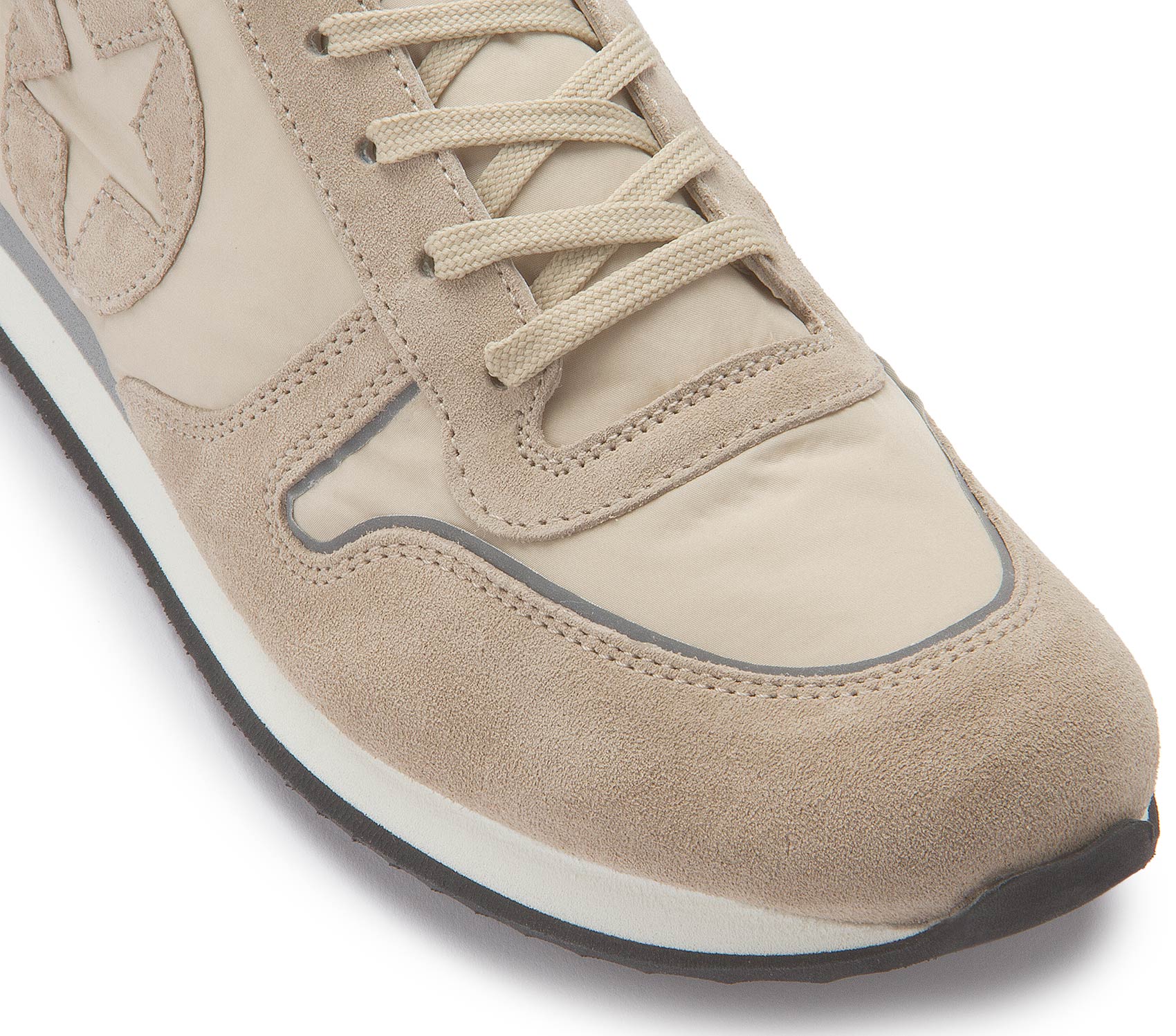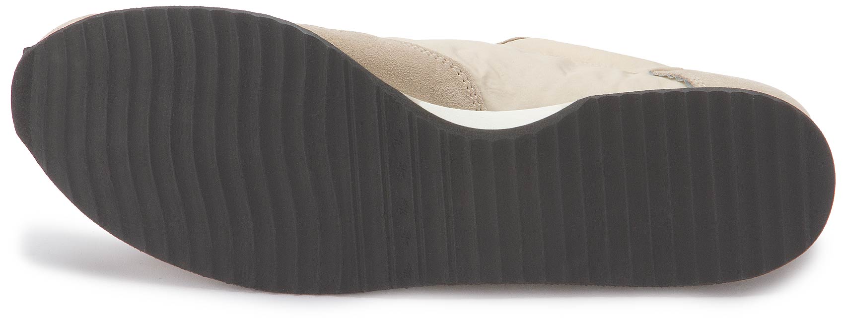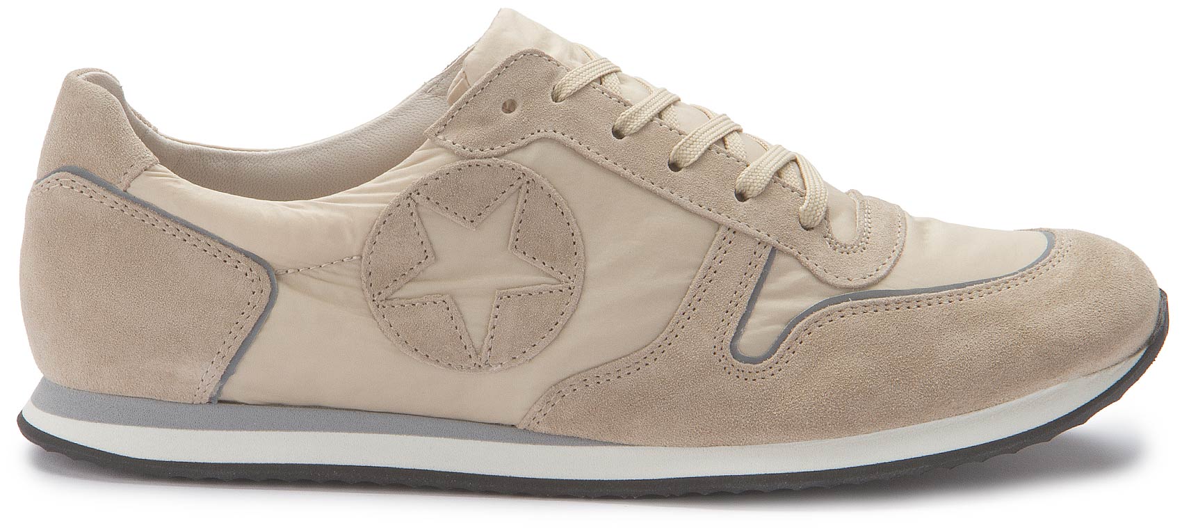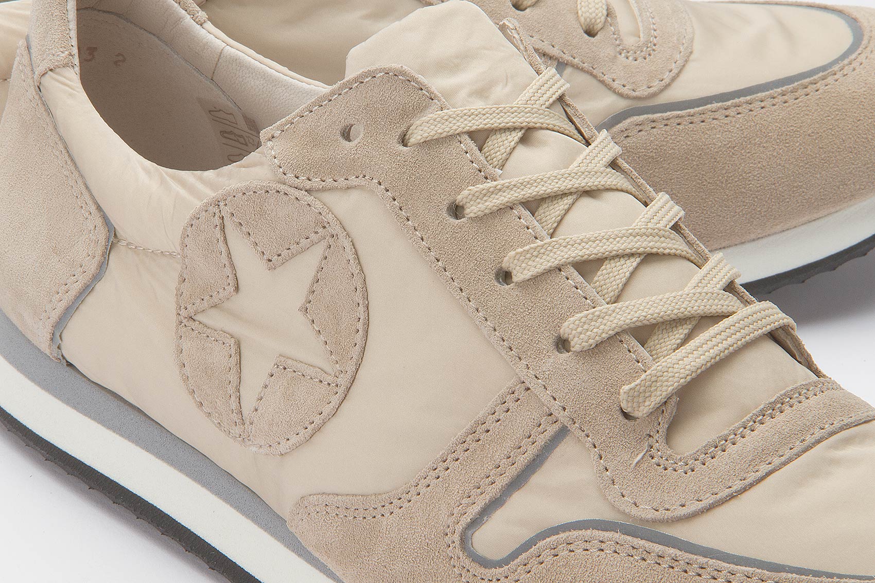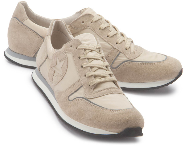 Sportlich und lässig zeigt sich dieser Sneaker der Marke Kennel & Schmenger. Beiges Rauleder steht in attraktiver Kombination zu Nylon. Nahtakzentuierungen setzen den Sneaker sportiv in Szene. Ein schickes Detail ist der Patch mit der Aussparung in Sternenform an der Außenseite. Für ein lässiges Tragegefühl sorgen die Schnürsenkel, die von der Länge so abgemessen sind, dass sie auch ohne Schleife, dafür aber mit kleinen Knoten, guten Halt bieten. Die mehrfarbige Porosohle in Weiß und Grau hat eine dünne, weiche Laufsohle aus schwarzem Gummi.