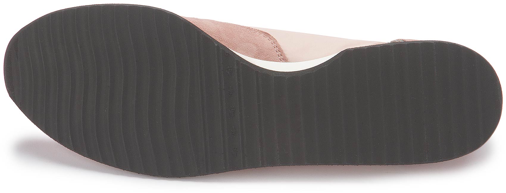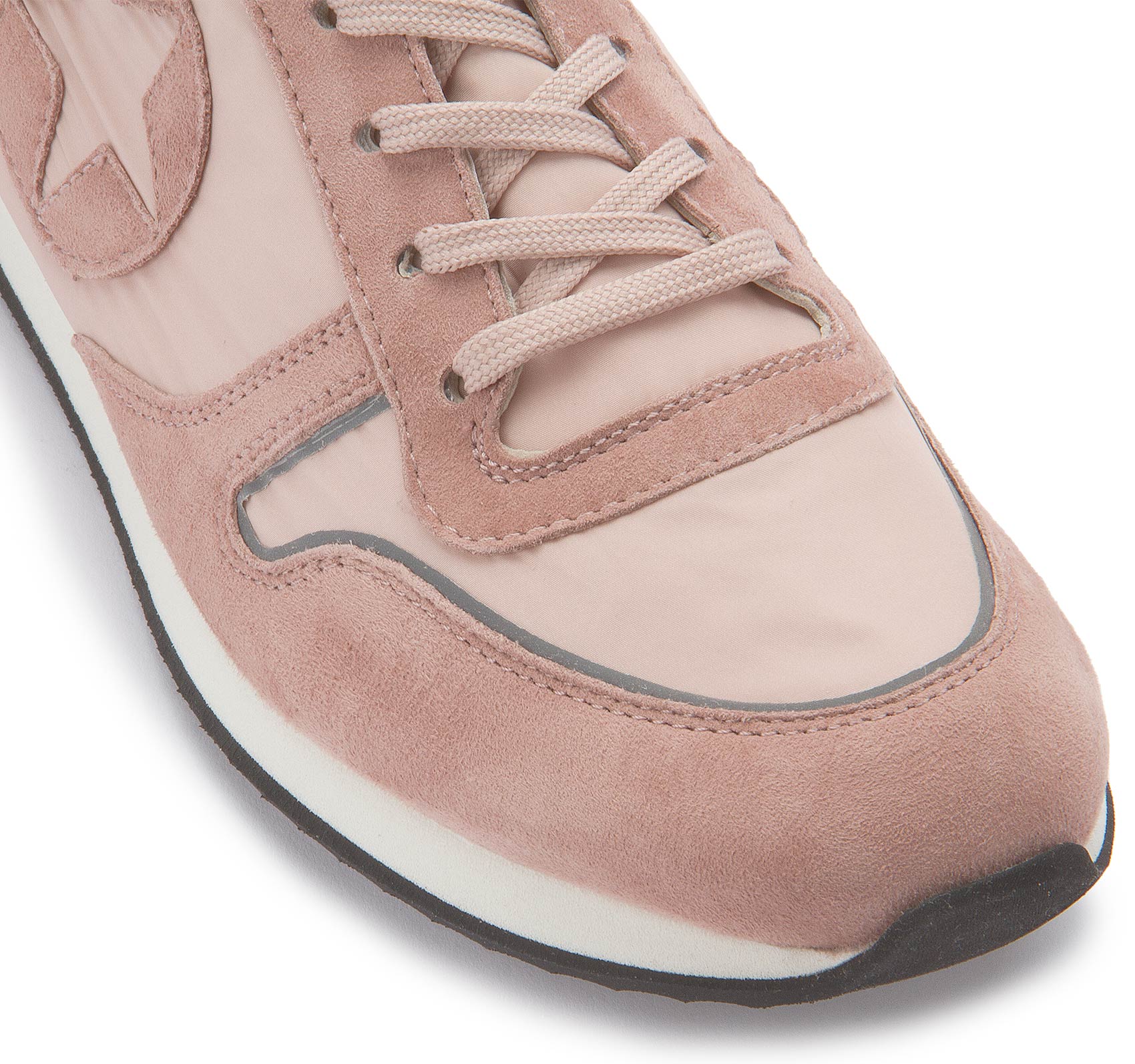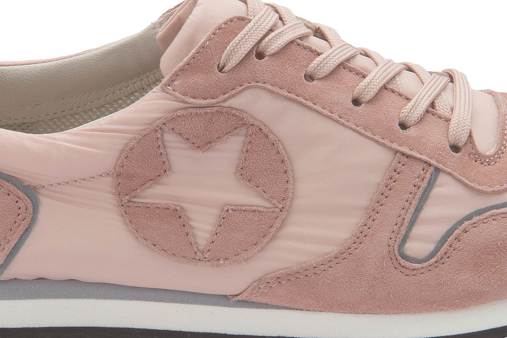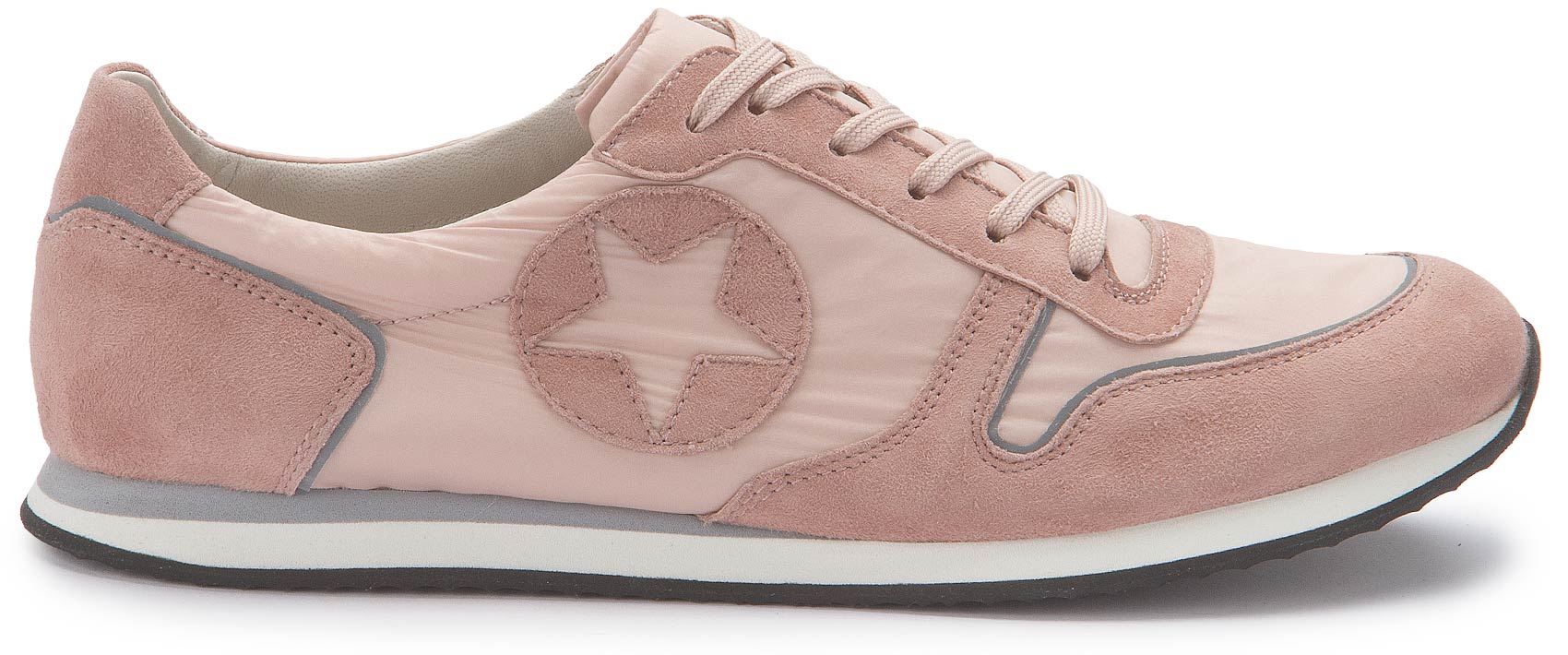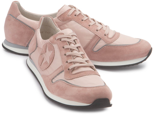 Sportlich und lässig zeigt sich dieser Sneaker der Marke Kennel & Schmenger. Nubukleder in Altrosa steht in attraktiver Kombination zu Nylon. Nahtakzentuierungen setzen den Sneaker sportiv in Szene. Ein schickes Detail ist der Patch mit der Aussparung in Sternenform an der Außenseite. Für ein lässiges Tragegefühl sorgen die Schnürsenkel, die von der Länge so abgemessen sind, dass sie auch ohne Schleife, dafür aber mit kleinen Knoten, guten Halt bieten. Die mehrfarbige Porosohle in Weiß und Grau hat eine dünne, weiche Laufsohle aus schwarzem Gummi.