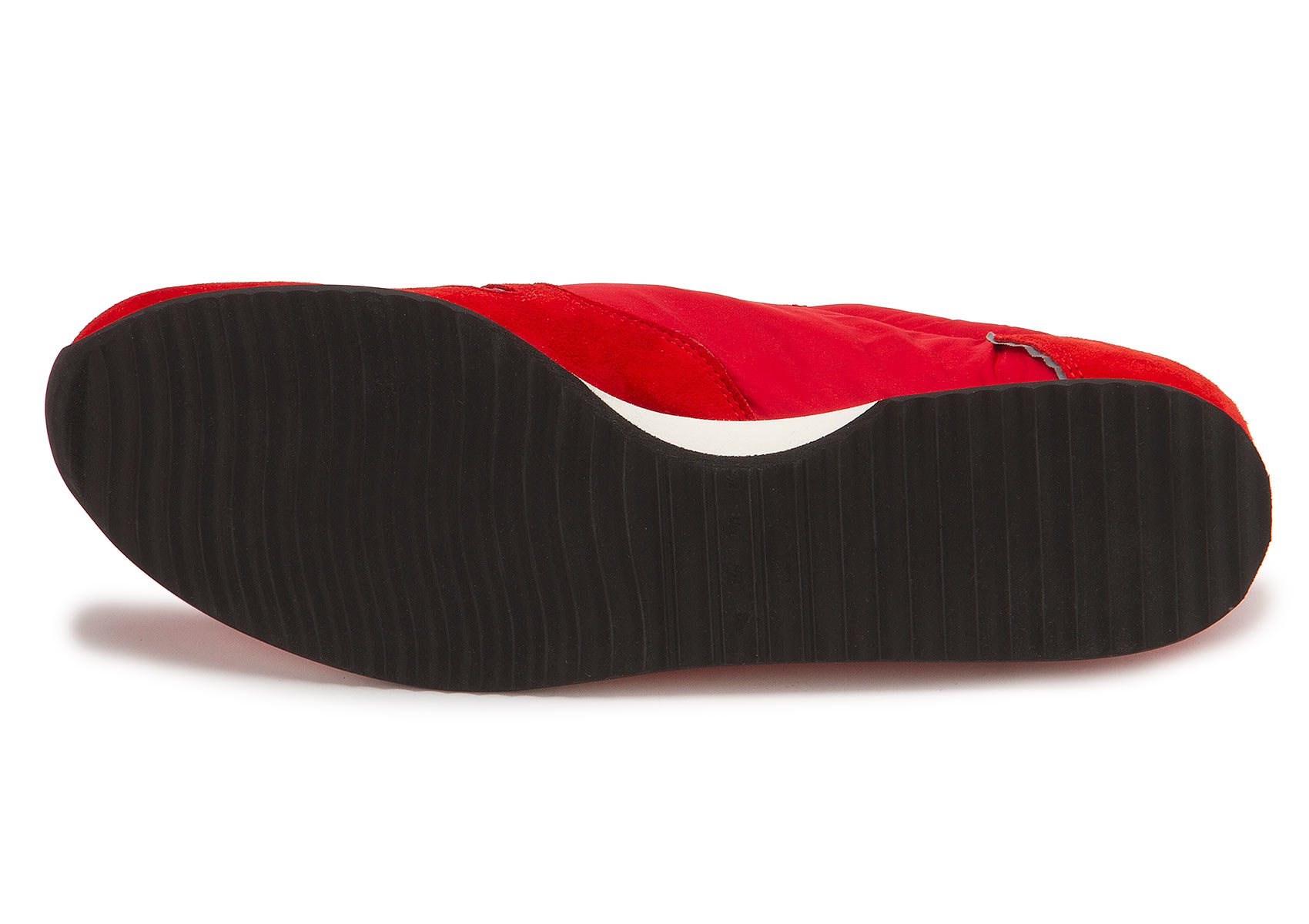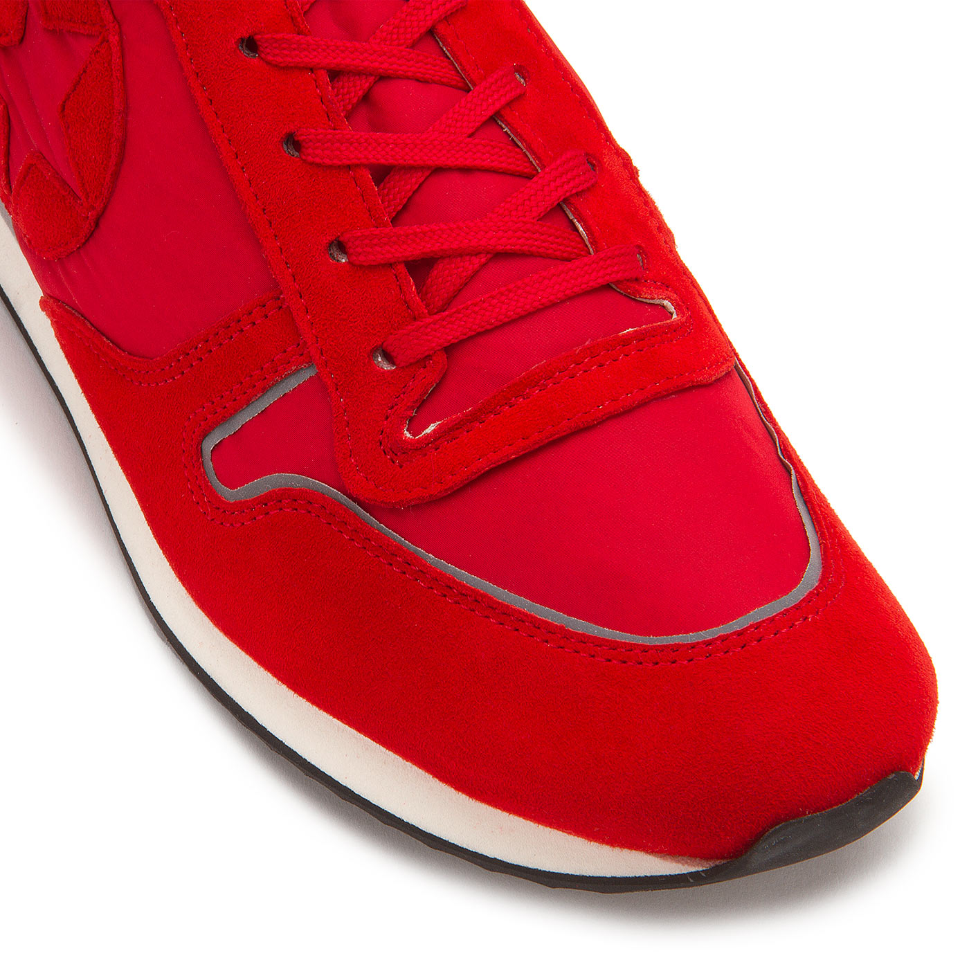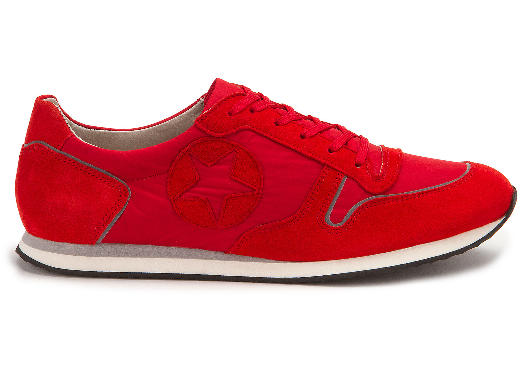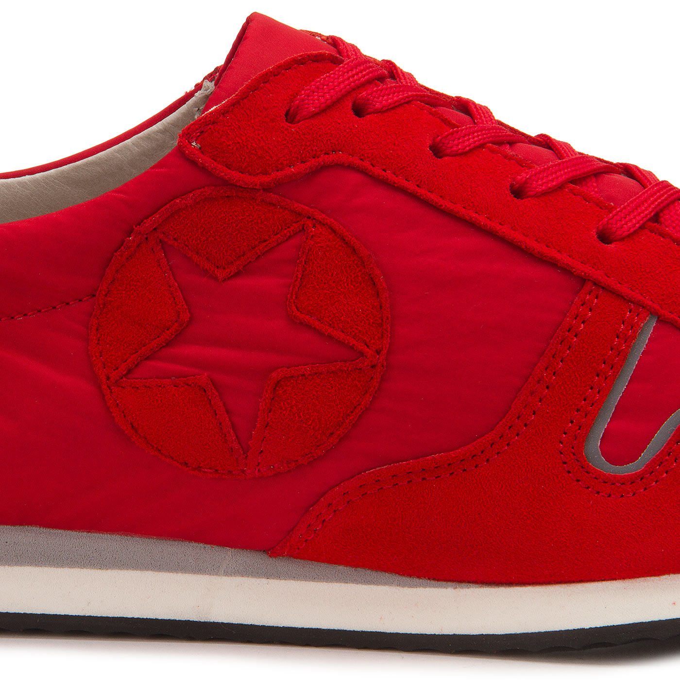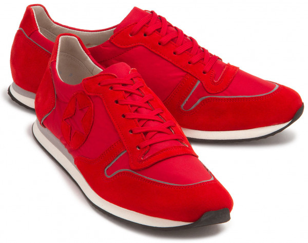Sportlich und lässig zeigt sich dieser Sneaker der Marke Kennel & Schmenger. Rotes Nubukleder steht in attraktiver Kombination zu Nylon. Nahtakzentuierungen setzen den Sneaker sportiv in Szene. Ein schickes Detail ist der Patch mit der Aussparung in Sternenform an der Außenseite. Für ein lässiges Tragegefühl sorgen die Schnürsenkel, die von der Länge so abgemessen sind, dass sie auch ohne Schleife, dafür aber mit kleinen Knoten, guten Halt bieten. Die mehrfarbige Porosohle in Weiß und Grau hat eine dünne, weiche Laufsohle aus schwarzem Gummi.