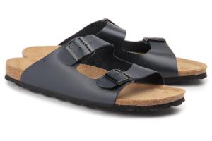 Wenn dann, wie bei dem dezenten Paar aus schwarzem Leder, auch noch ein anatomisch vorgeformtes und gepolstertes Fußbett hinzukommt, steht dem Tragevergnügen nichts mehr im Wege. Der schlichte Look macht auch jenseits von Strand und Palmen eine solide Figur.