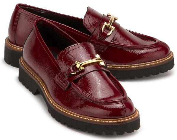 Der weinrote Loafer wartet mit einem dunklen Farbton auf, der edel erscheint. Diese Wirkung unterstreicht das Lackleder genauso wie die goldene Metalltrense. Die zeitlos schicken Loafer verdeutlichen: Wer wohldosierte Farbtupfer mit exquisiter Aura mag, sollte bordeauxrote Schuhe kombinieren, beispielsweise mit dem Businesslook in Beige, Karamellbraun oder Dunkelblau.