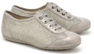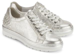 Das silberfarbene Leder funkelt im Licht, dazu kommt ein markanter Strassbesatz im Fersenbereich. Mit silbernen Lurexfäden durchzogene Schnürsenkel runden den opulenten Look ab. Die Schuhe für Damen setzen den beliebten Metallic Trend mit Bravour um.