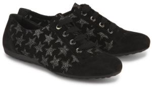 Sneaker für Damen in Übergröße können so wunderbar verspielt und mädchenhaft sein, wie dieses schillernde Paar beweist. Silbern glitzernd setzen sich die markanten Sterne von dem schwarzen Veloursleder ab – fast wie die Himmelskörper vom Nachthimmel.