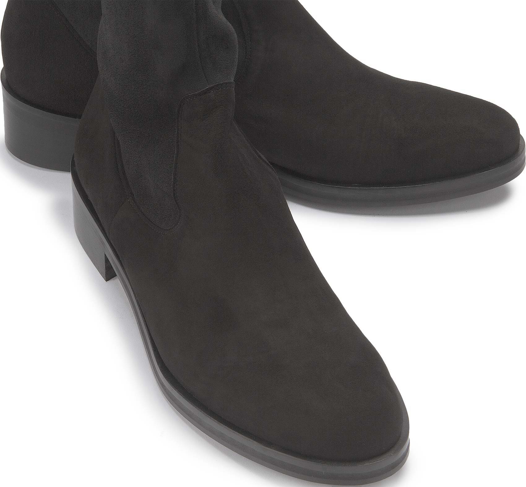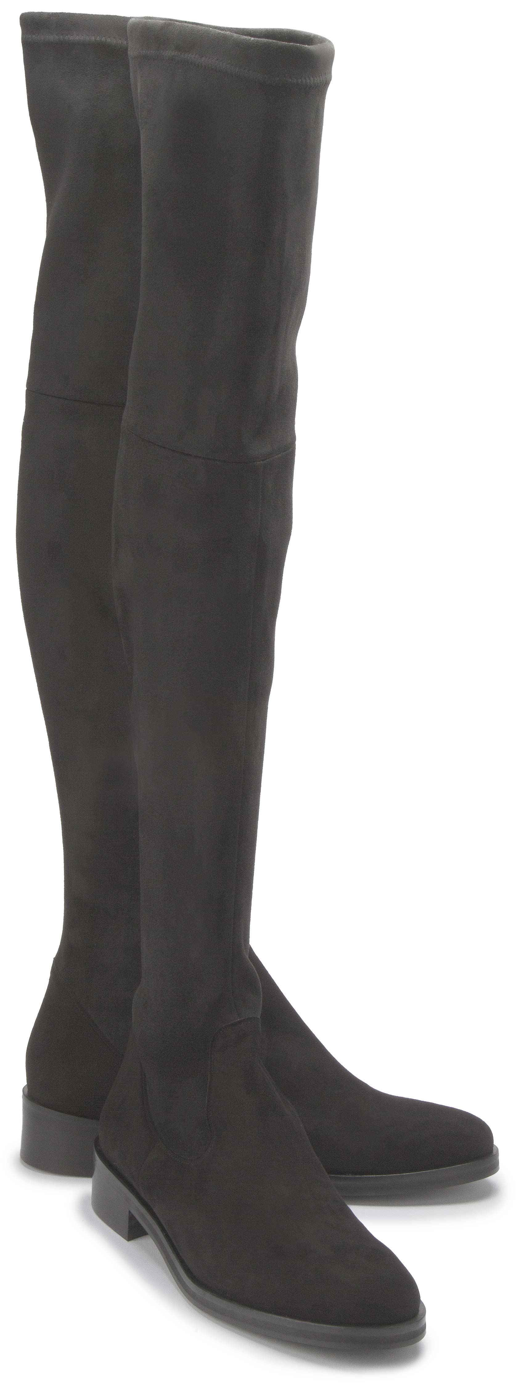 Die Stiefel von Bariello Milano avancieren mit ihrer Overknee-Silhouette und dem niedrigen Absatz zwischen verführerischer Femininität und Lässigkeit. Der Schaft aus flexiblen Textil in hochwertiger Rauleder-Optik passt sich dem Bein optimal an sodass eine tolle Passform garantiert ist.