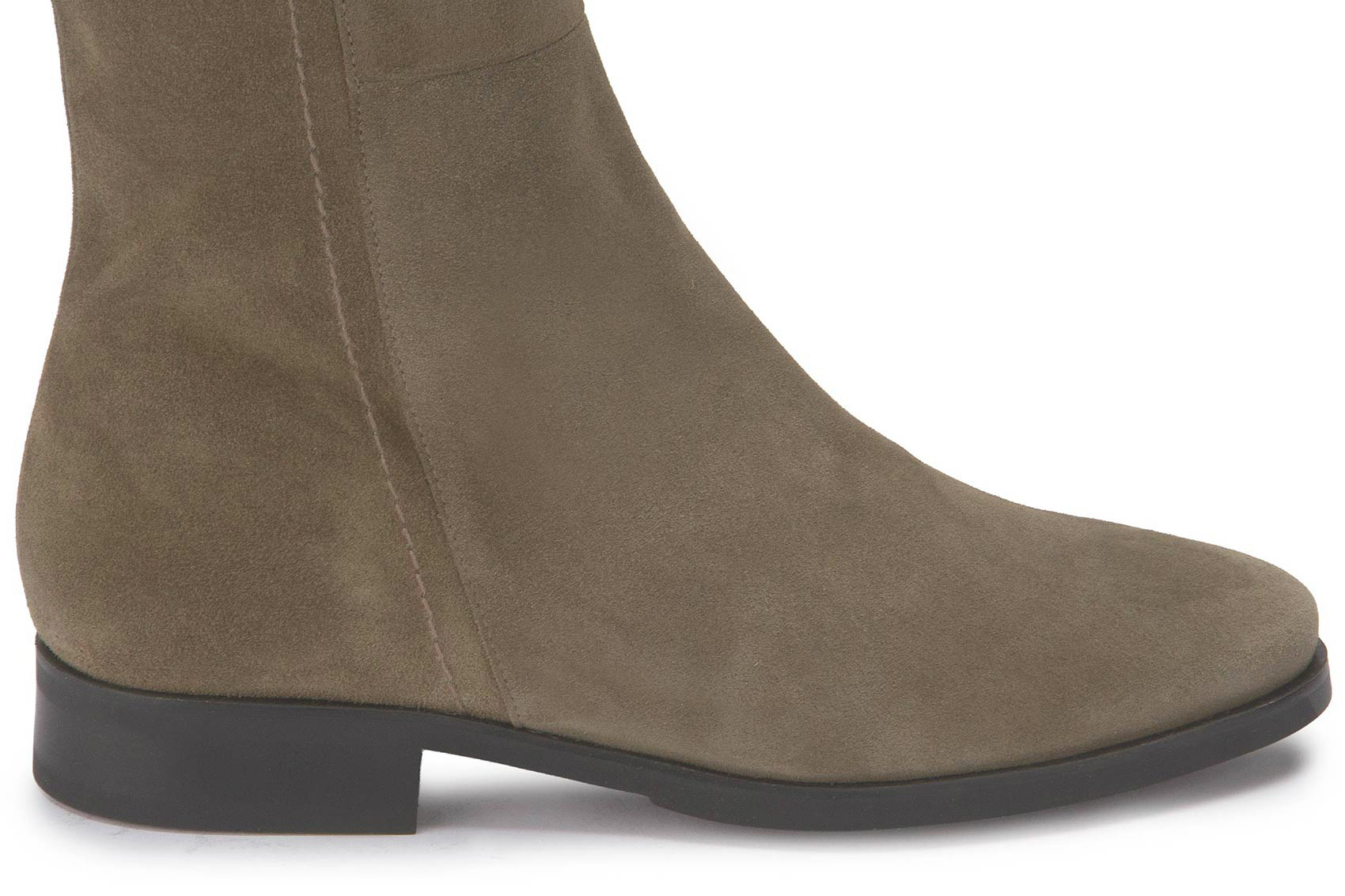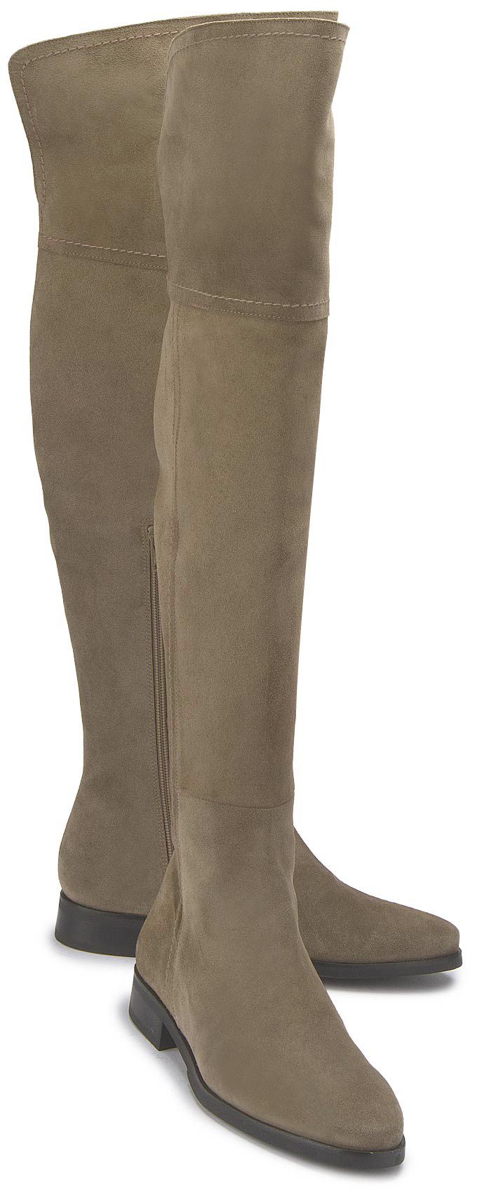 Die Stiefel von Bariello Milano avancieren mit ihrer Overknee-Silhouette und dem niedrigen Absatz zwischen verführerischer Femininität und Lässigkeit, was sie in Kombination mit dem schwarzen Leder für elegante Tages- und Abend-Looks prädestiniert.