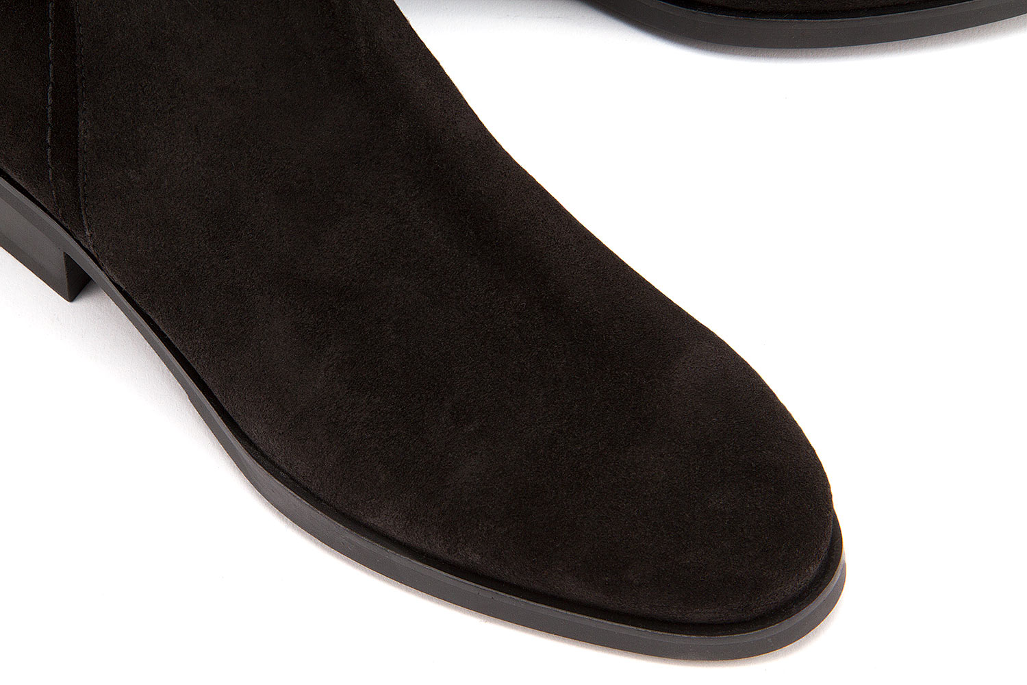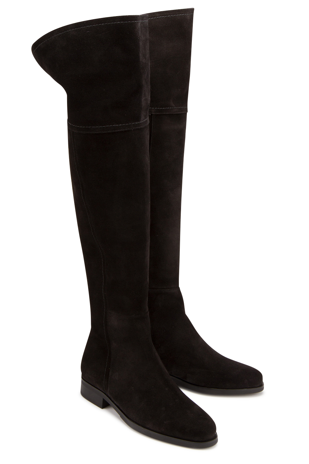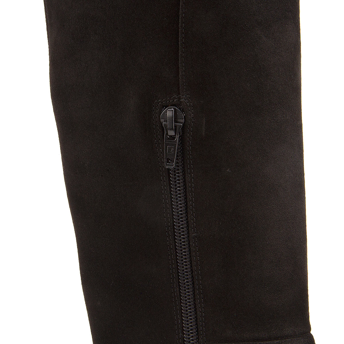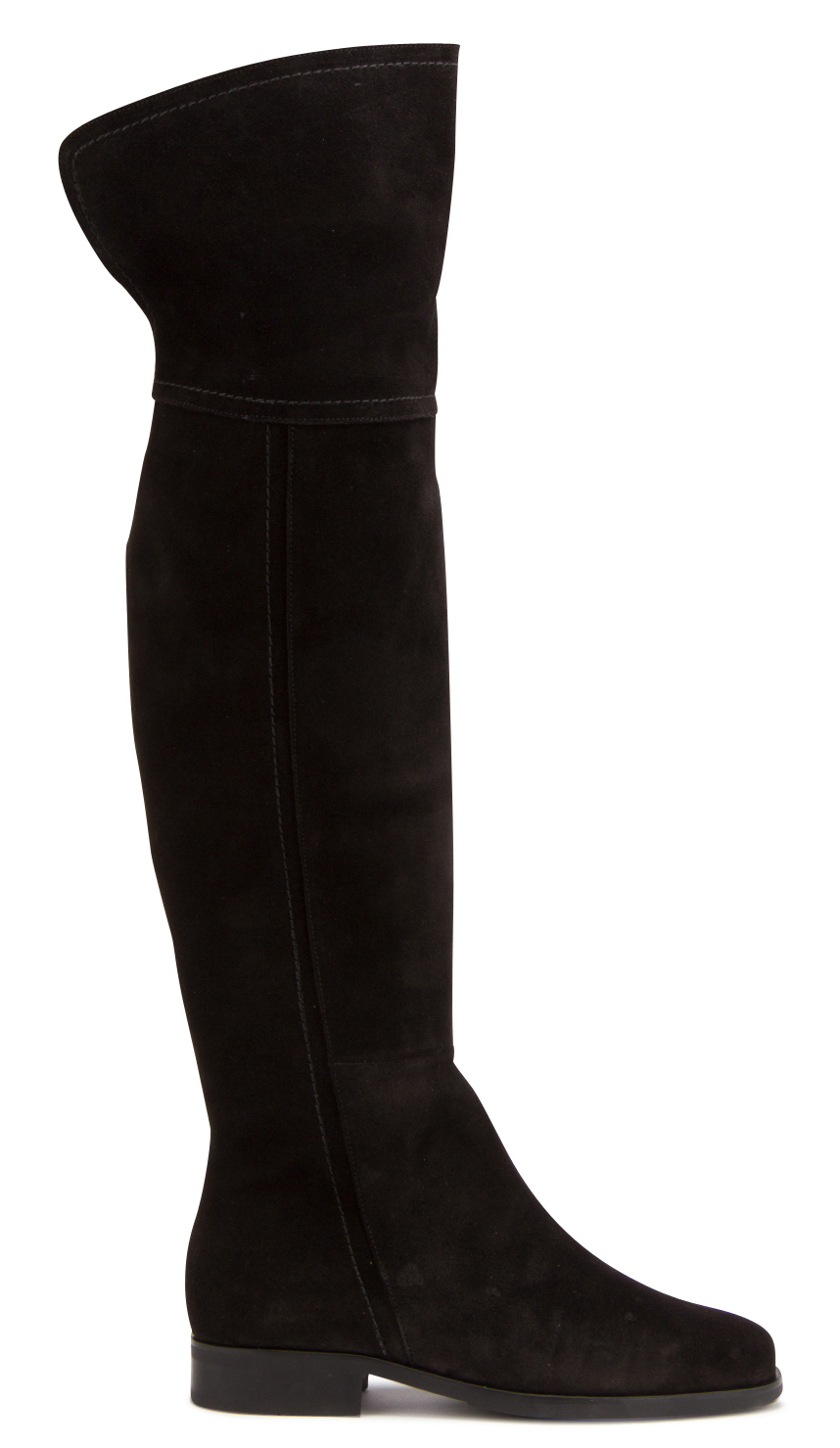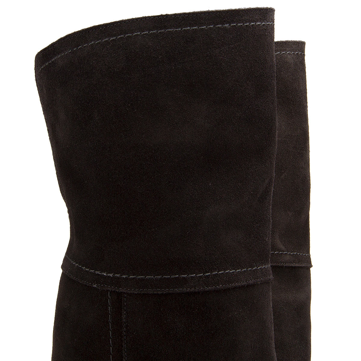 Die Stiefel von Bariello Milano avancieren mit ihrer Overknee-Silhouette und dem niedrigen Absatz zwischen verführerischer Femininität und Lässigkeit, was sie in Kombination mit dem schwarzen Leder für elegante Tages- und Abend-Looks prädestiniert.