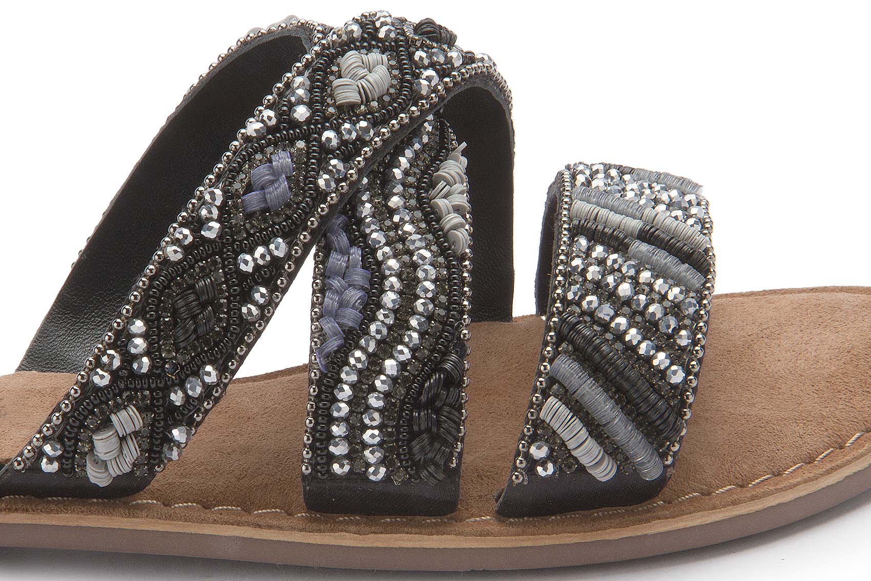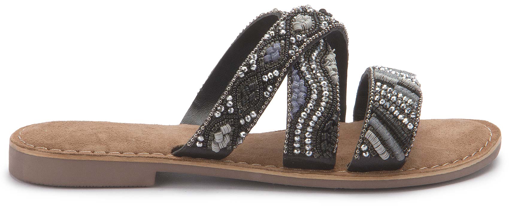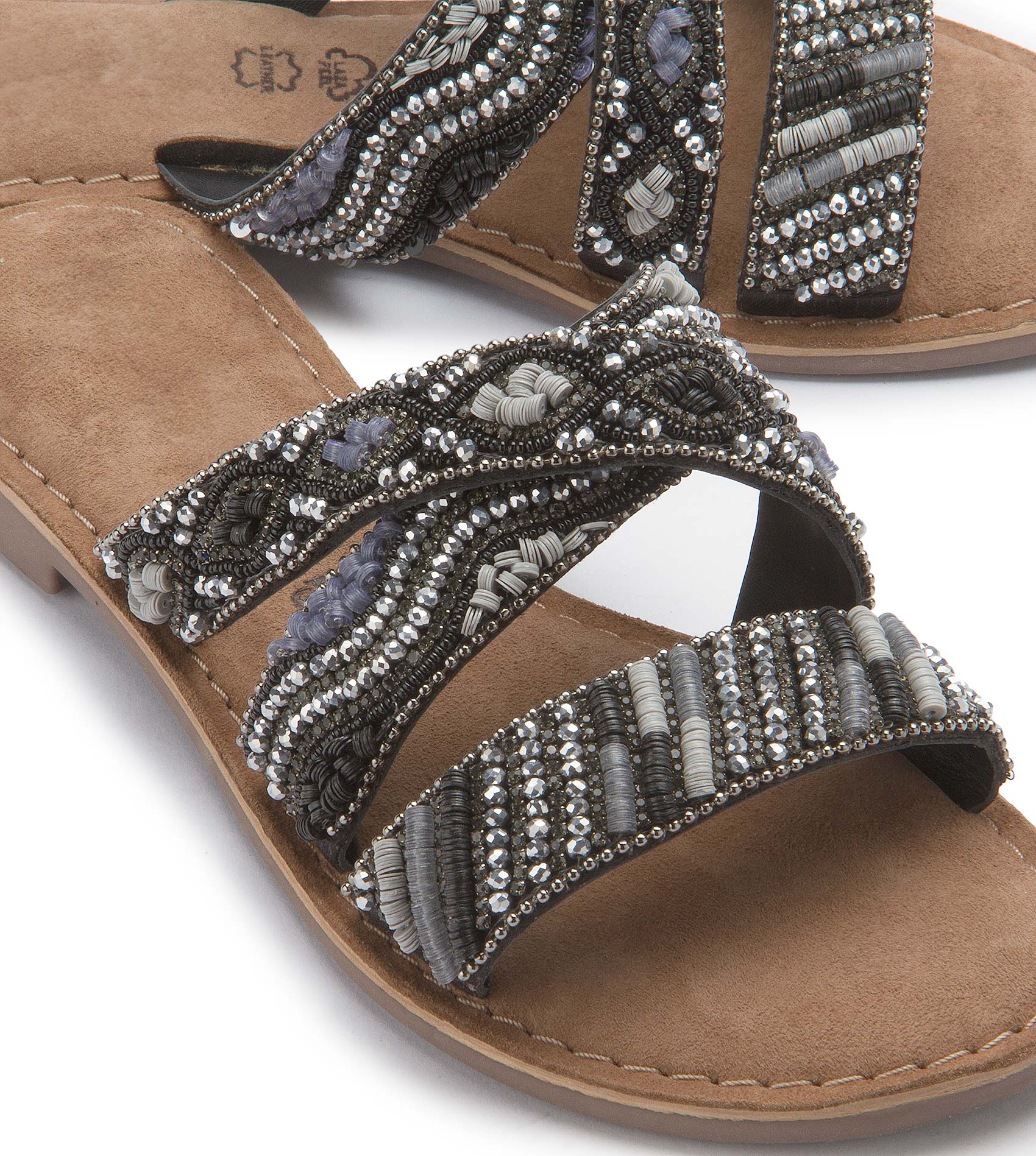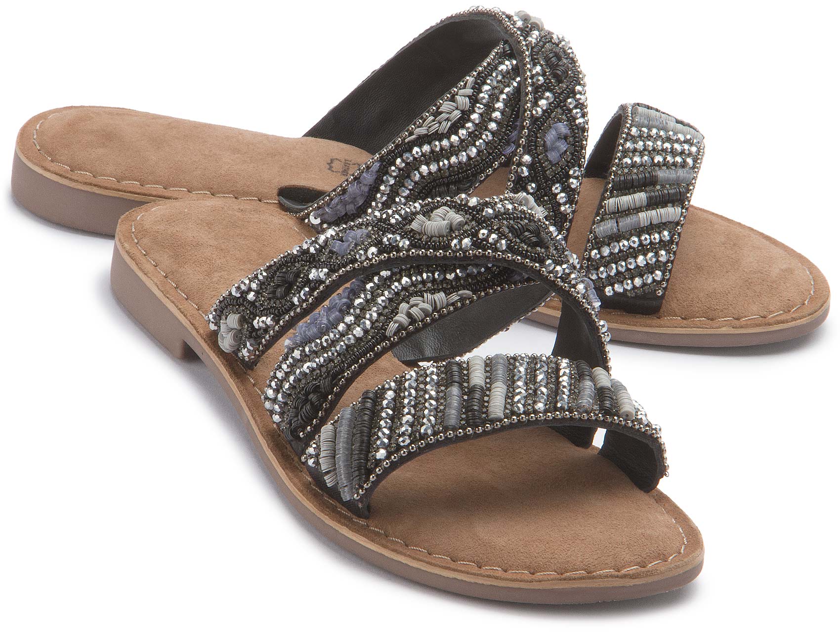 Die Pantolette, ein Schuh mit offener Spitze und flachem Absatz, ist ein beliebter und bequemer Schuh für den Sommer. Doch diese neue Pantolette ist nicht nur bequem, sondern auch ein echter Blickfang. Besetzt mit edlen Steinchen auf dem Riemen, verleiht sie jedem Outfit einen Hauch von Eleganz und Glamour. Die Steinchen, sorgfältig ausgewählt und kunstvoll arrangiert, funkeln im Licht und lassen die Schuhe erstrahlen.