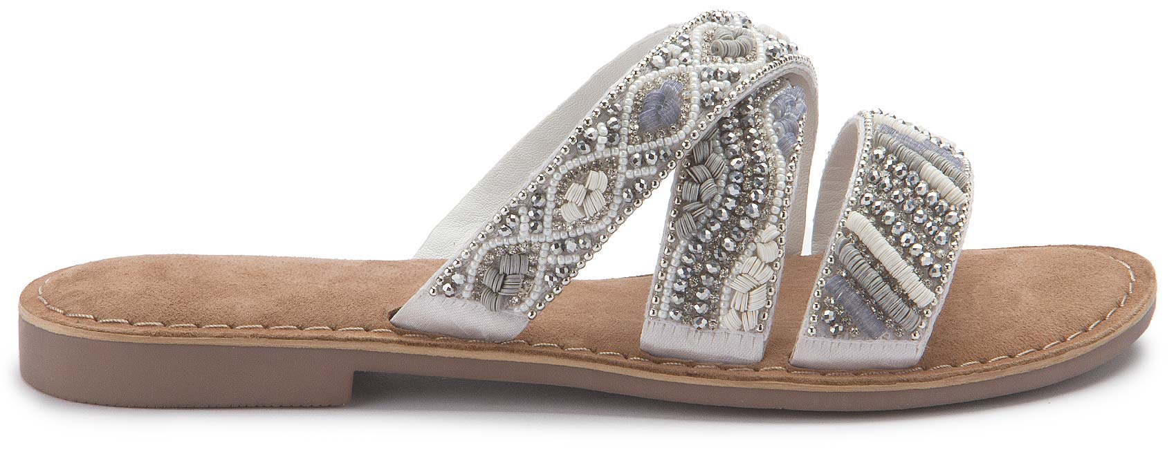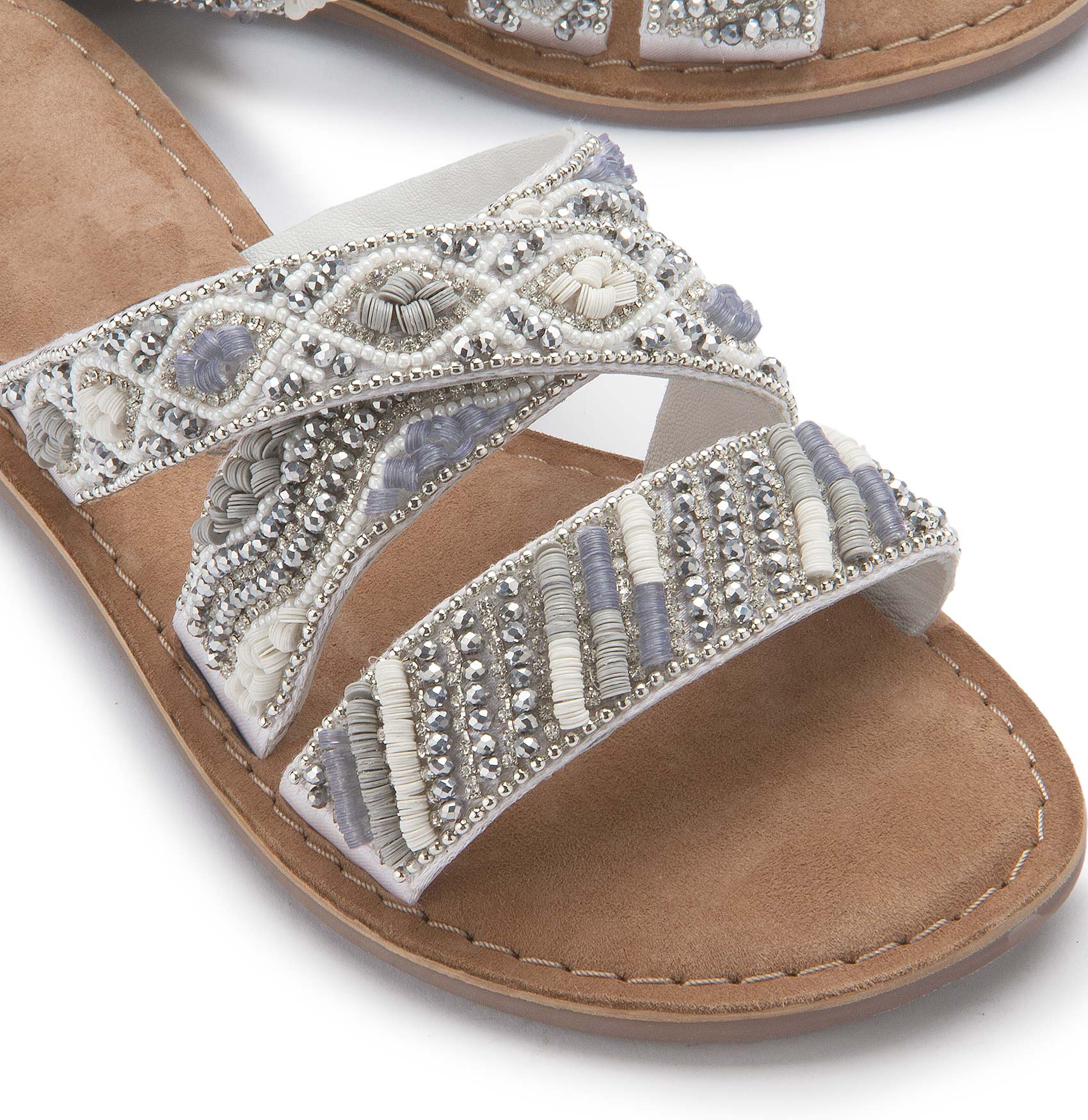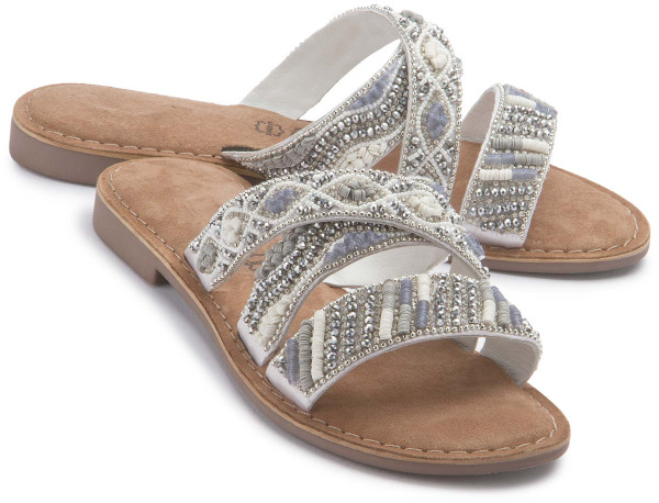 Die Pantolette, ein Schuh mit offener Spitze und flachem Absatz, ist ein beliebter und bequemer Schuh für den Sommer. Doch diese neue Pantolette ist nicht nur bequem, sondern auch ein echter Blickfang. Besetzt mit edlen Steinchen auf dem Riemen, verleiht sie jedem Outfit einen Hauch von Eleganz und Glamour. Die Steinchen, sorgfältig ausgewählt und kunstvoll arrangiert, funkeln im Licht und lassen die Schuhe erstrahlen.