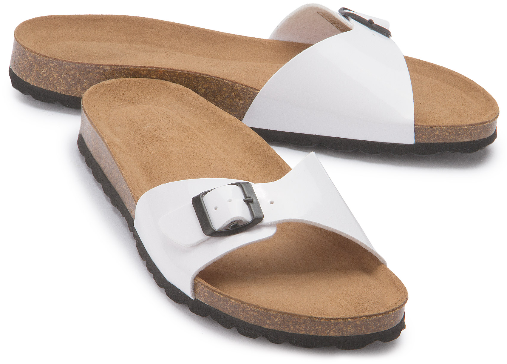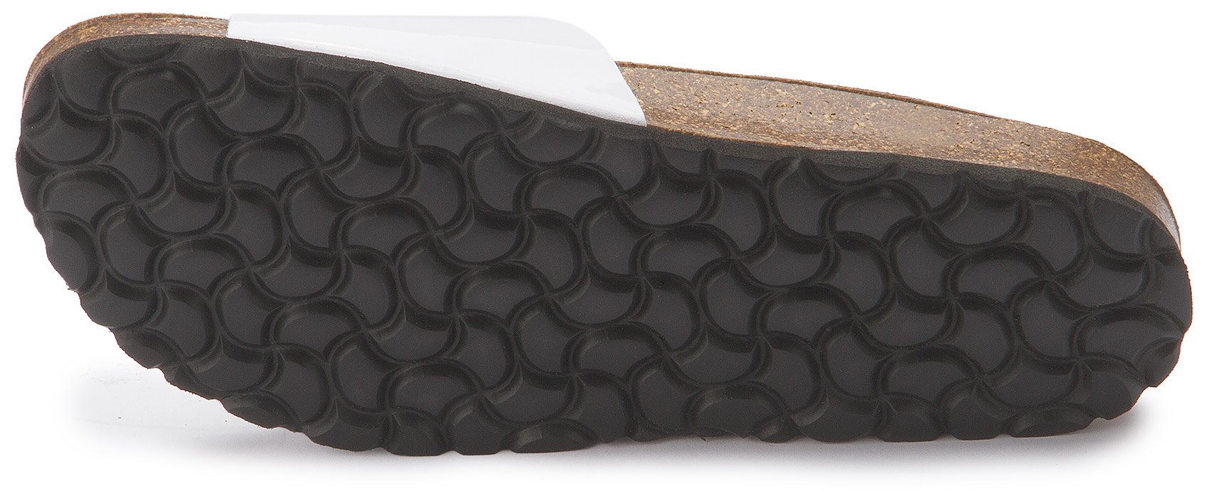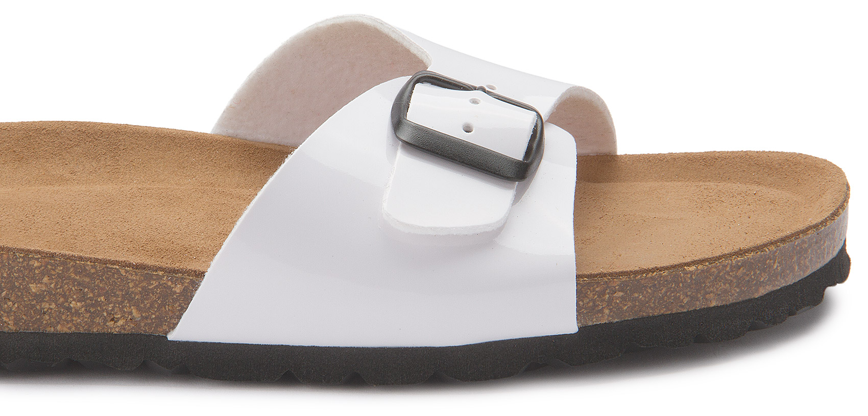 Der Bariello Damen-Pantolette vereint Komfort und Stil in einem modernen Design. Das weiß, glänzende Riemchen mit verstellbarer Schnalle sorgt für sicheren Halt, während das ergonomisch geformte Fußbett aus Kork und Leder angenehmen Tragekomfort bietet – perfekt für warme Tage und entspannte Momente.