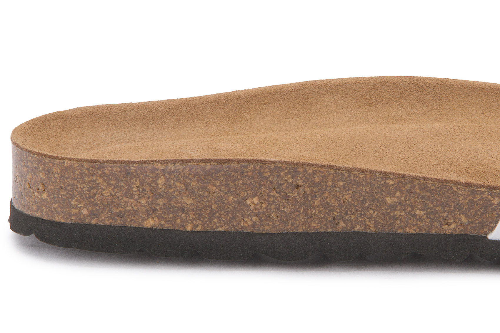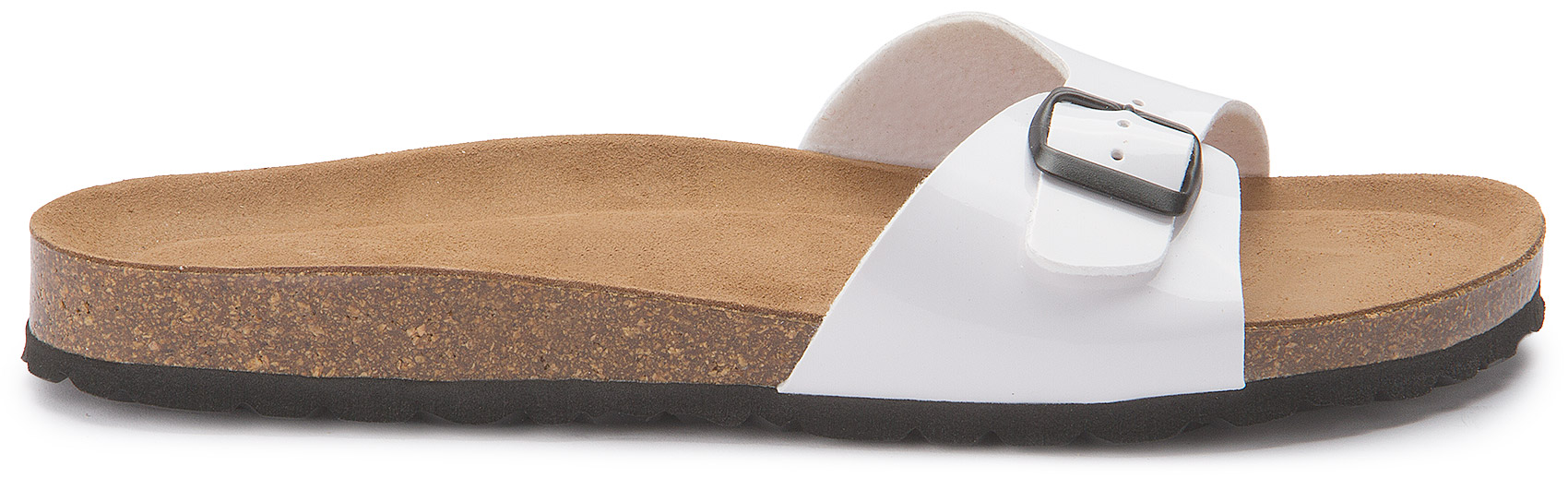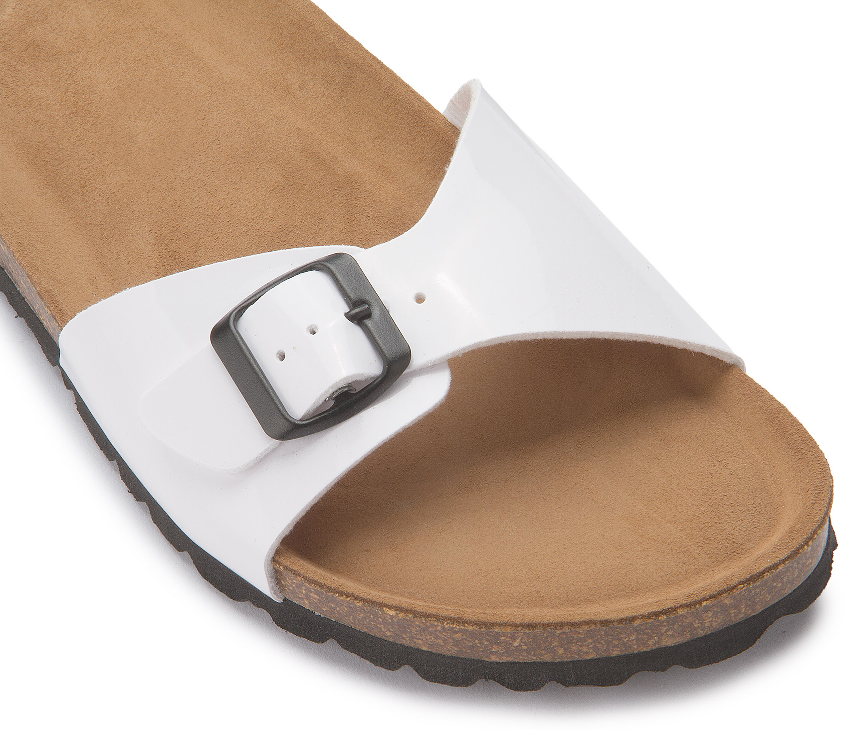Der Bariello Damen-Pantolette vereint Komfort und Stil in einem modernen Design. Das weiß, glänzende Riemchen mit verstellbarer Schnalle sorgt für sicheren Halt, während das ergonomisch geformte Fußbett aus Kork und Leder angenehmen Tragekomfort bietet – perfekt für warme Tage und entspannte Momente.