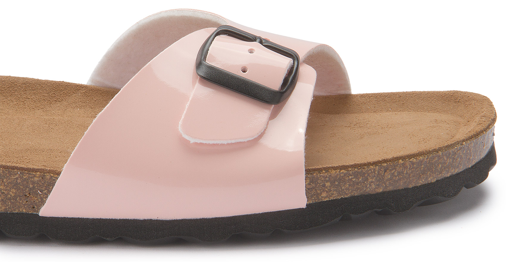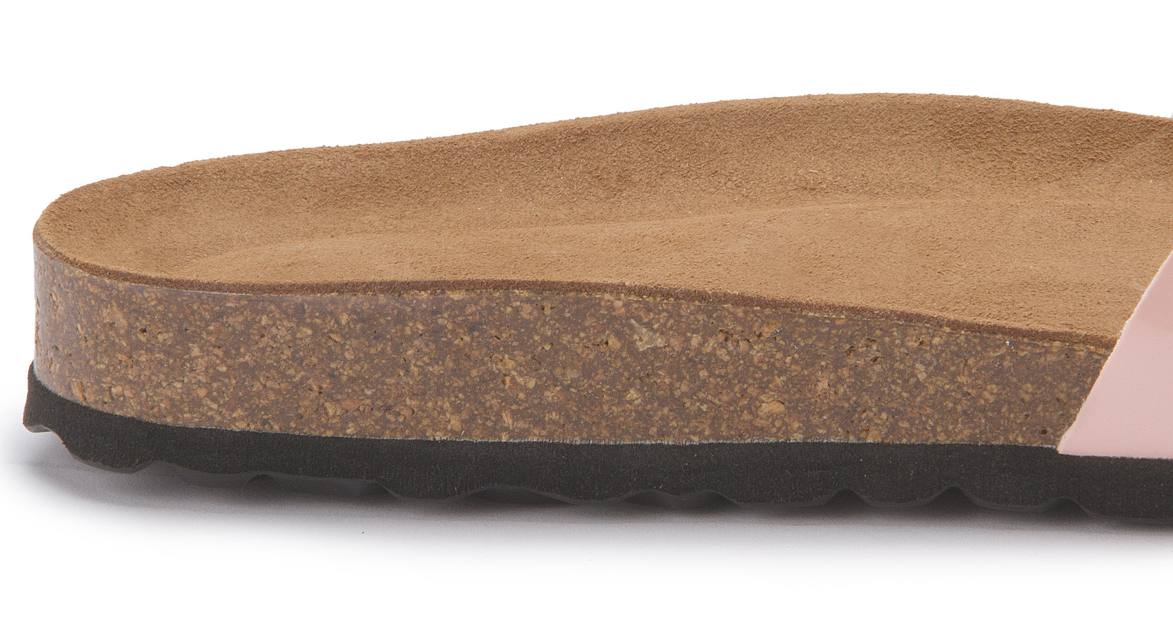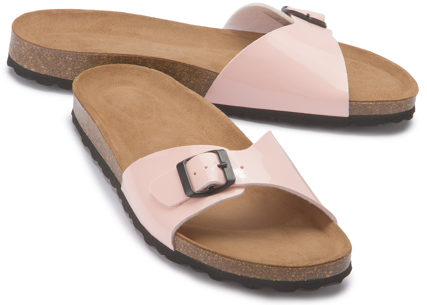 Der Bariello Damen-Pantolette vereint Komfort und Stil in einem modernen Design. Das rosane, glänzende Riemchen mit verstellbarer Schnalle sorgt für sicheren Halt, während das ergonomisch geformte Fußbett aus Kork und Leder angenehmen Tragekomfort bietet – perfekt für warme Tage und entspannte Momente.