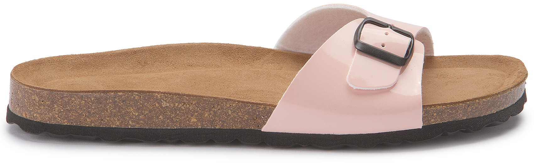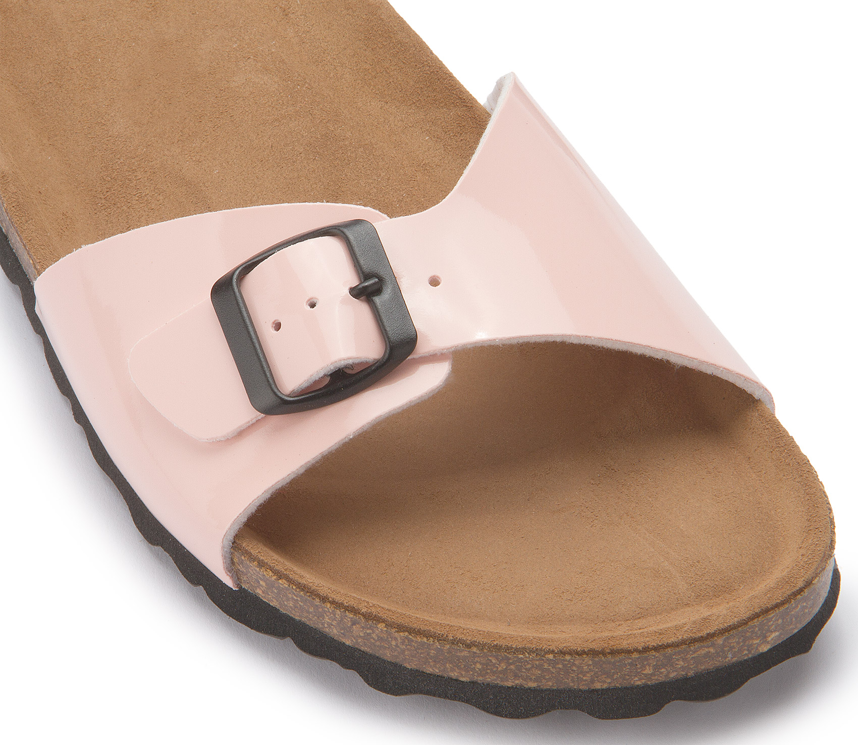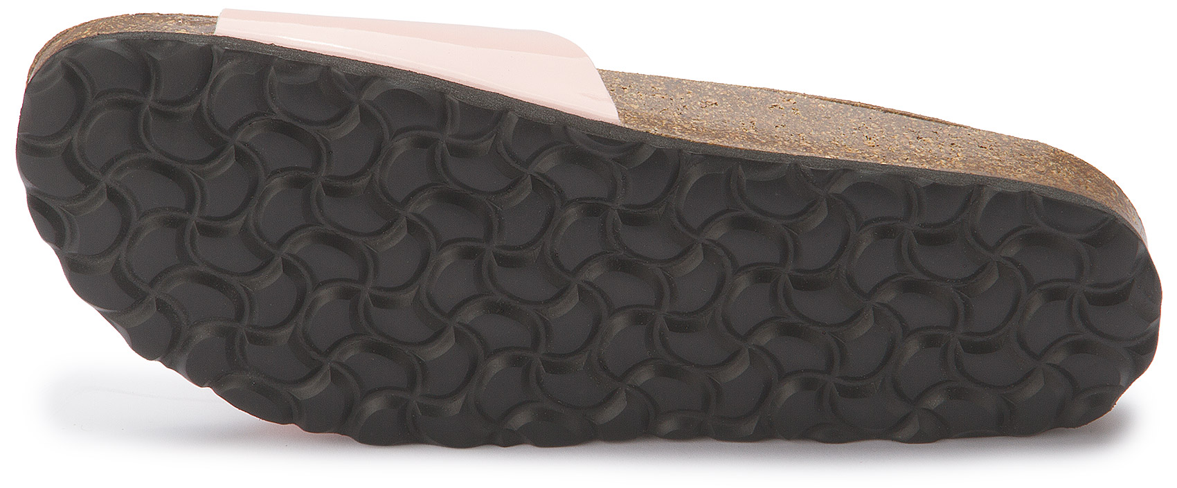 Der Bariello Damen-Pantolette vereint Komfort und Stil in einem modernen Design. Das rosane, glänzende Riemchen mit verstellbarer Schnalle sorgt für sicheren Halt, während das ergonomisch geformte Fußbett aus Kork und Leder angenehmen Tragekomfort bietet – perfekt für warme Tage und entspannte Momente.