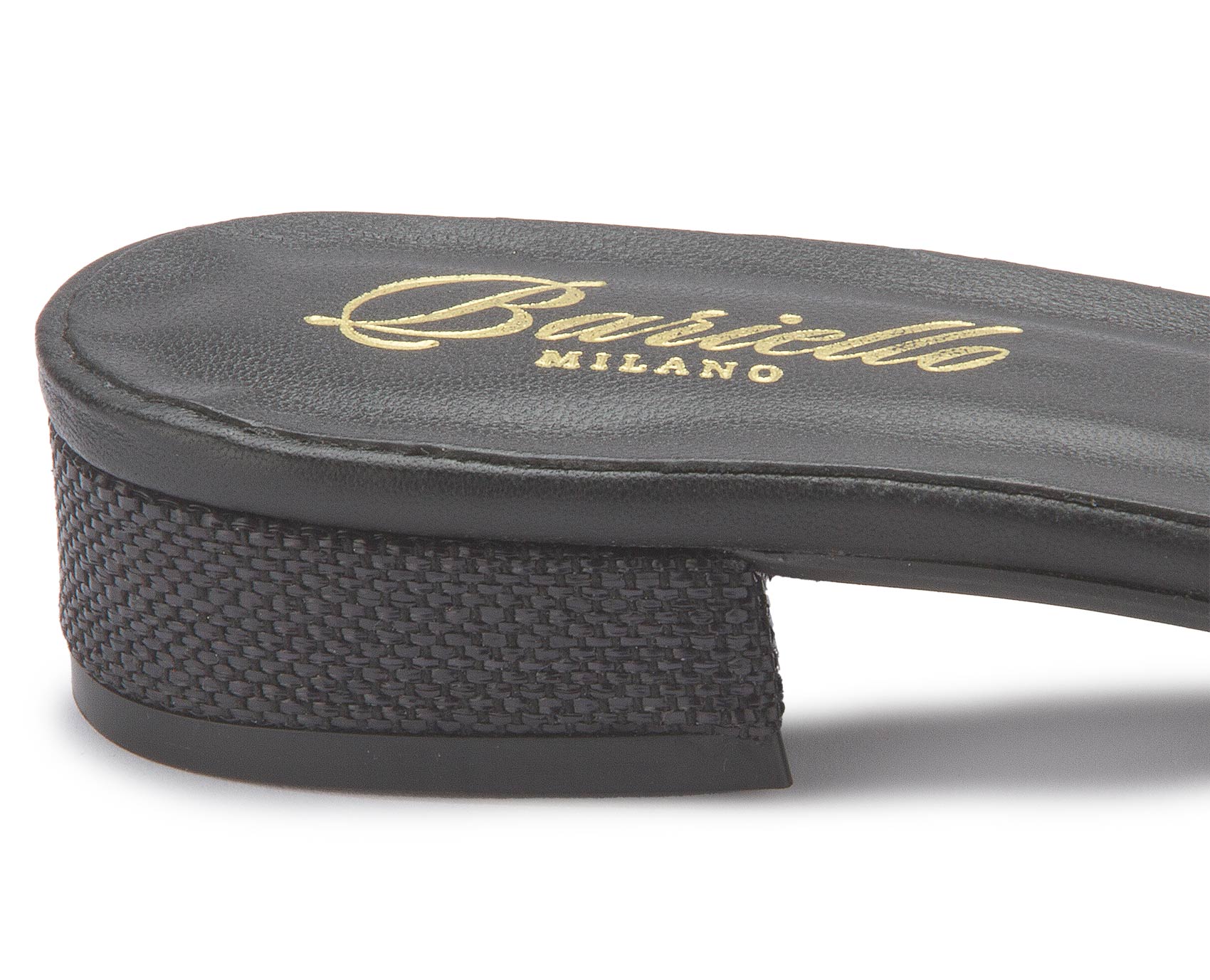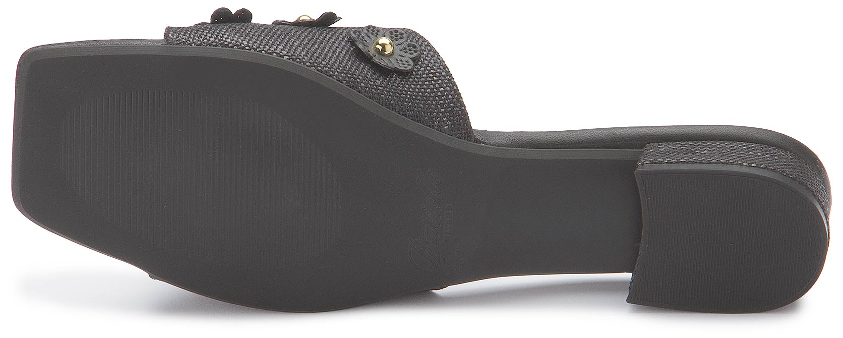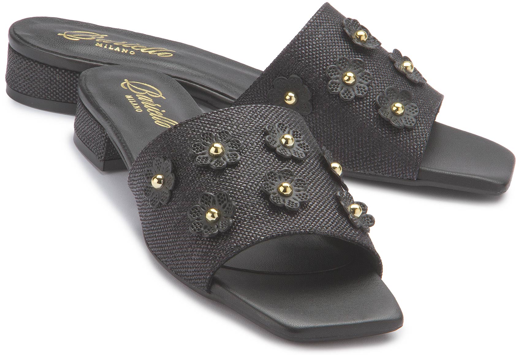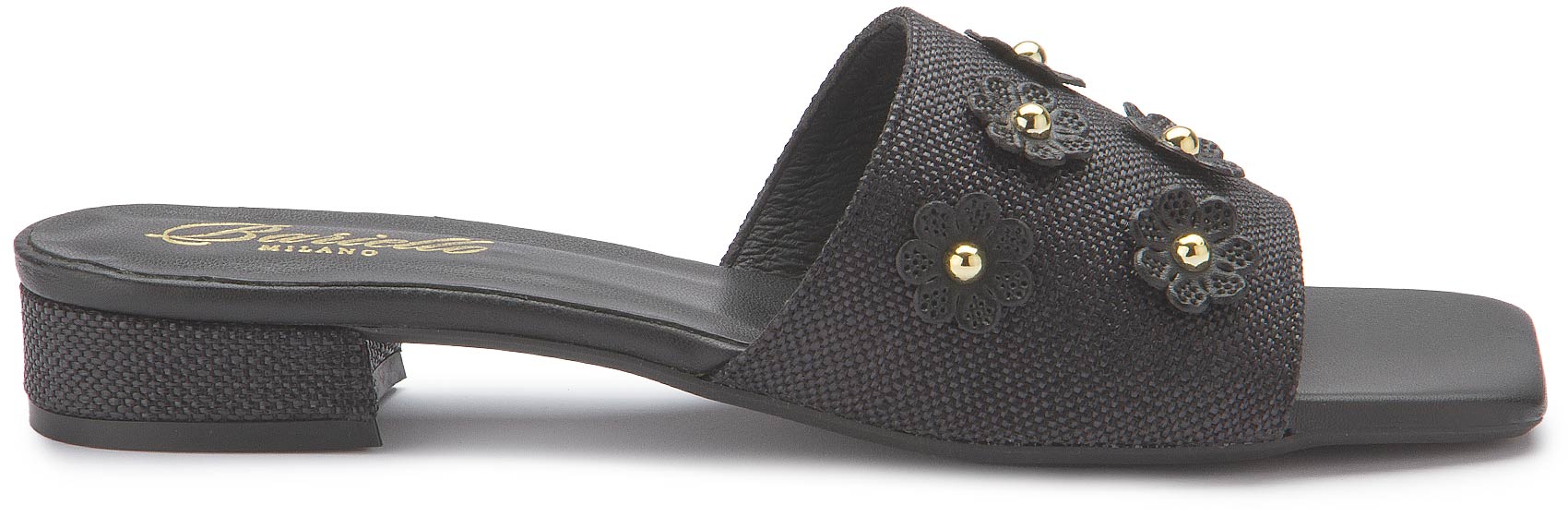 Wunderschöne Pantolette von Bariello aus hochwertigem Bast in Schwarz. Das Lederinnenfutter und die gepolsterte Lederinnensohle sorgen für Komfort den ganzen Tag über. Zum Verlieben schön sind die kleinen applizierten Blumen und die Perlen in Gold. Ein absoluter Highlight-Schuh von Bariello!