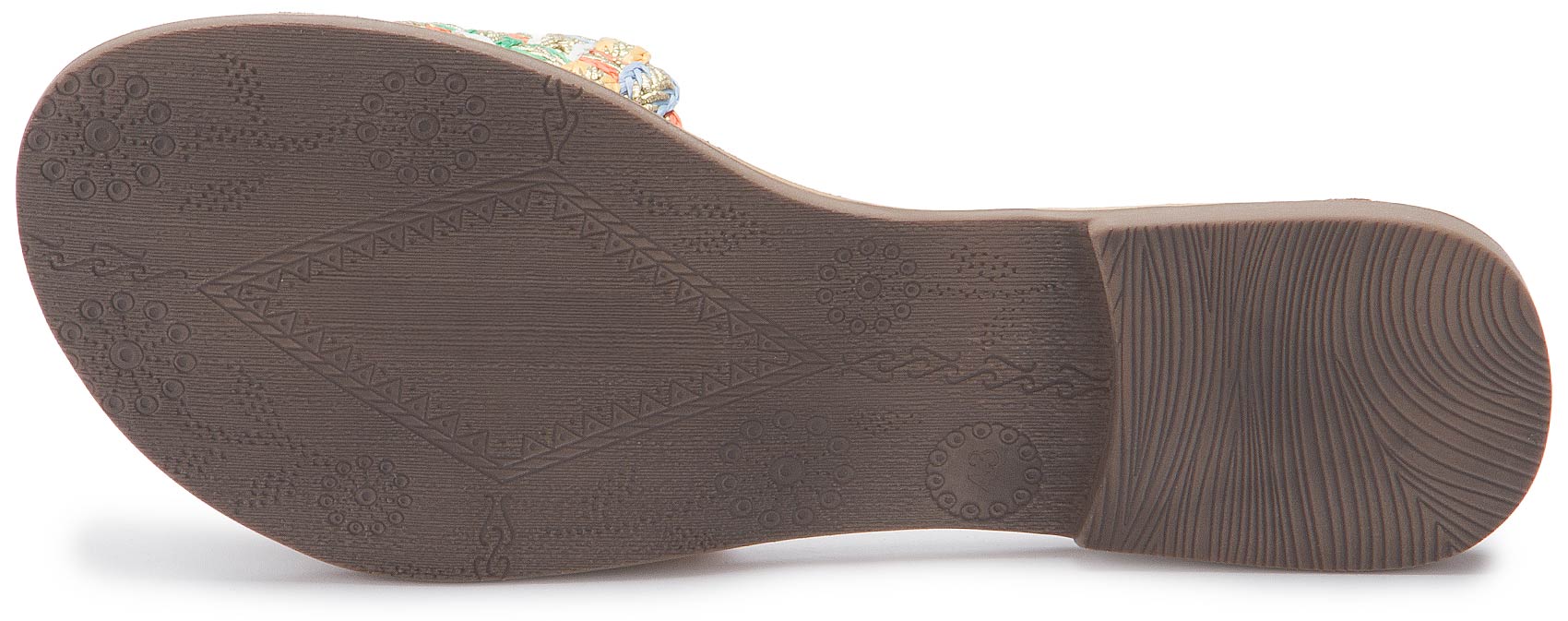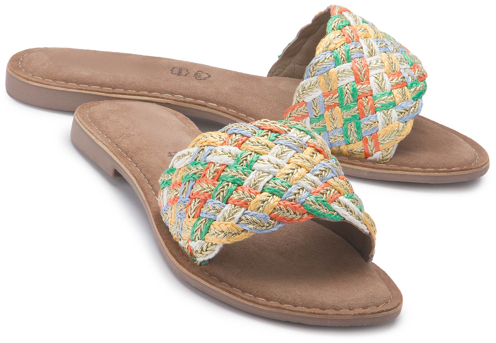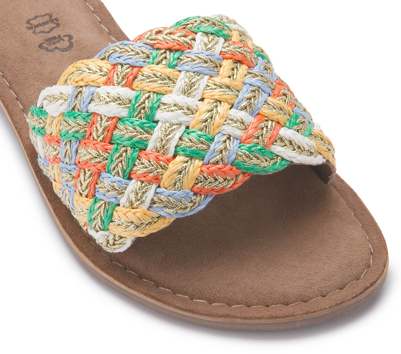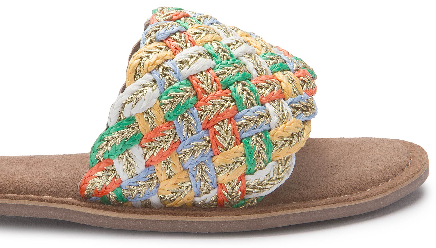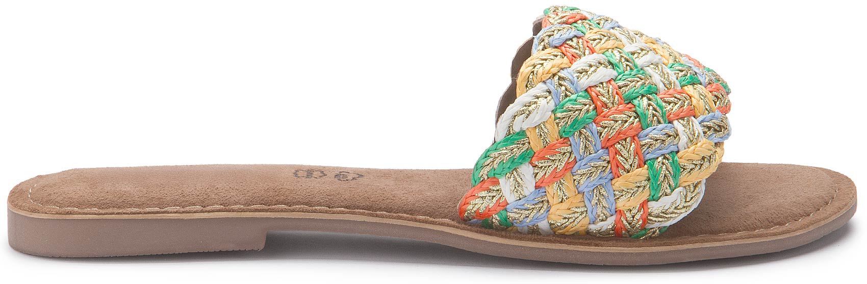Diese farbenfrohen Flecht-Pantoletten vereinen Komfort mit trendigem Design. Die kunstvoll geflochtenen Riemen in Pastelltönen und Metallic-Akzenten setzen ein modisches Statement, während die gepolsterte Innensohle für hohen Tragekomfort sorgt. Perfekt für Stadtbummel, Strandtage oder Sommerpartys!