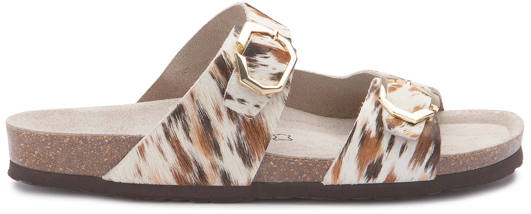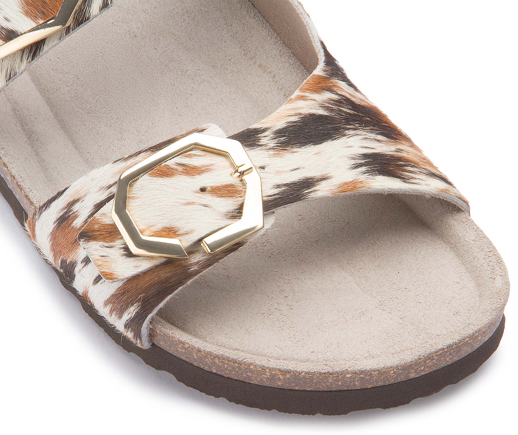 Die modischen Pantoletten überzeugen mit trendiger Felloptik und auffälliger Schnalle als stilvollem Blickfang. Das anatomisch geformte Fußbett sorgt für hohen Tragekomfort, während die flexible Sohle ein angenehmes Laufgefühl bietet. Perfekt für sommerliche Looks mit besonderem Akzent.