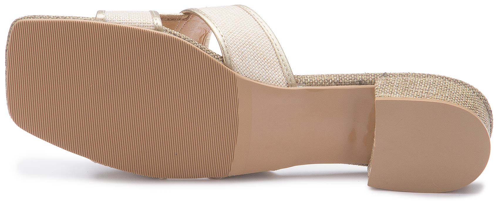 Diese stilvolle Pantolette von Miotti überzeugt mit ihrem natürlichen Look in warmen Beige- und Goldtönen sowie der hochwertigen, leicht strukturierten Oberfläche. Die breiten Riemen sorgen für optimalen Halt, während der bequeme Blockabsatz einen eleganten und gleichzeitig alltagstauglichen Auftritt garantiert. Perfekt für sommerliche Outfits – von casual bis chic.