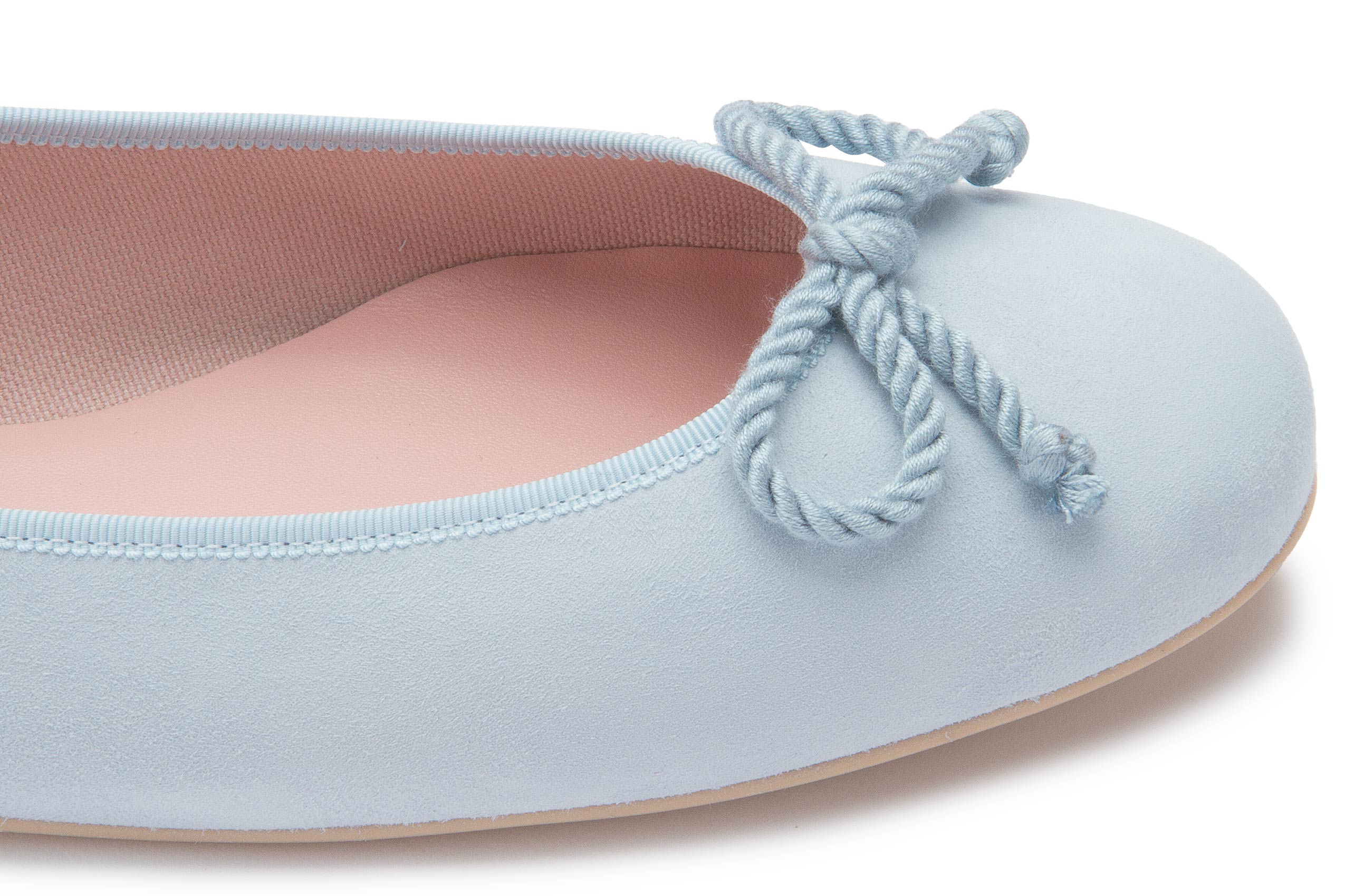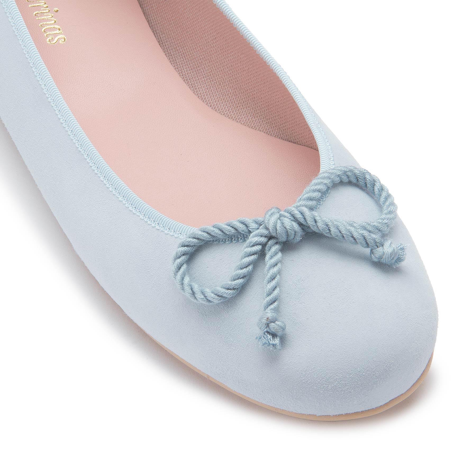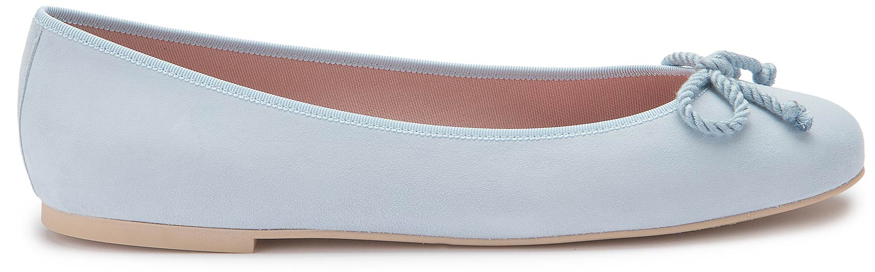Absolut fein und alltagstauglich zeigt sich dieser edle Ballerina des spanischen Labels Pretty Ballerinas aus weichem Nubukleder in Hellblau mit einer edlen Schleife auf der Vorderkappe.