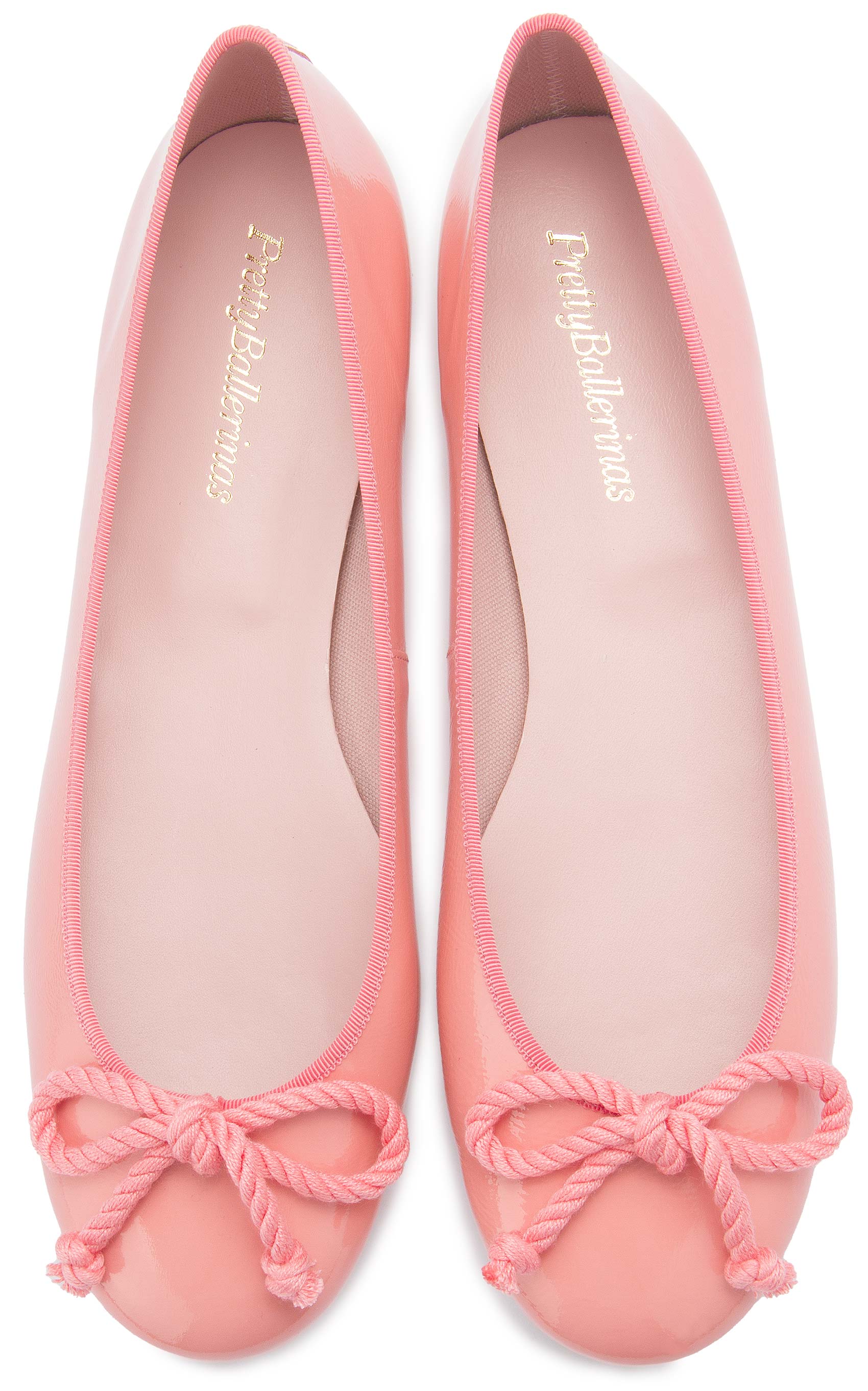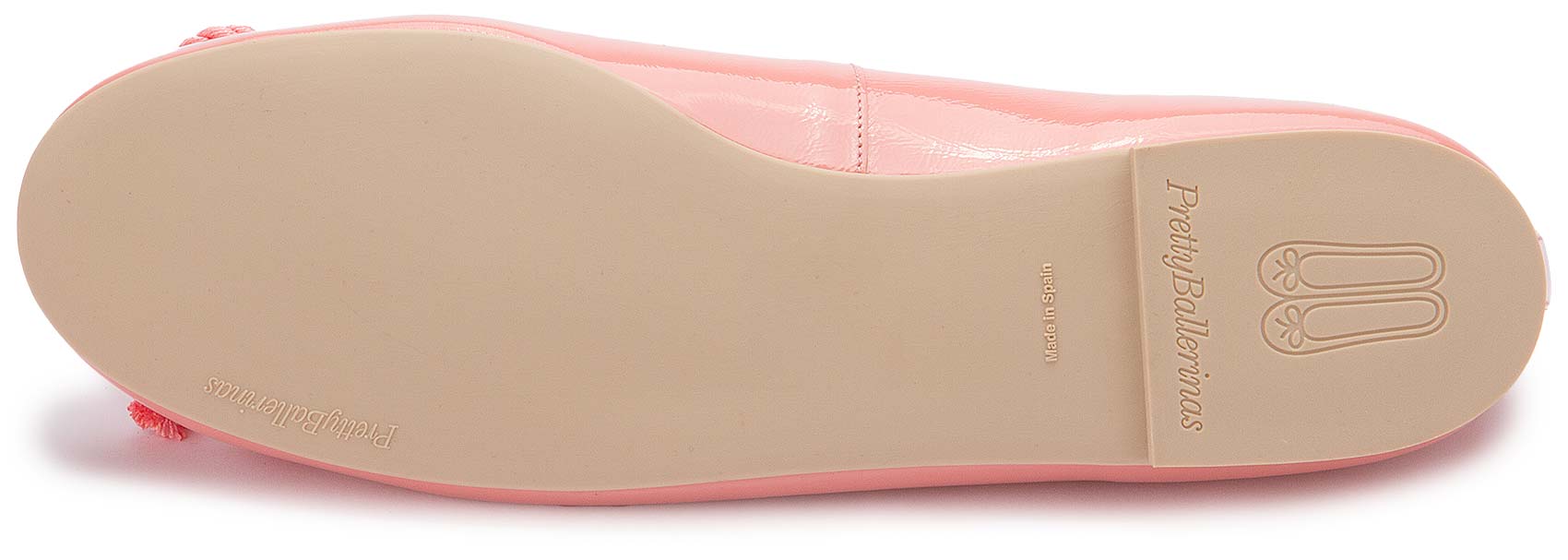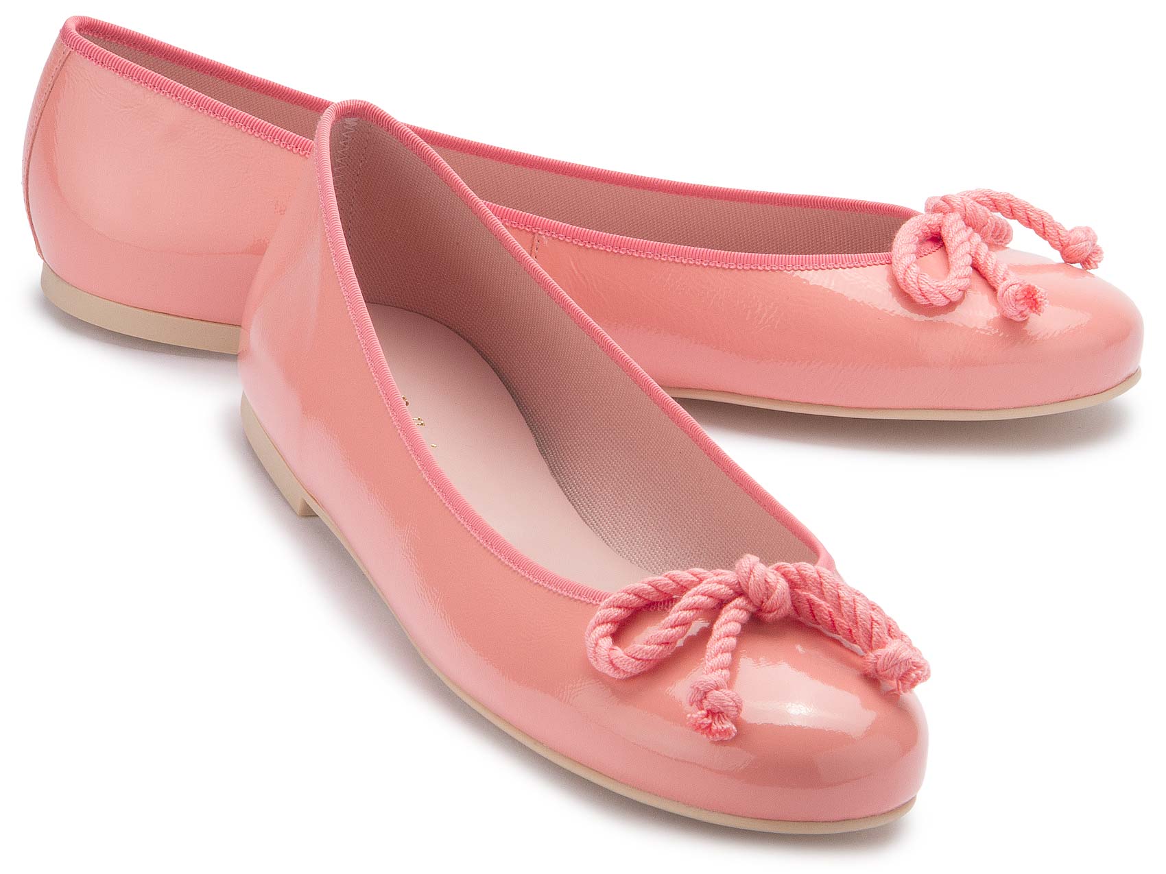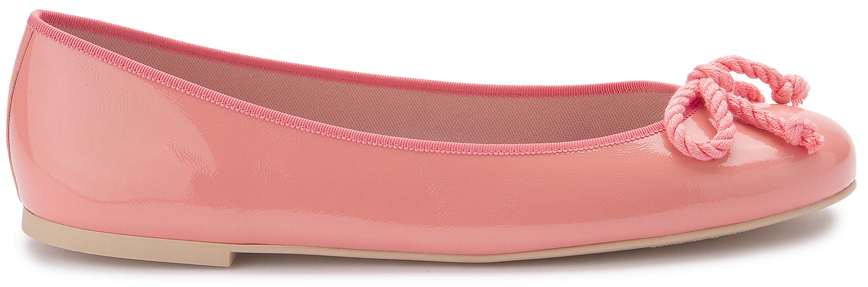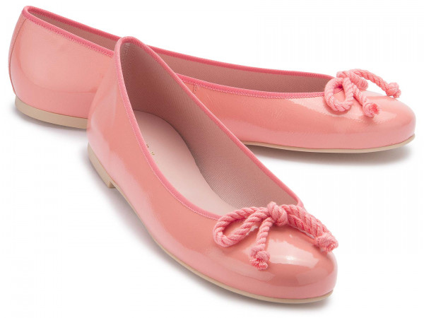 Glanzvoller Ballerina in rosa Lackleder mit einer wundervollen Kordelschleife. Fantastischer Laufkomfort, gute Passform, Textilfutter, ca. 10 mm Absatz, Gummisohle. Größen 43-45