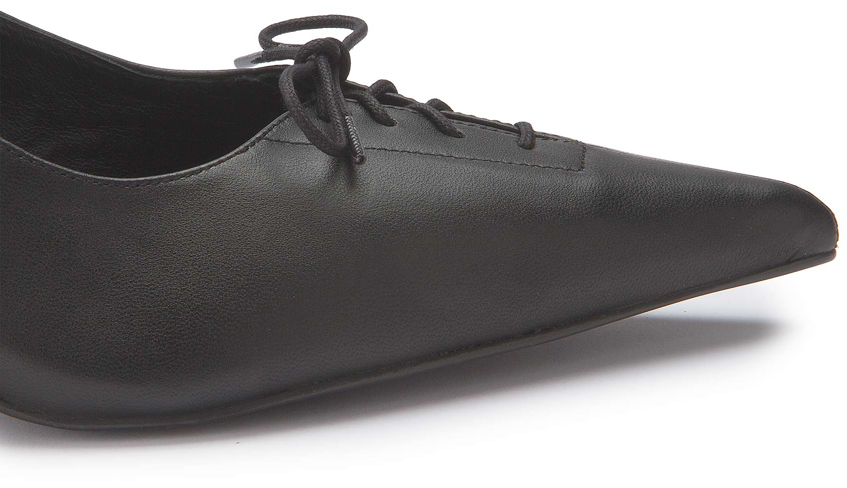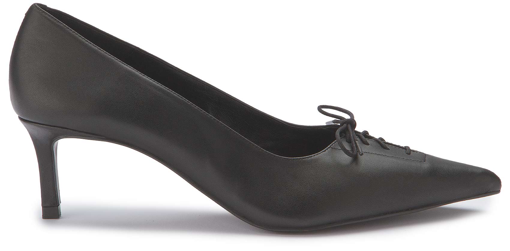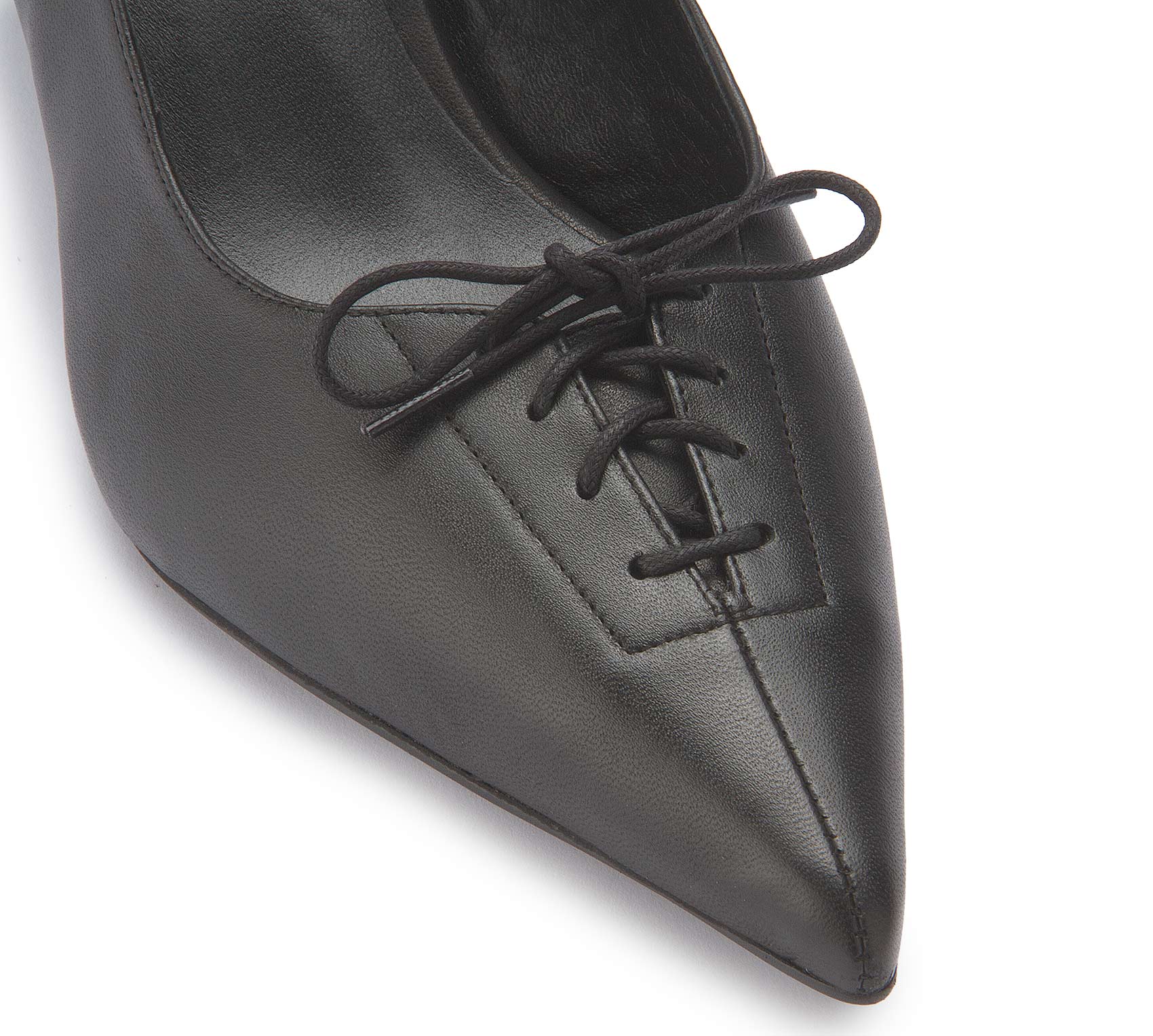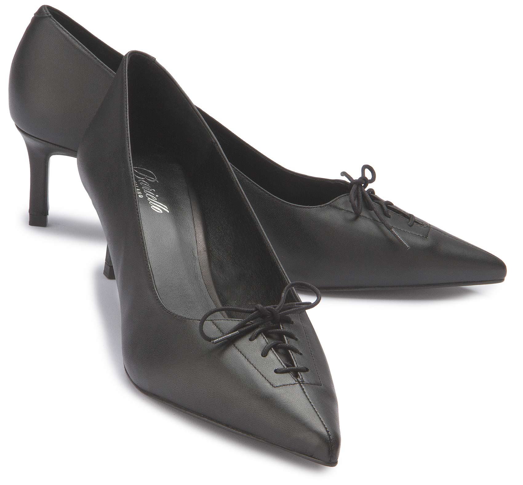 Dieser elegante Pumps von Bariello vereint klassische Raffinesse mit einem modernen Twist. Die feine Schnürung auf dem spitzen Leisten verleiht dem schlichten schwarzen Design eine subtile Extravaganz – perfekt für stilbewusste Auftritte im Alltag oder Büro.