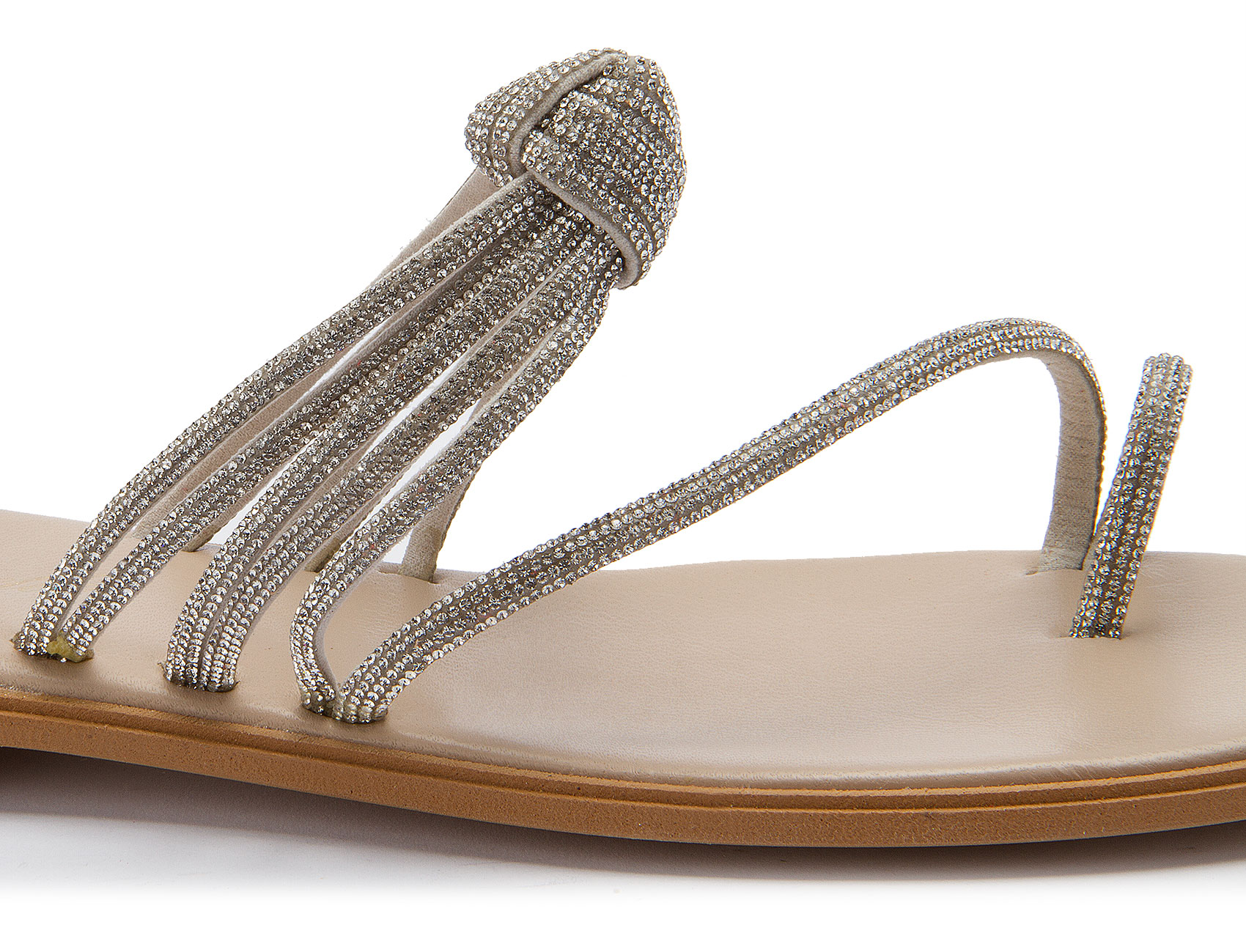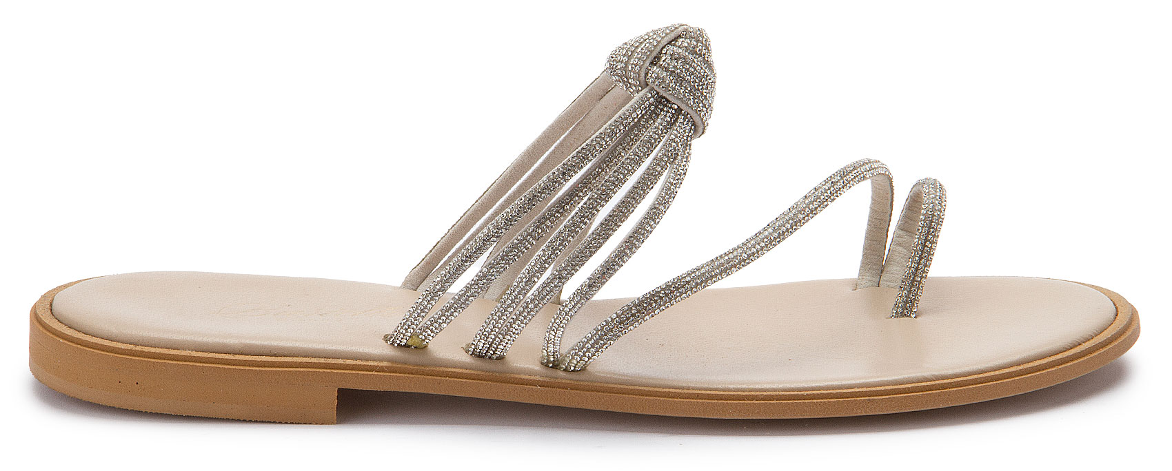 Die Sandale von Bariello in der Farbe Silber ist ein modisches Highlight für den Sommer. Das hochwertige Leder, welches mit kleinen Steinchen besetzt ist, verleiht der Sandale ein edles Aussehen. Die einzelnen Riemen sind teilweise als Knoten gestaltet und geben der Sandale einen verspielten Touch. Ob am Strand, auf einer Gartenparty oder beim Stadtbummel - mit dieser Sandale macht man immer eine gute Figur.