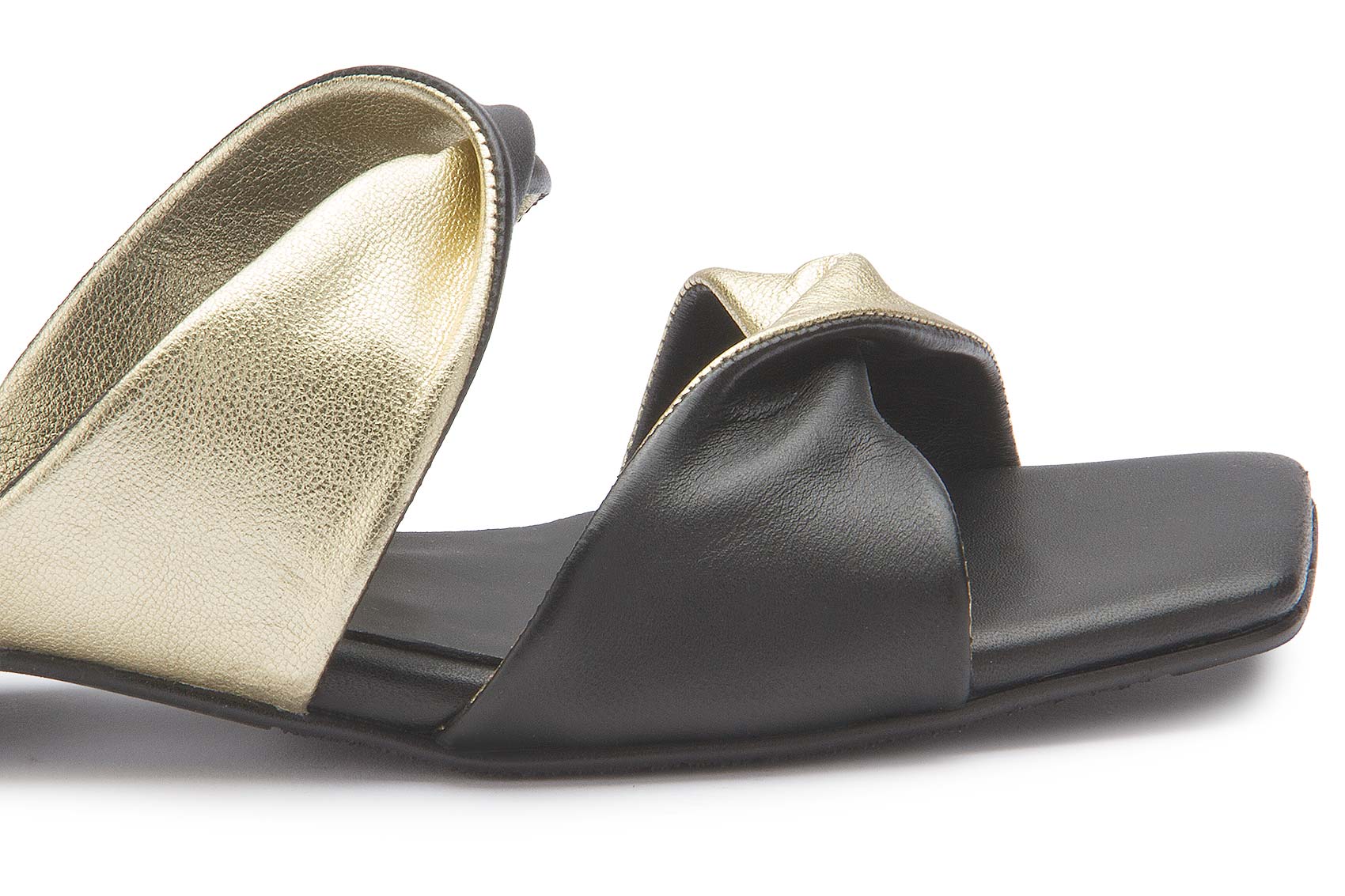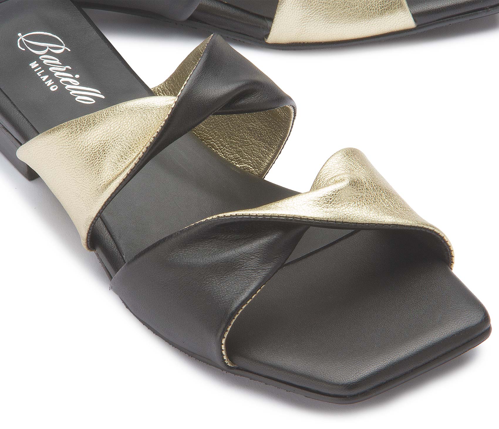 Diese Sandale von Bariello Milano überzeugt mit einem modernen Design aus weich fallenden, überkreuzten Riemen in harmonischen Farbkontrasten. Die Kombination aus eleganten Schwarz und schimmerndem Gold verleiht dem Schuh eine elegante Ausstrahlung. Die flache Sohle sorgt für angenehmen Tragekomfort und macht ihn zum idealen Begleiter für stilvolle Sommer-Looks.