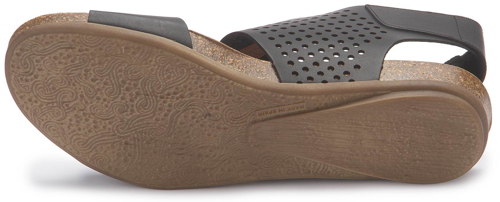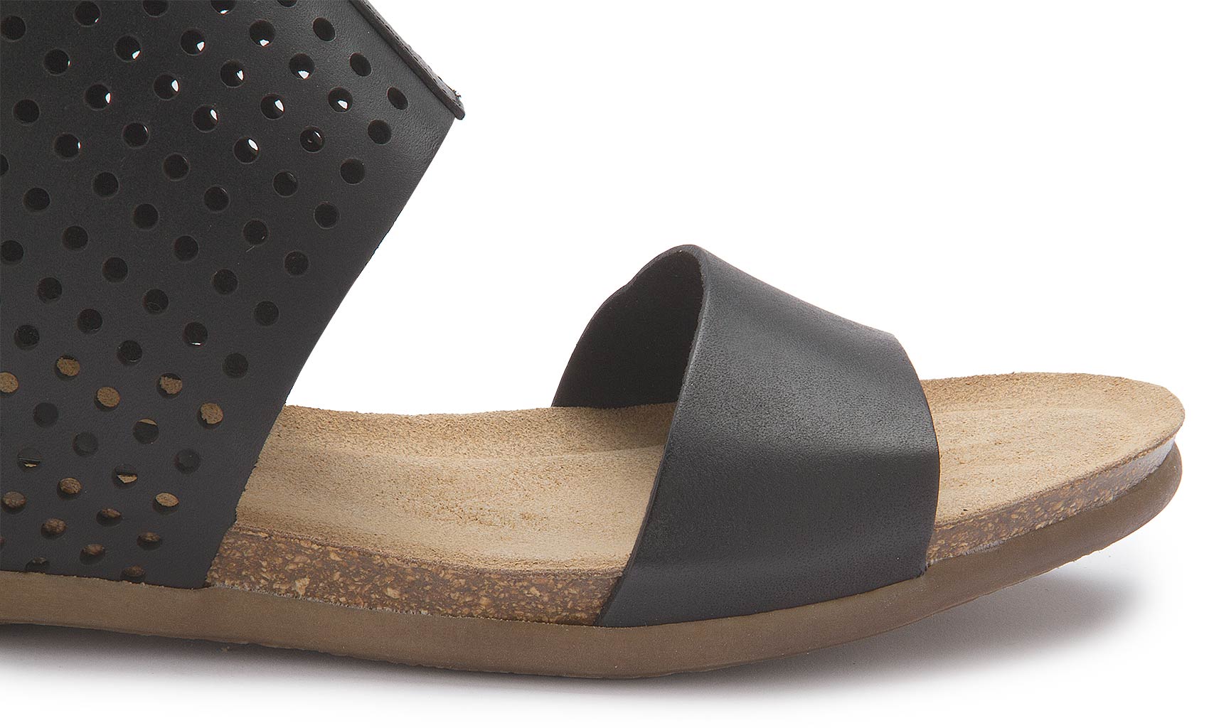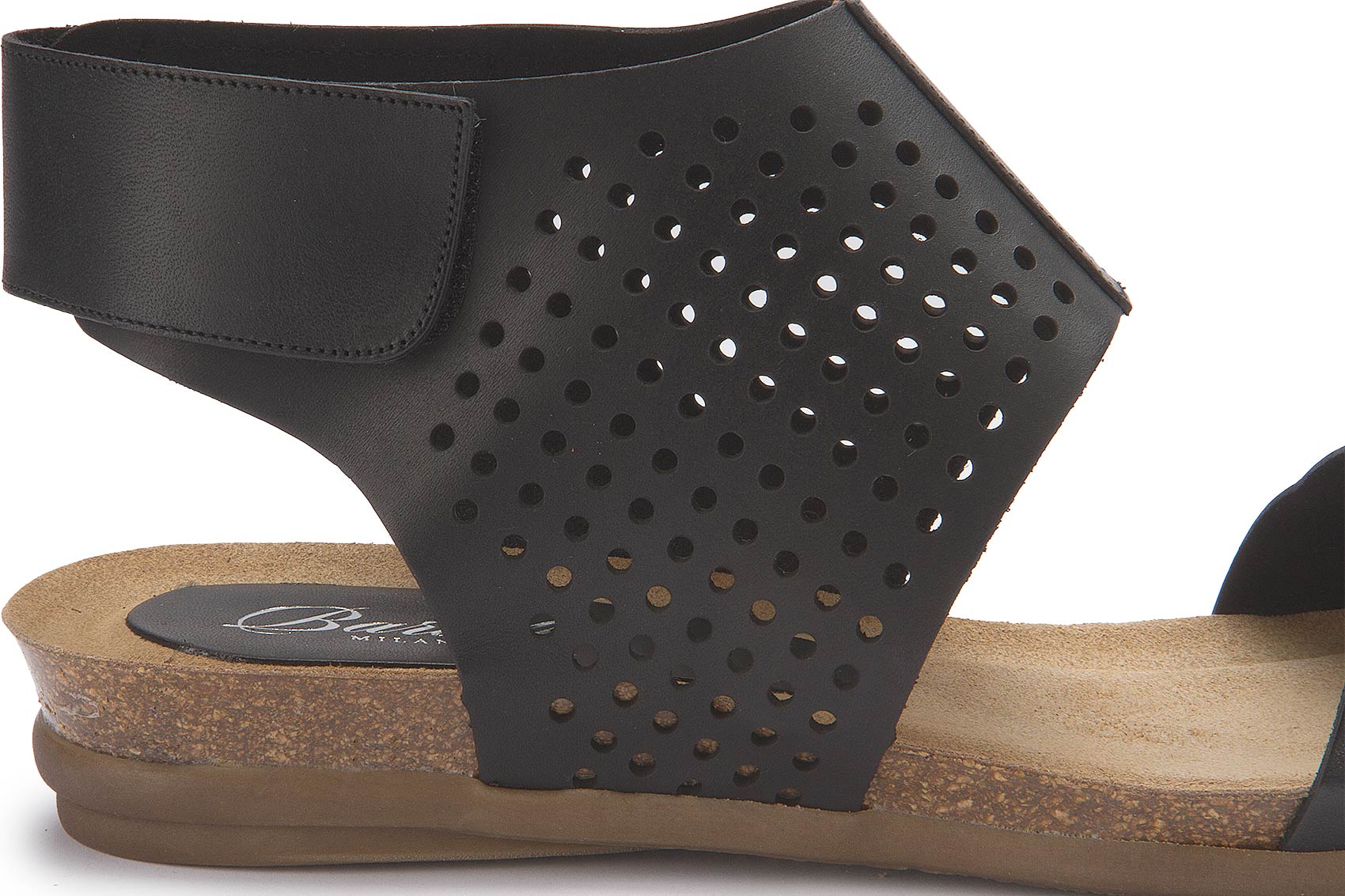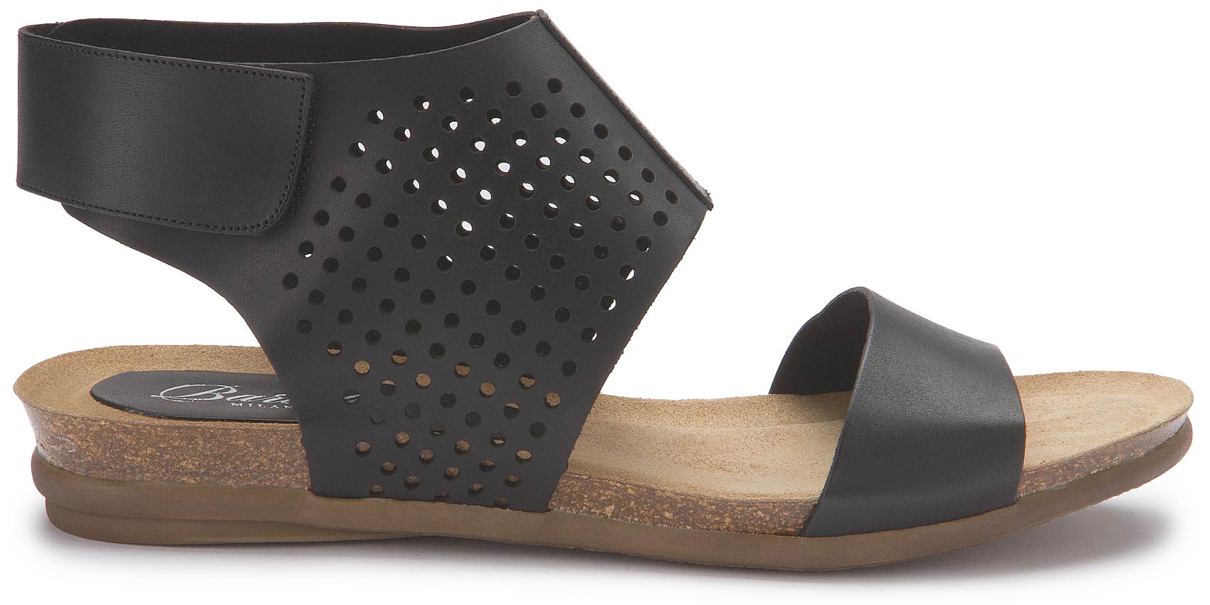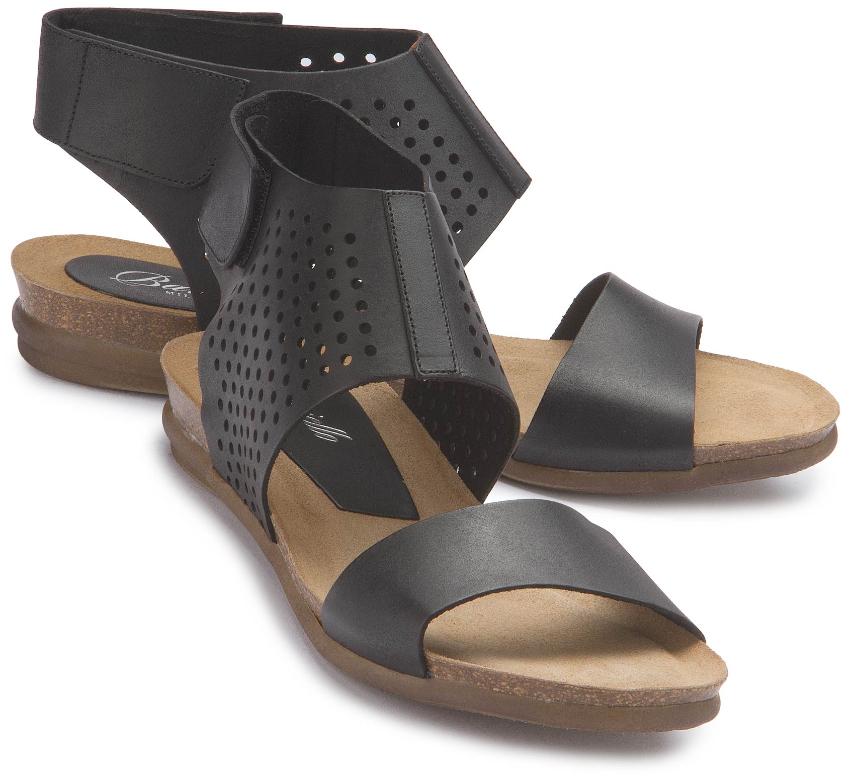Raffinierte Sandale von Bariello in sattem Schwarz. Der breite Fesselriemen gibt nicht nur Halt, er sieht durch das perforierte Leder auch stylisch aus. Zugemacht wird er durch einen versteckten Klettverschluss. Das Tieffußbett sorgt für einen bequemen Gang. Ein Schuh zum Verlieben!