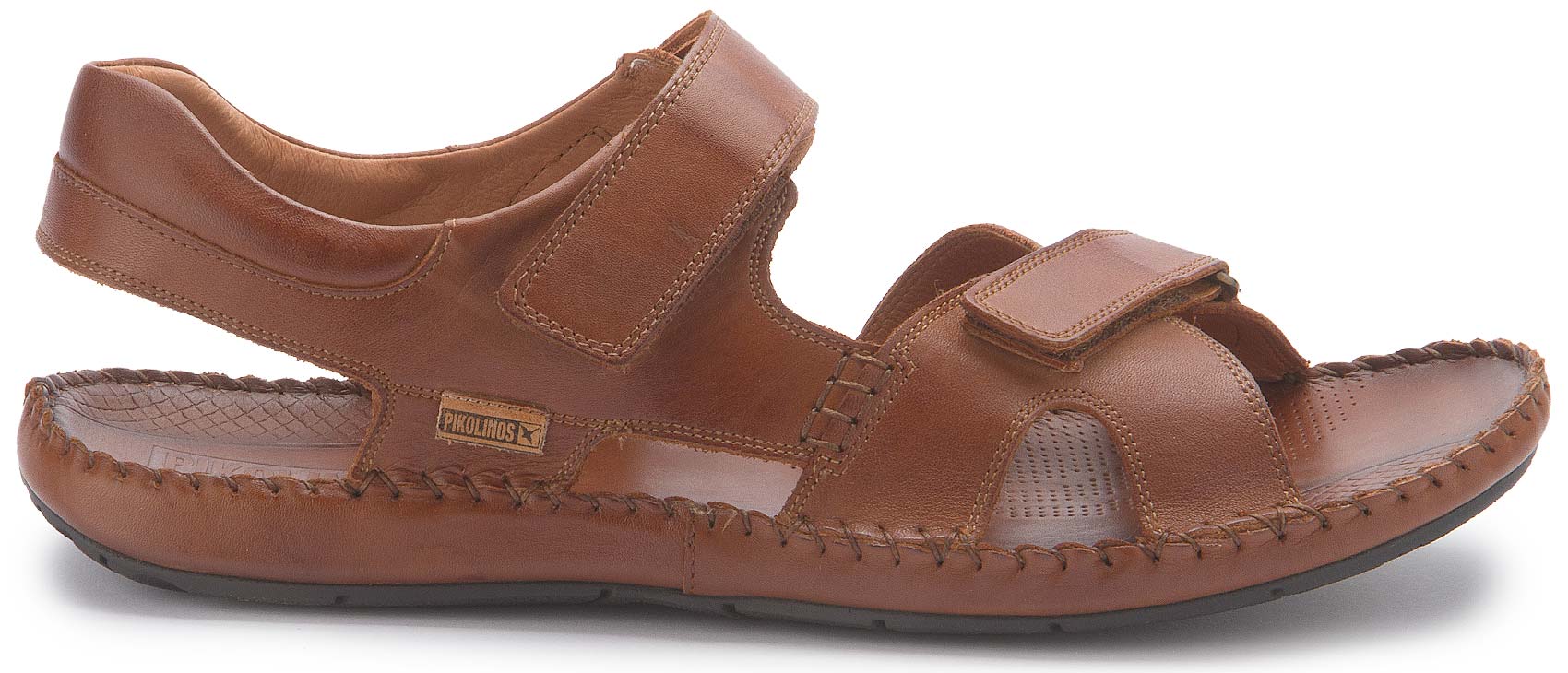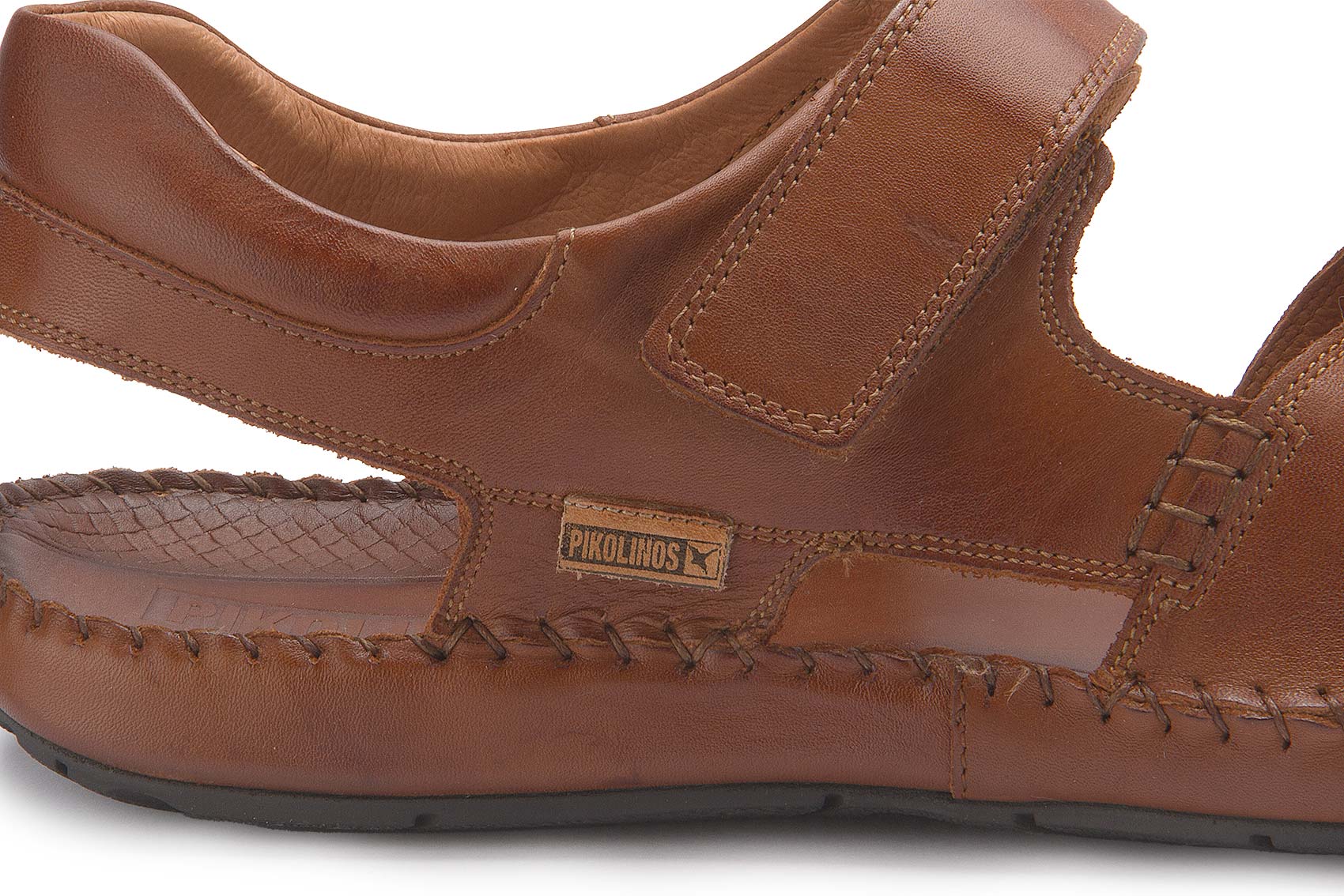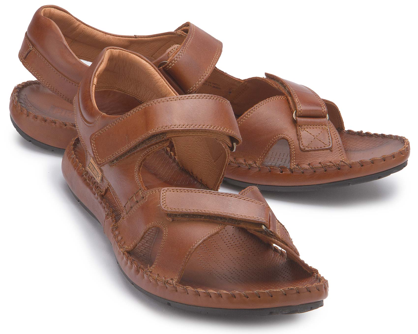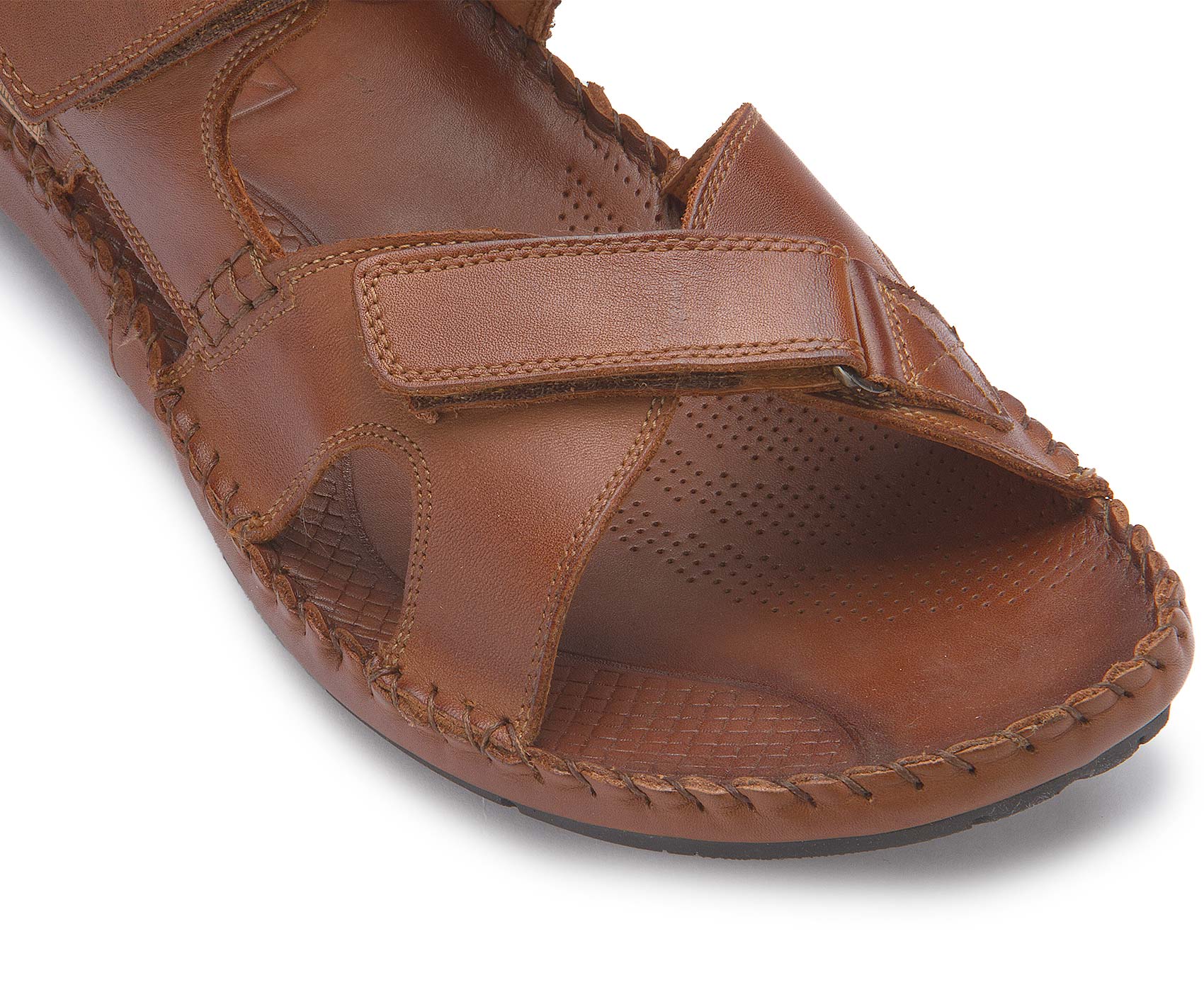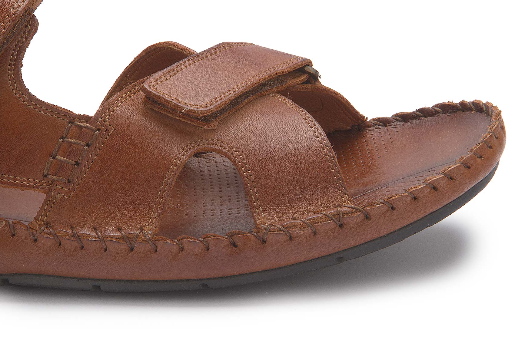 Hier präsentiert sich eine tolle Sandale mit Klettverschluss zum einfachen An-und Ausziehen. Dieses Ledermodell mit handgesteppten Nähten und Klettverschluss passt sich perfekt dem Fuß an.