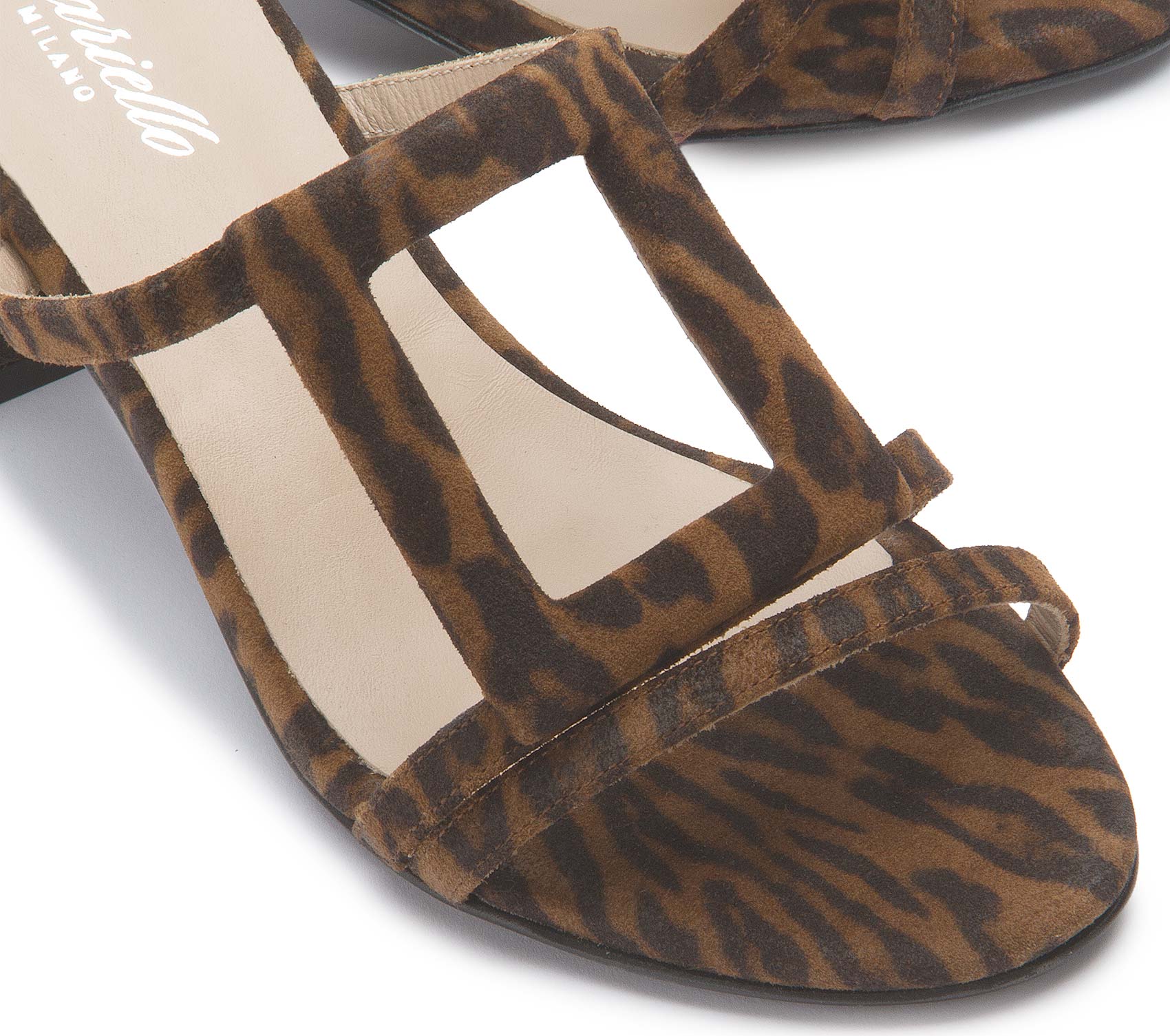 Die Sandalette von Bariello Milano setzt mit ihrem ausdrucksstarken Animal-Print und dem markanten Riemendesign ein modisches Statement. Der stabile Absatz sorgt für angenehmen Tragekomfort, während die offenen Riemen dem Schuh eine leichte, elegante Optik verleihen. Ein besonderer Begleiter für stilvolle Sommer-Looks.