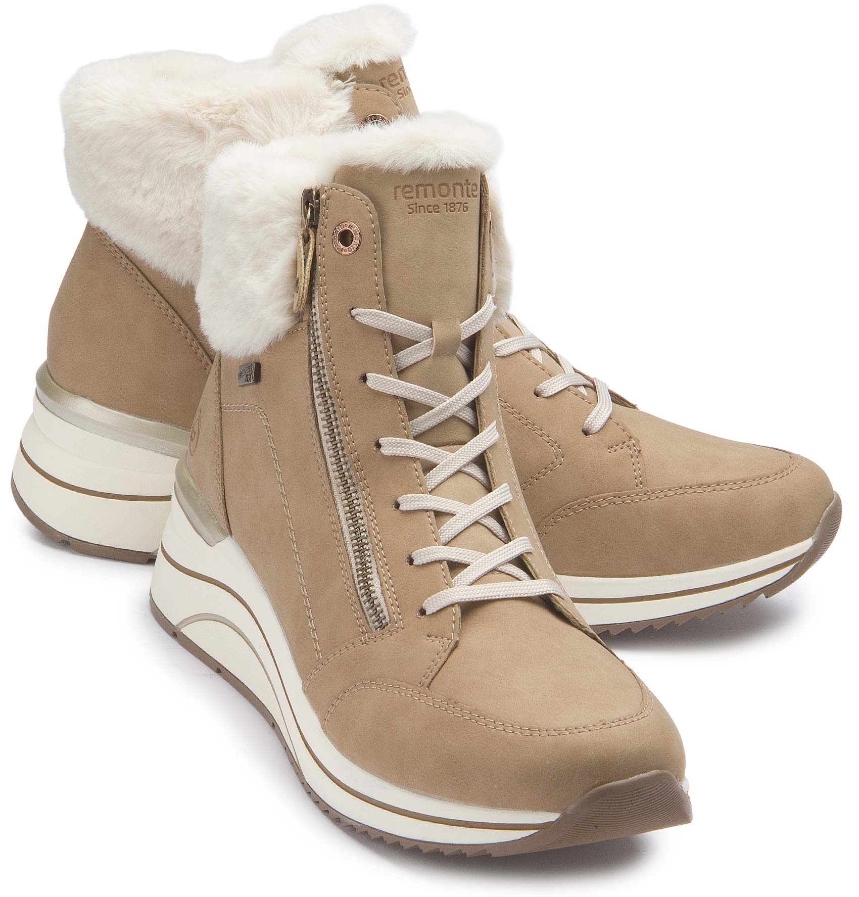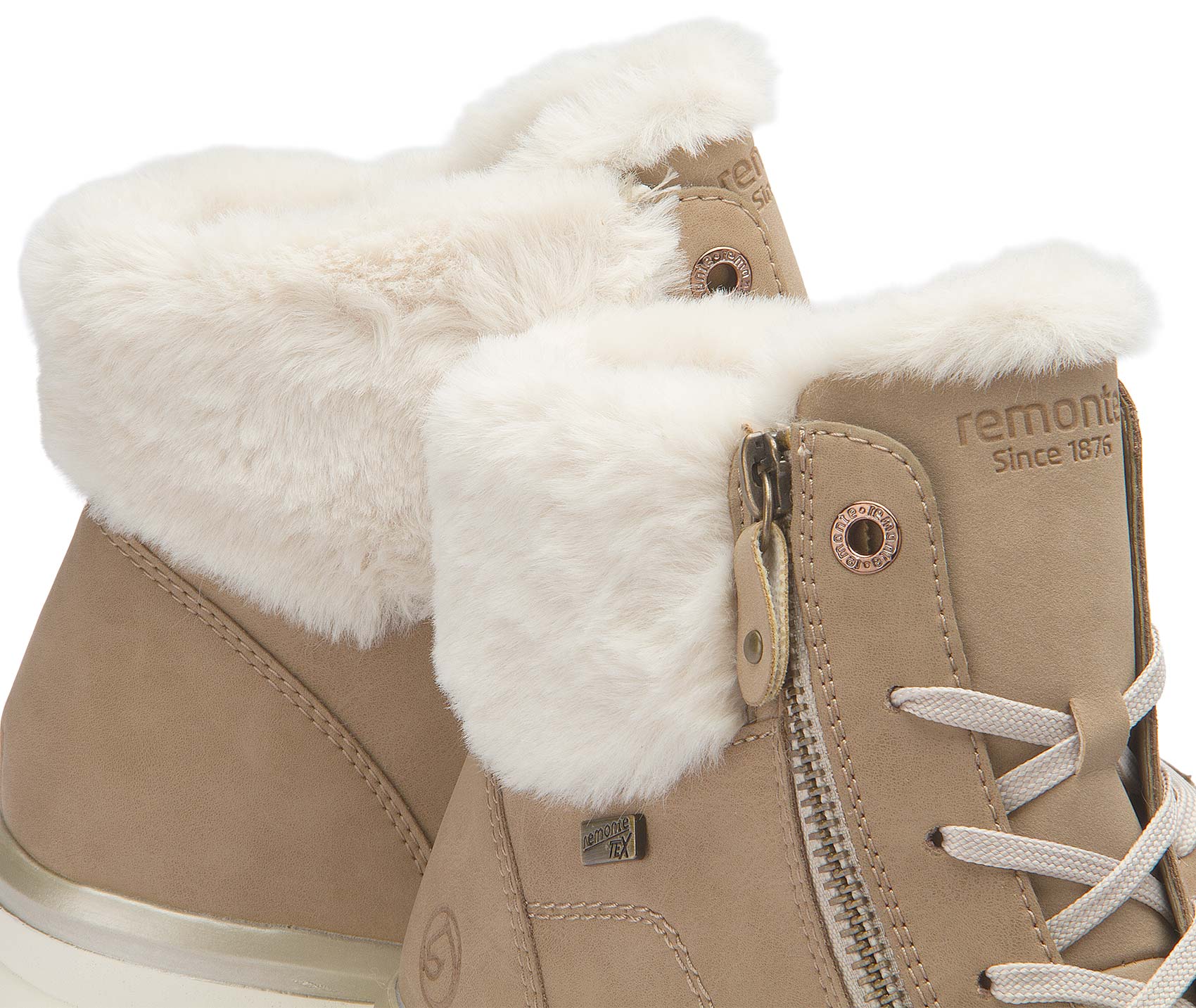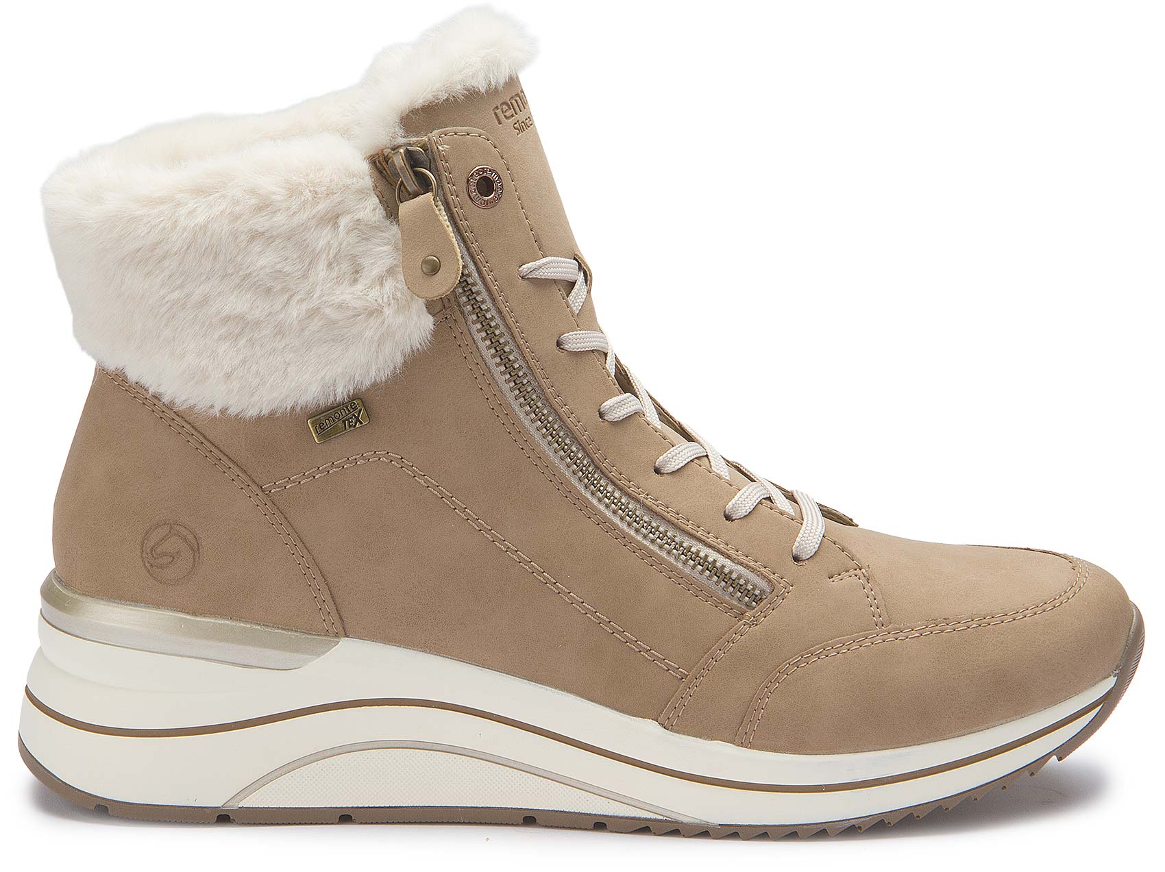 Wohlig warm und kuschelig weich! Mit diesen braunbeigen remonte Schnürstiefeln für Damen aus Rauleder ist coolster Style und maximaler Komfort auf Schritt und Tritt garantiert. Eine Schnürung ergänzt den Reißverschluss und sorgt für Funktionalität und Komfort. Der Fellkragen am Schaft setzt das Design modisch in Szene. Die Lite 'n Soft Technologie ermöglicht die Kombination aus leichter Laufsohle und gepolsterter und herausnehmbarer Einlegesohle. Durch die Extraweite ist den Zehen mehr Bewegungsfreiheit geboten. Das sehr warme und kuschelige Schurwoll-Futter hält die Füße garantiert den ganzen Tag lang warm und dank der remonteTEX-Technologie bleiben sie auch trocken! Mehr Style geht nicht!