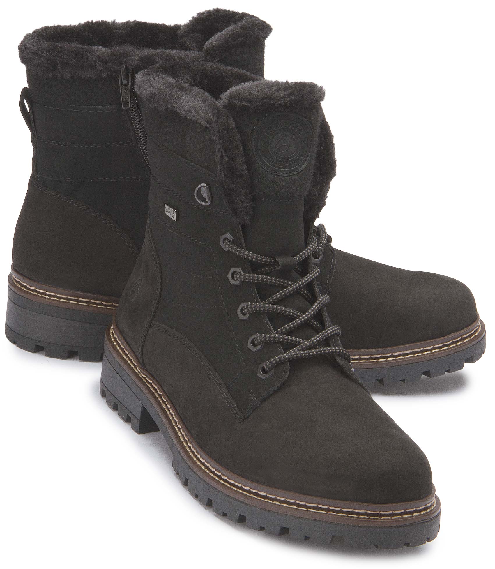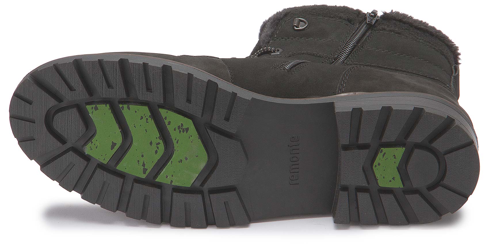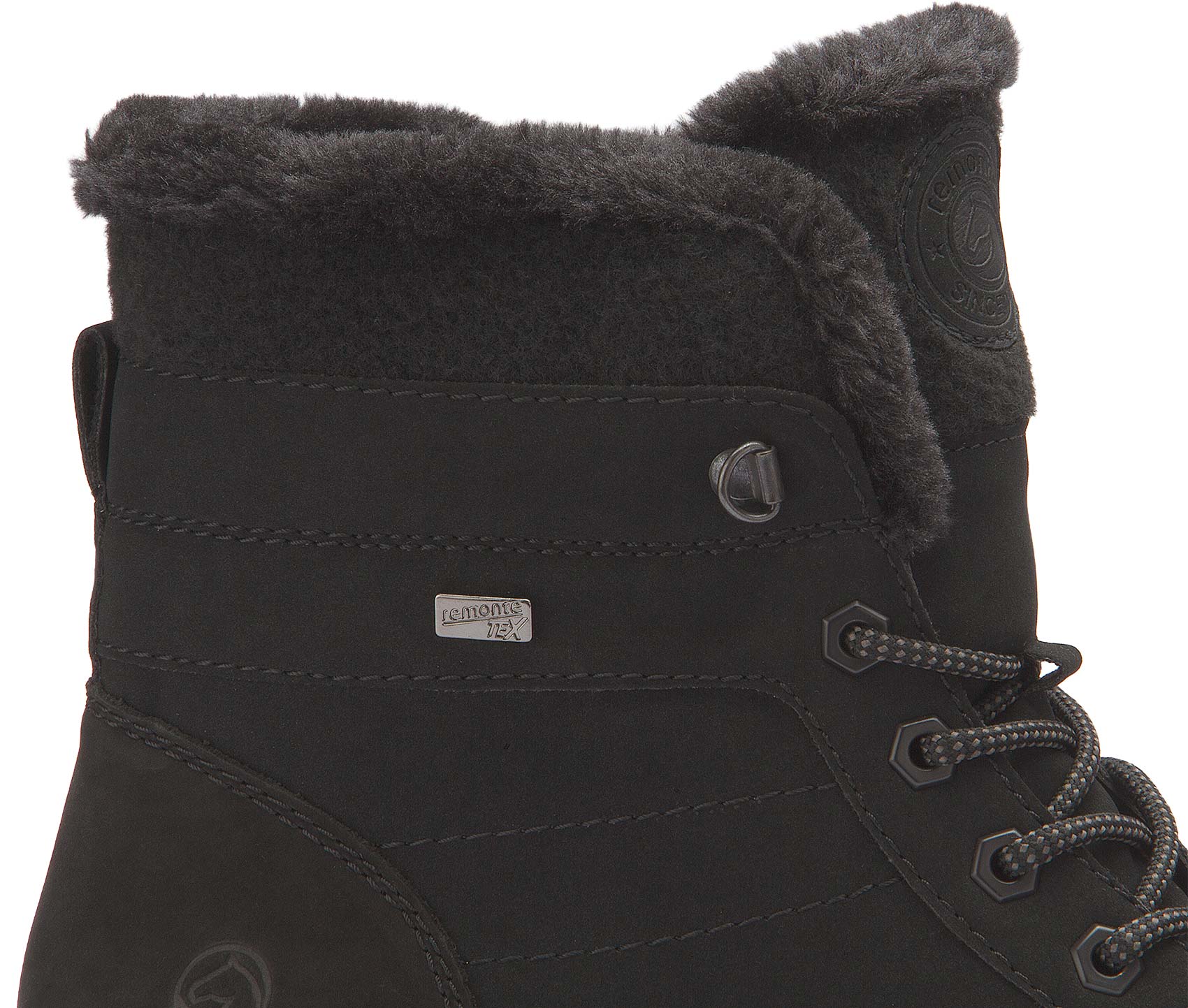 Diese stylischen schwarzen remonte Schnürboot für Damen sind ein Lichtblick an grauen Tagen. Die Schnürung wird durch einen Reißverschluss ergänzt und garantiert somit optimalen Halt und eine perfekte Passform. Der Schaftrand mit Fell rundet das moderne Design perfekt ab. Mit der flexiblen und griffigen Sohle ist trittsicheres Gehen eine Selbstverständlichkeit. Ein Wohlfühlfaktor on top ist die Komfortweite, die mehr Freiraum im Schuh bietet. Dank der remonte Features ist der Schuh optimal für das Winterwetter ausgestattet. Die Füße bleiben dank der kuscheligen und sehr warmen Schurwolle den ganzen Tag lang angenehm warm! Bequemer wird’s nicht mehr!