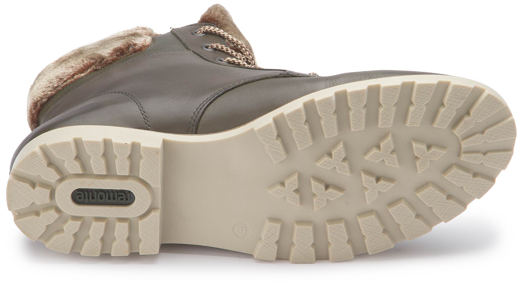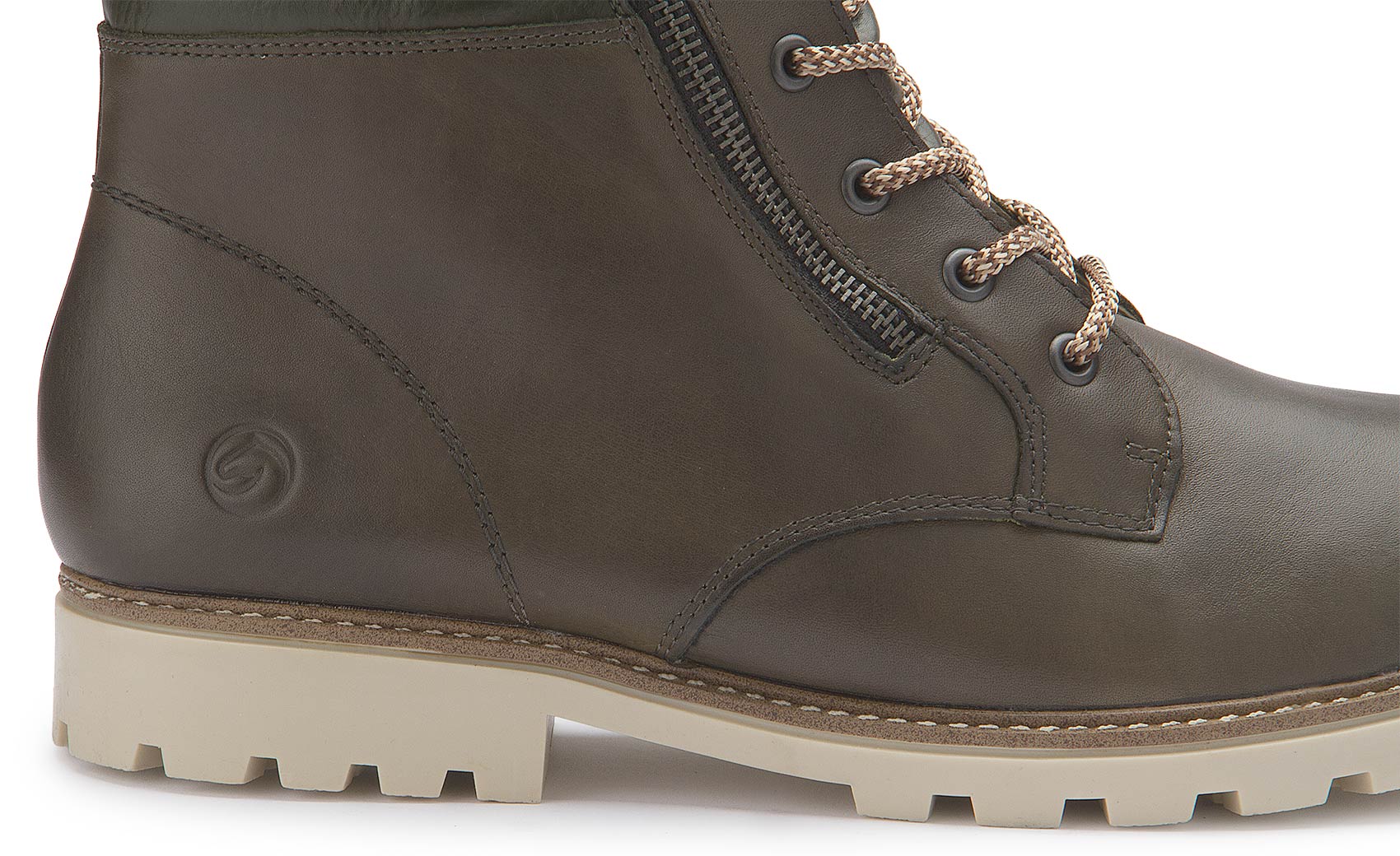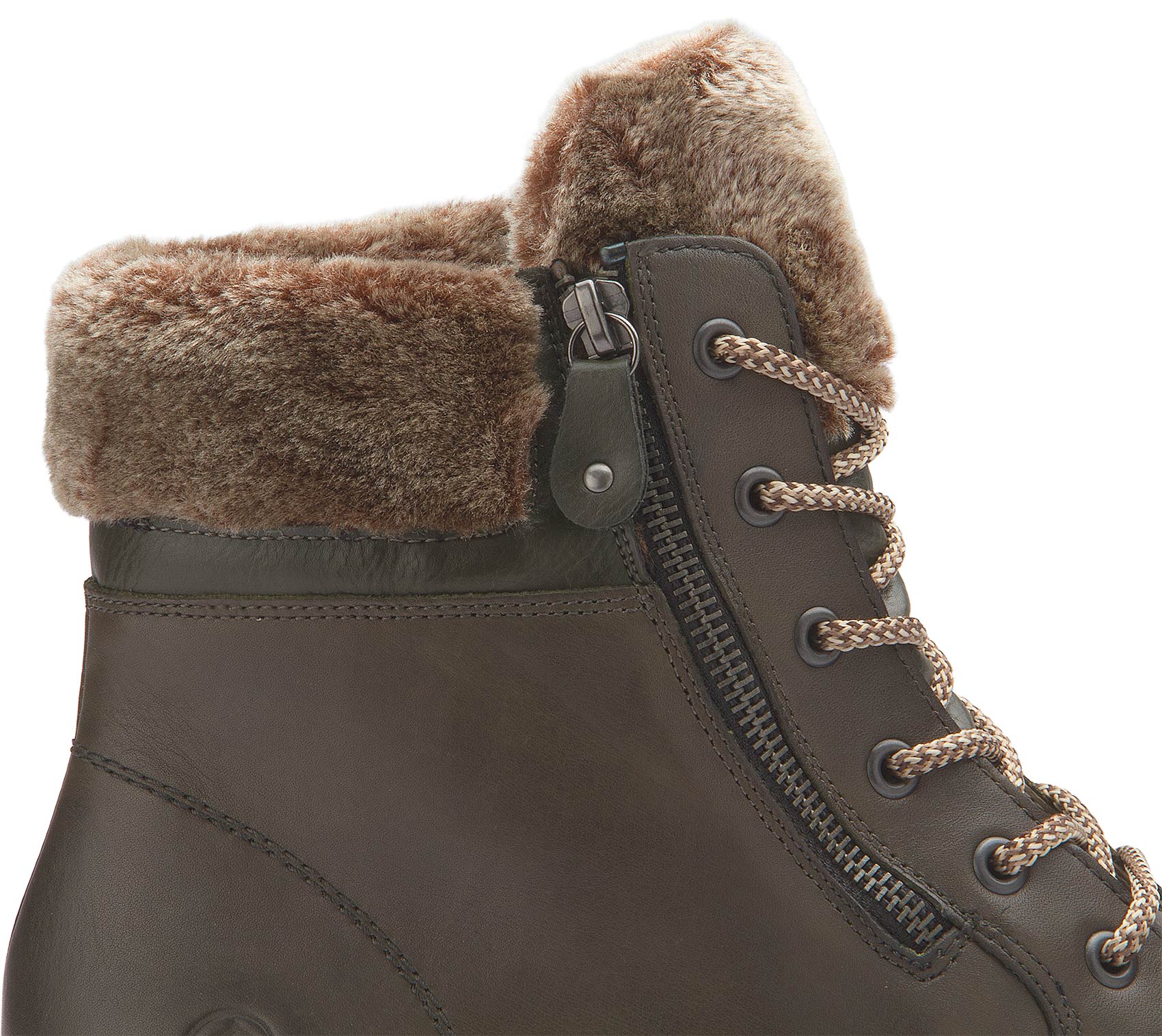 Dieser dunkelgrüne Remonte Schnürstiefel ist mit seiner derben Profilsohle ist und dem kuschligen Fake-Fur-Schaft winterlich designt und bietet guten Tragekomfort. Er hat ein warmes Innenfutter aus echter Lammwolle und einen funktionalen Reißverschluss neben der Schnürung. Das Wechselfußbett lässt sich schnell und bequem gegen individuelle Einlagen austauschen. Dieser Schnürboot ist ein perfekter Winter-Allrounder, denn dank der THERMO INSOLE mit der eingearbeiteten Thermofolie trotzen Sie mit diesem Schnürboot nicht nur Kälte, sondern auch Frost.
