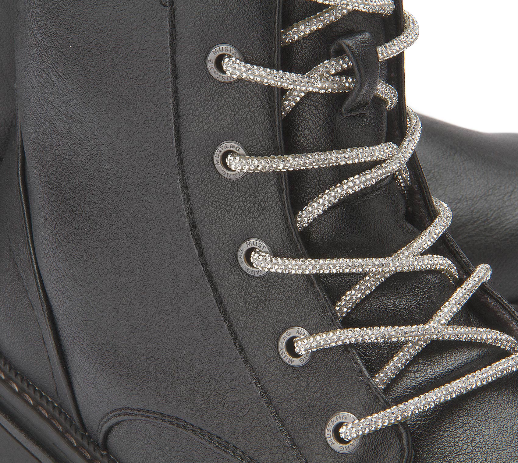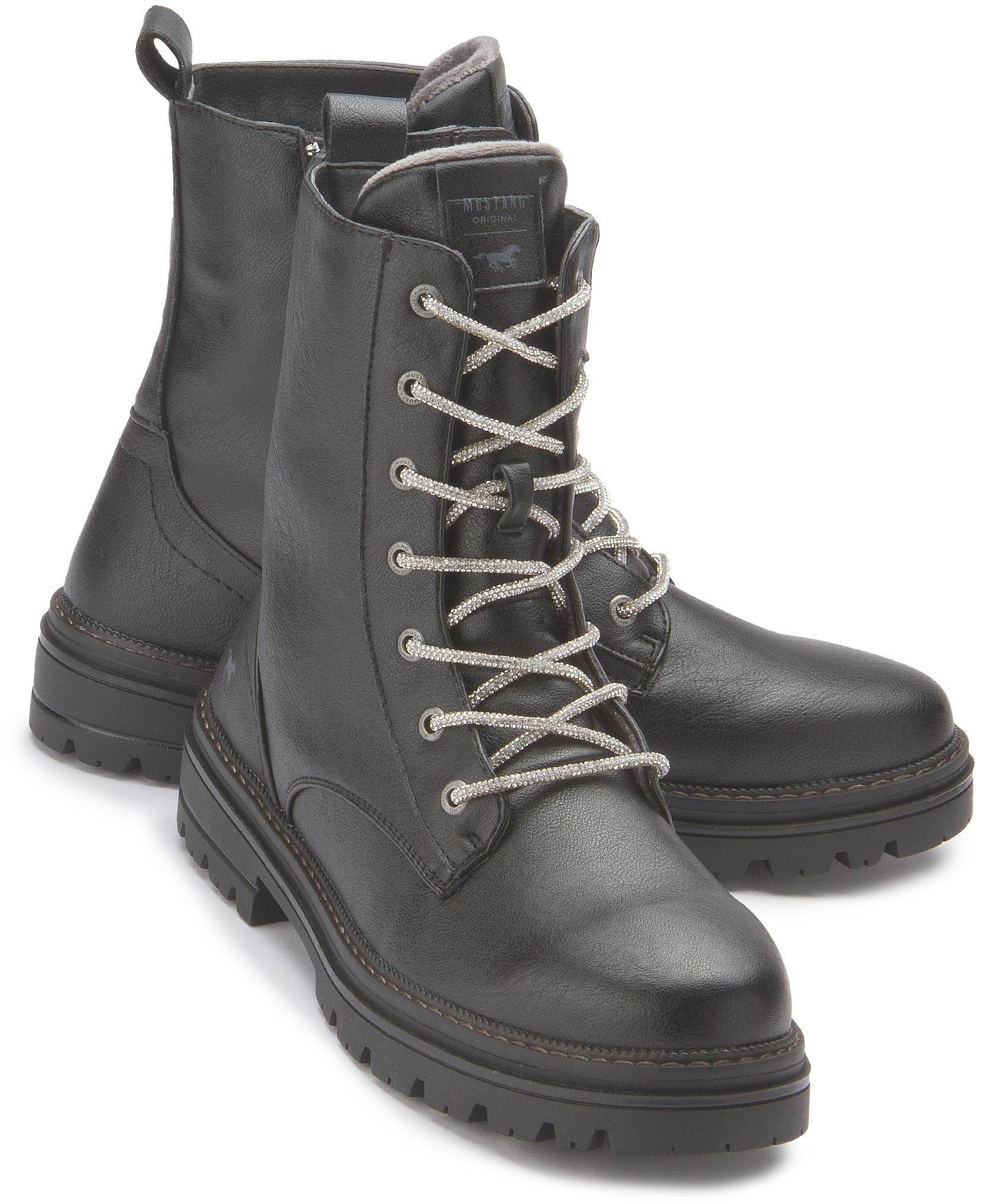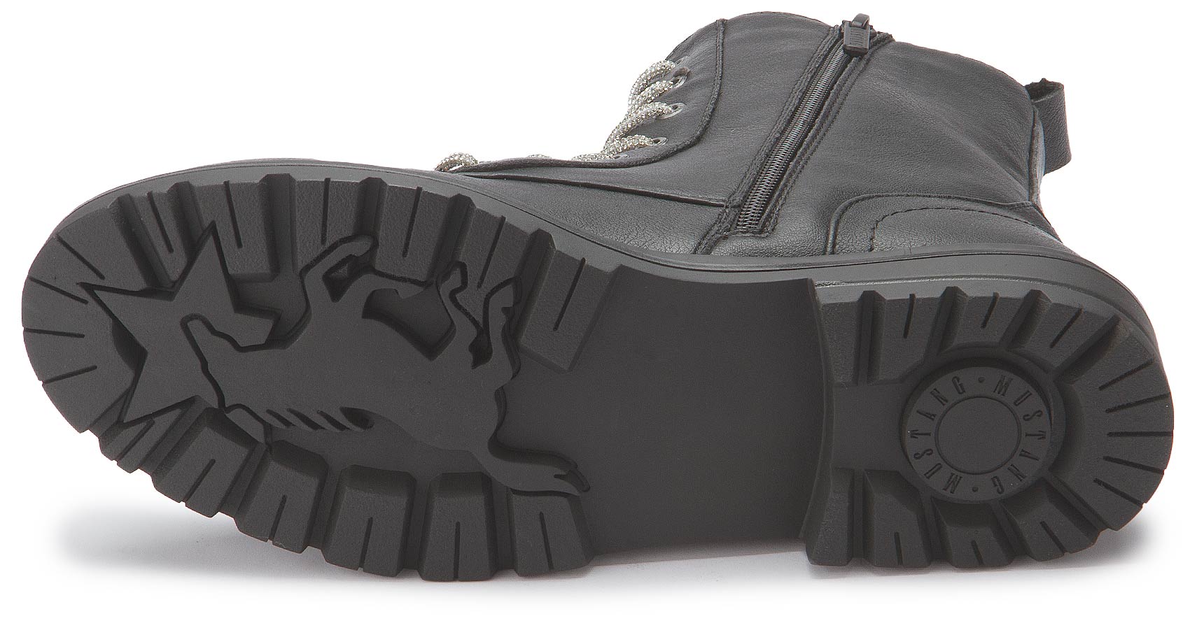 Entdecken Sie diesen trendigen Mustang Schnür Boot in elegantem Schwarz. Aus hochwertigem Lederimitat gefertigt, bietet sie sowohl Schnürung als auch seitlichen Reißverschluss für optimalen Komfort und einen stylischen Look. Die mit Steinchen besetzte Schnürung ist das Highlight. Perfekt für vielseitige Outfits und verschiedene Anlässe.