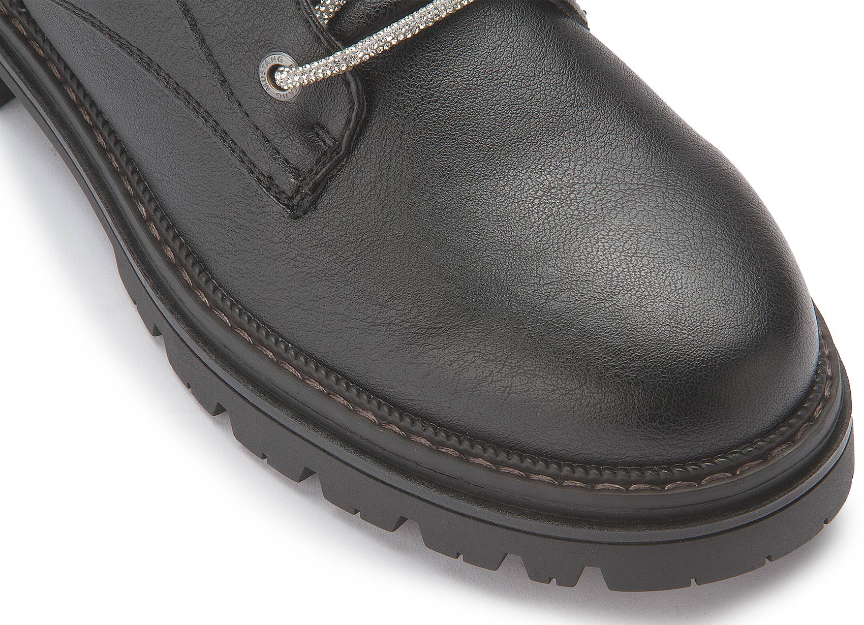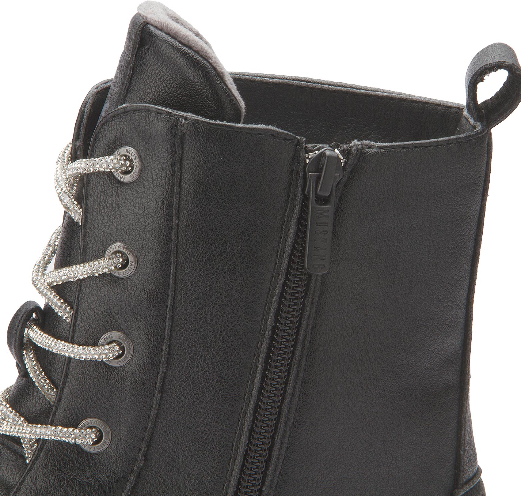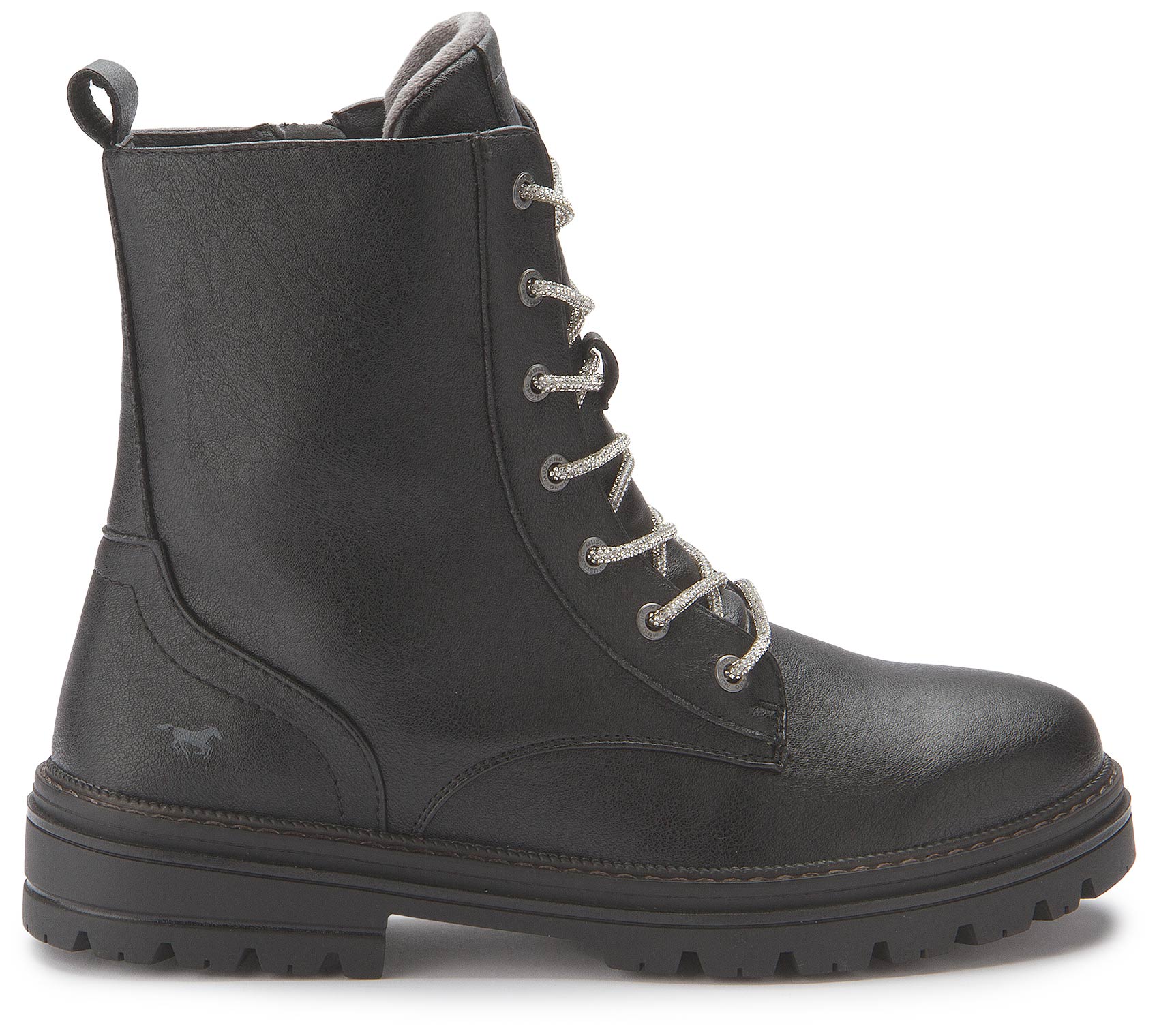 Entdecken Sie diesen trendigen Mustang Schnür Boot in elegantem Schwarz. Aus hochwertigem Lederimitat gefertigt, bietet sie sowohl Schnürung als auch seitlichen Reißverschluss für optimalen Komfort und einen stylischen Look. Die mit Steinchen besetzte Schnürung ist das Highlight. Perfekt für vielseitige Outfits und verschiedene Anlässe.