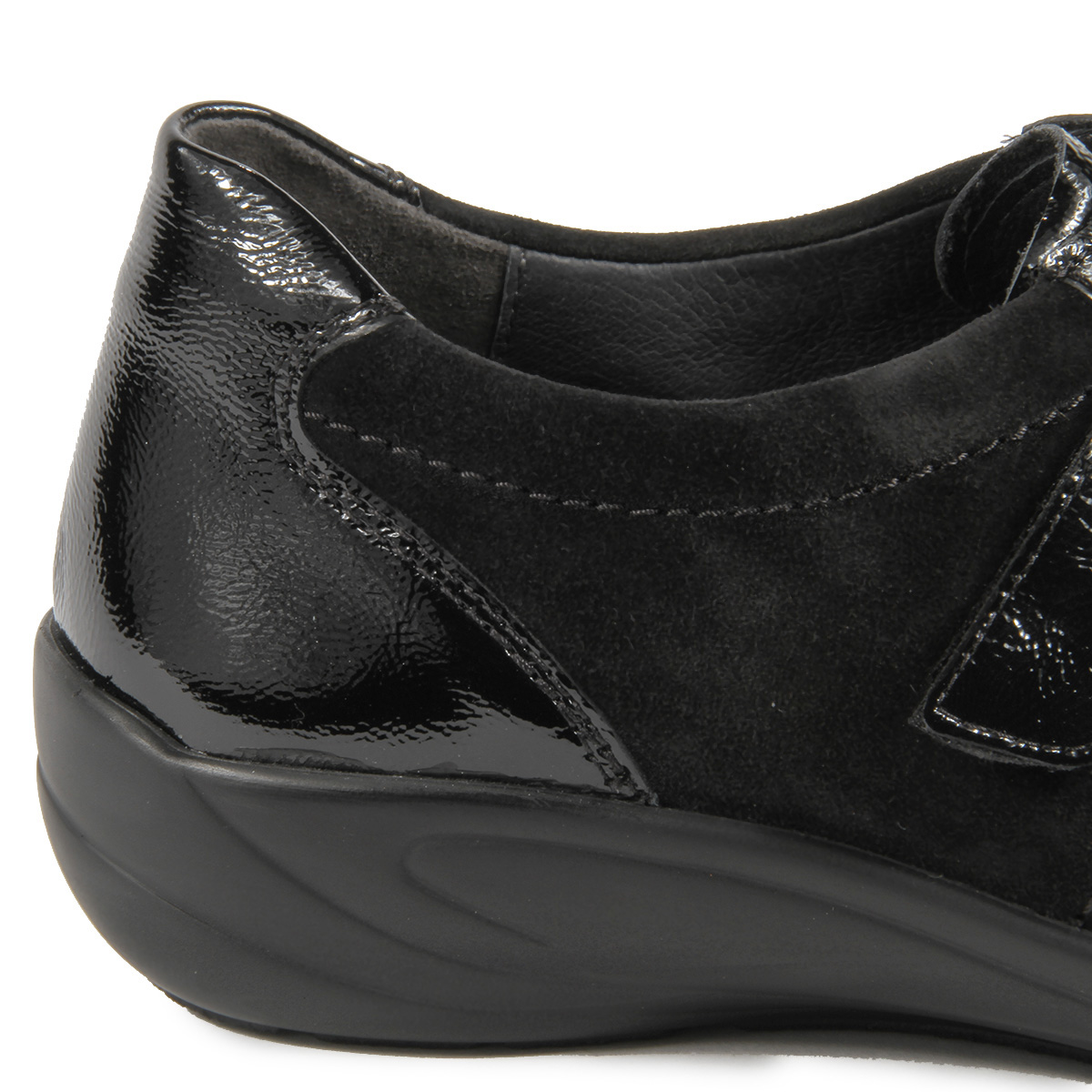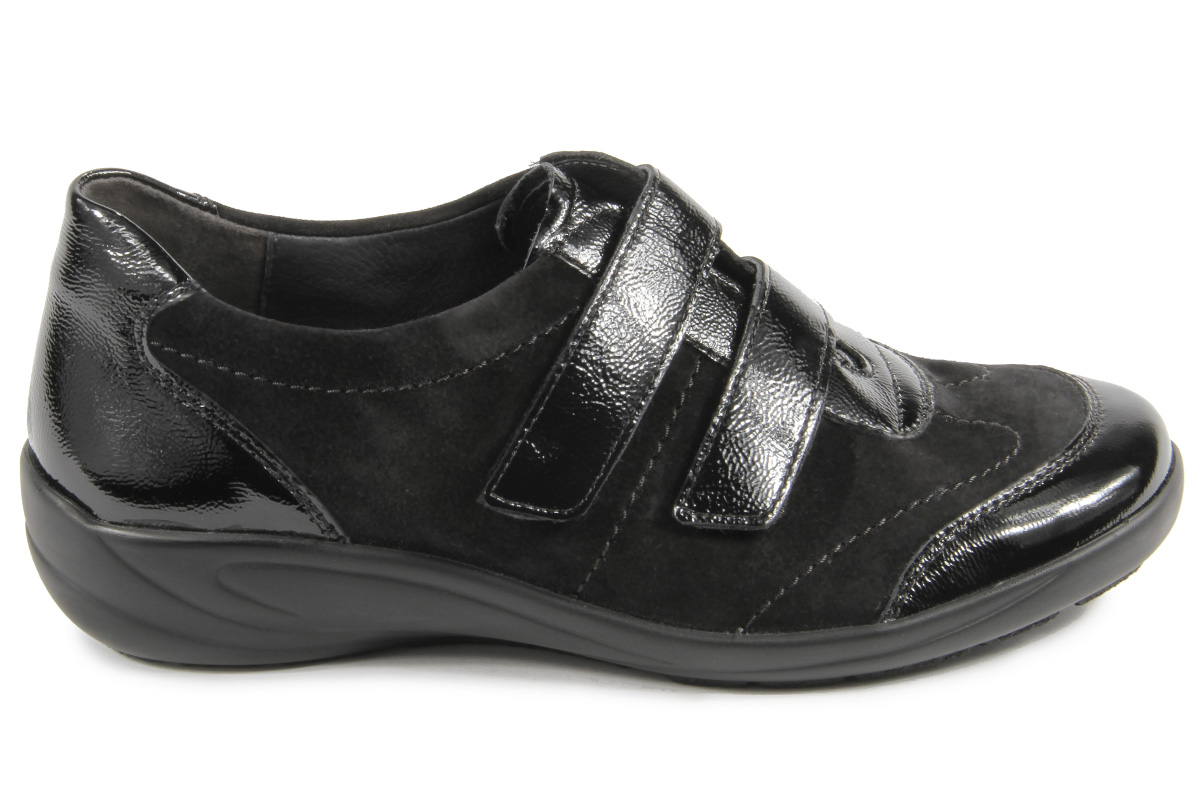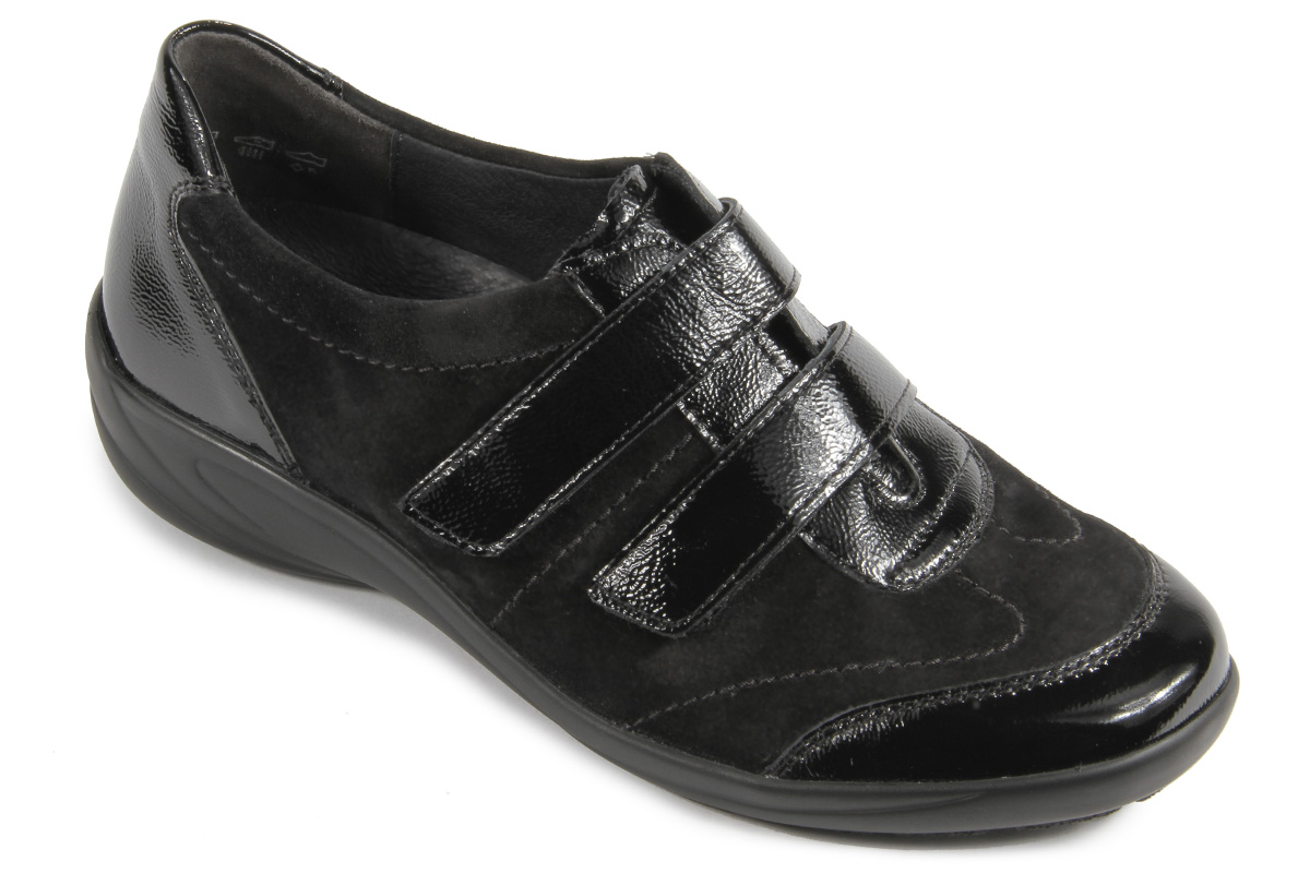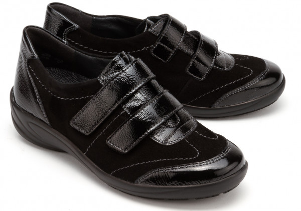 Sneaker in einer Kombination aus Knautschlack und Kalbvelour in Schwarz. Lederfutter, Wechselfußbett, ca. 25 mm Absatz, sehr angenehme PU Luftpolster-Gummisohle. Hoher Tragekomfort durch die superbequeme H-Weite und leichten Einstieg durch 2 Klettverschlüsse.