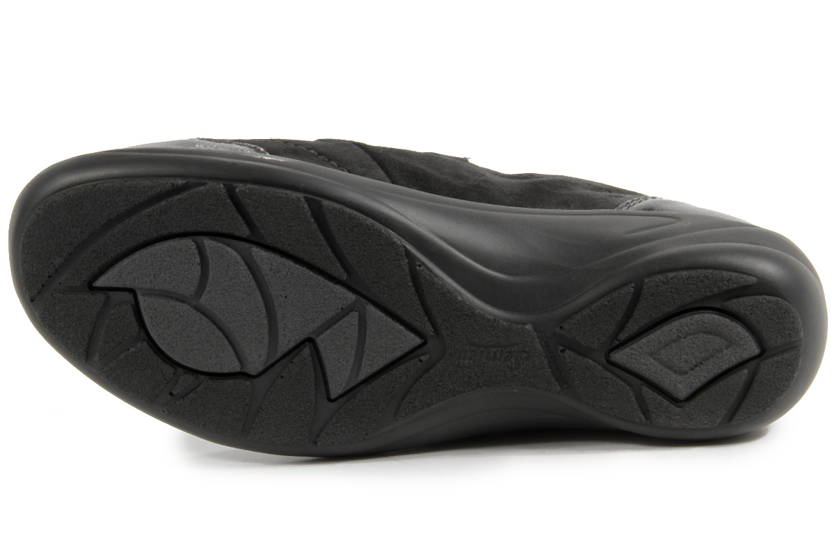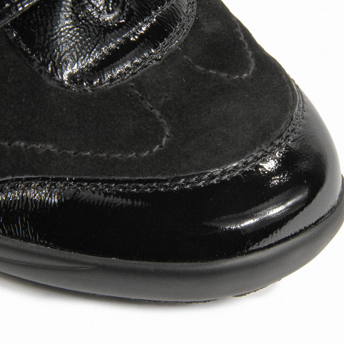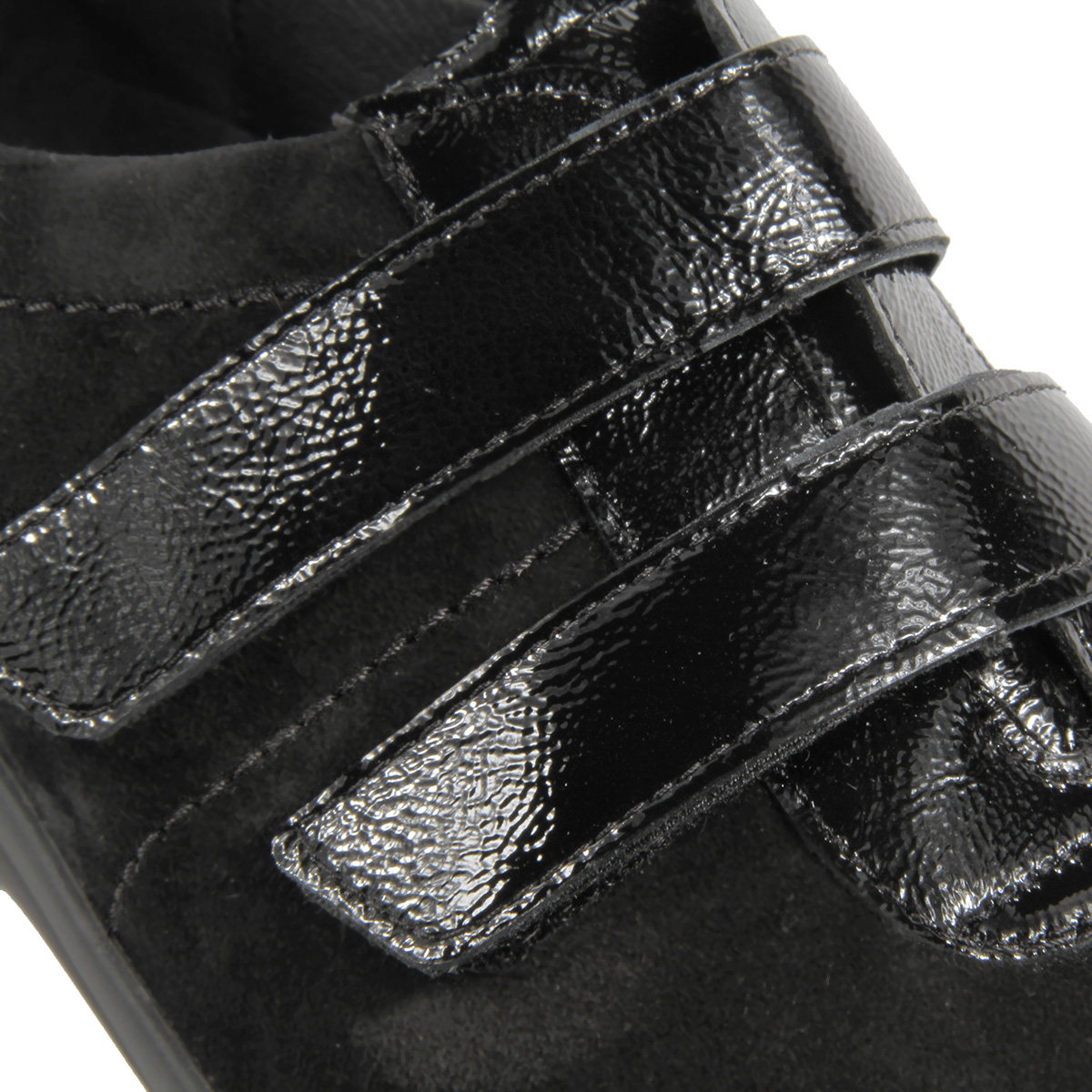 Sneaker in einer Kombination aus Knautschlack und Kalbvelour in Schwarz. Lederfutter, Wechselfußbett, ca. 25 mm Absatz, sehr angenehme PU Luftpolster-Gummisohle. Hoher Tragekomfort durch die superbequeme H-Weite und leichten Einstieg durch 2 Klettverschlüsse.
