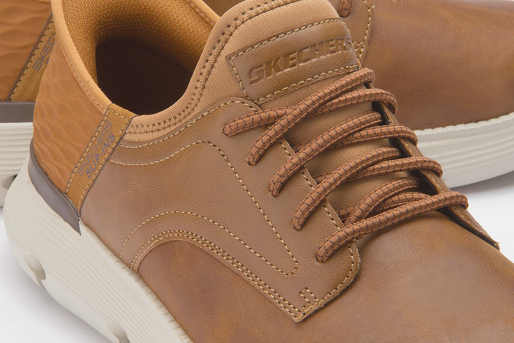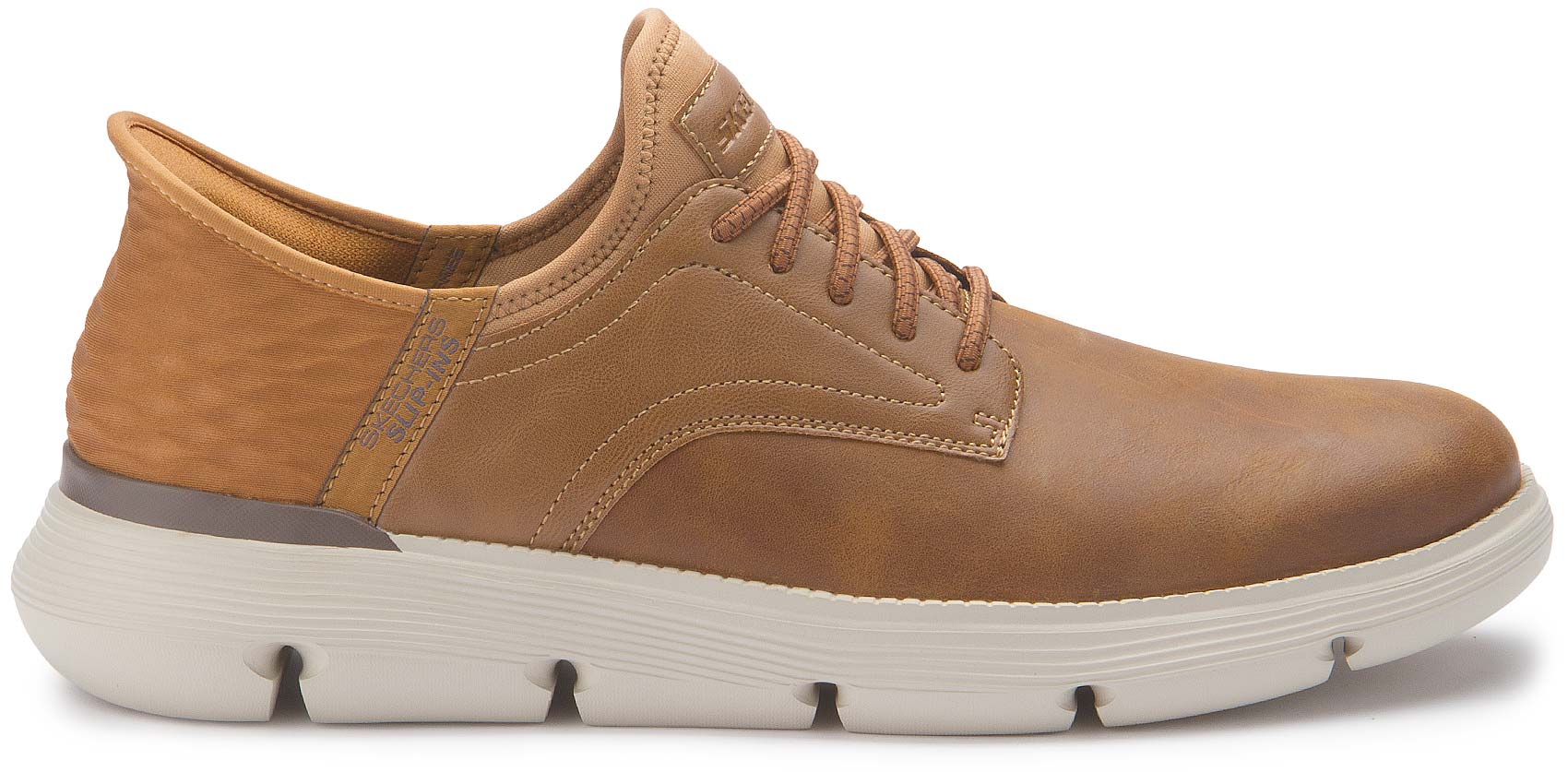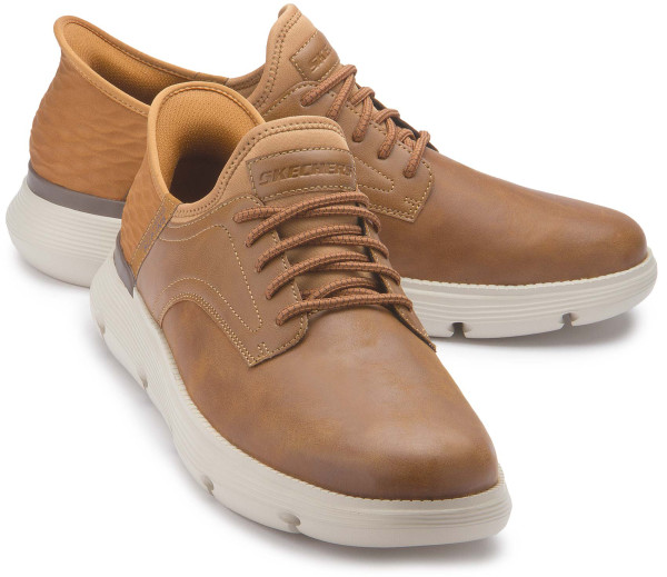 Bleibe selbst in einem bequemen Business-Casual-Look noch effizient mit Skechers Hands Free Slip-ins®. Dieser Schnürschuh im TOUCHLESS FIT® Design verfügt über ein Obermaterial aus Glattleder mit Stretch-Schnürung, ein geformtes Skechers Slip-Ins® Fersenpanel, eine mit Aktivkohle angereicherte Skechers Air-Cooled Memory Foam-Innensohle und Skechers Goga Mat Arch® für zusätzlichen Halt.