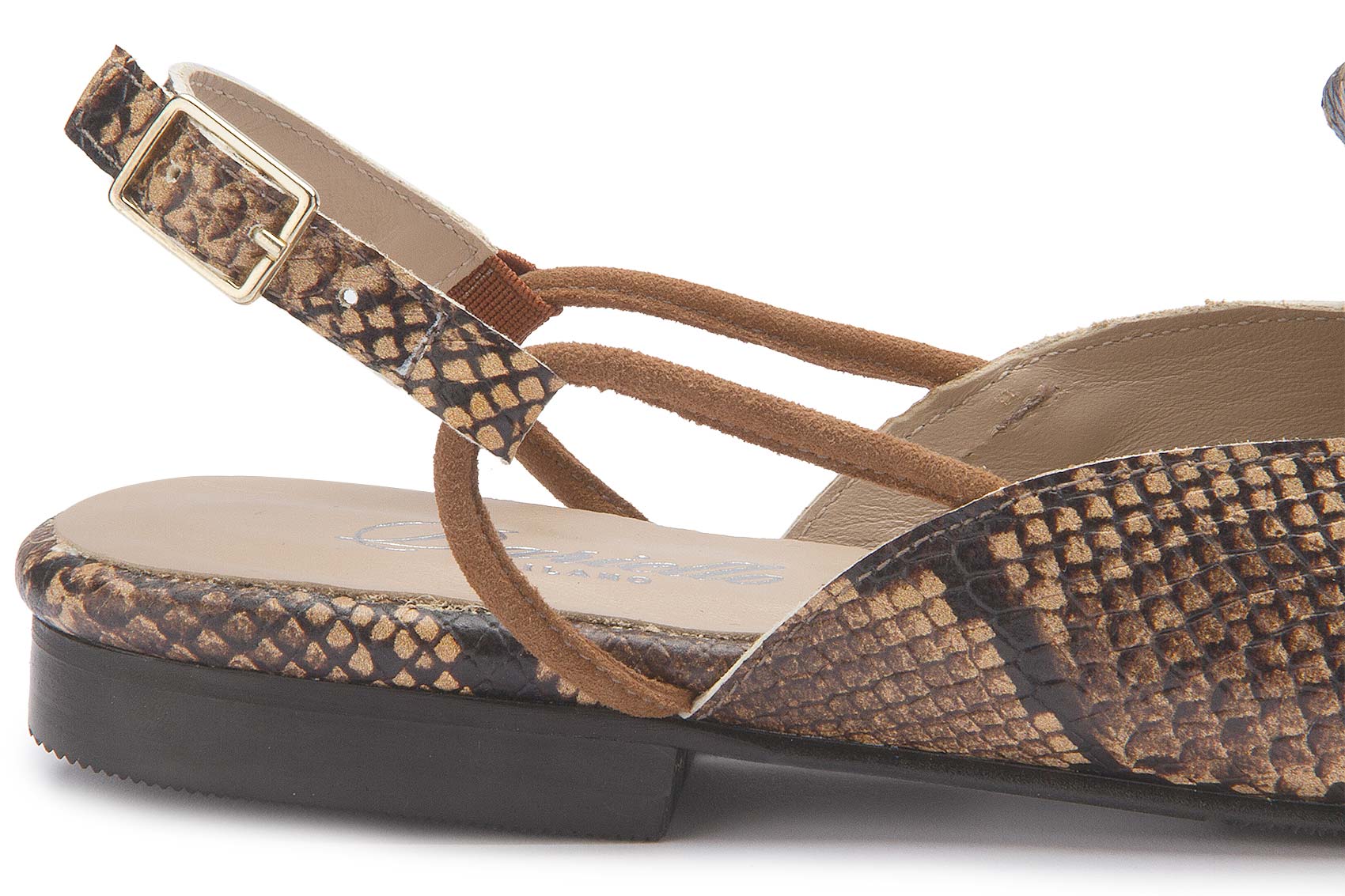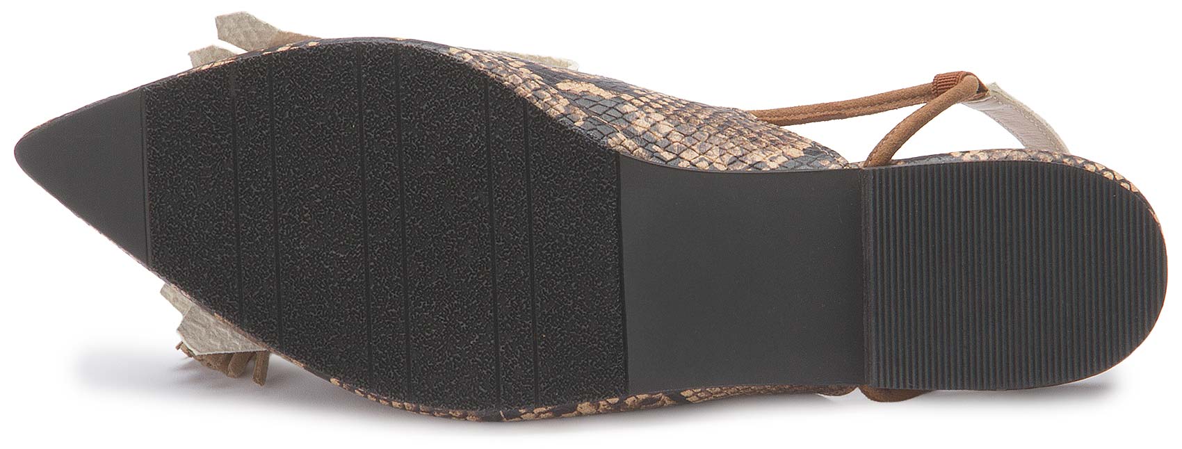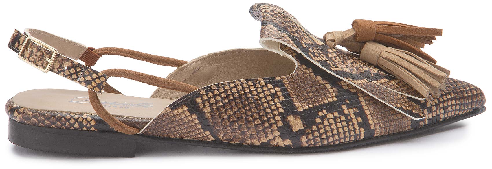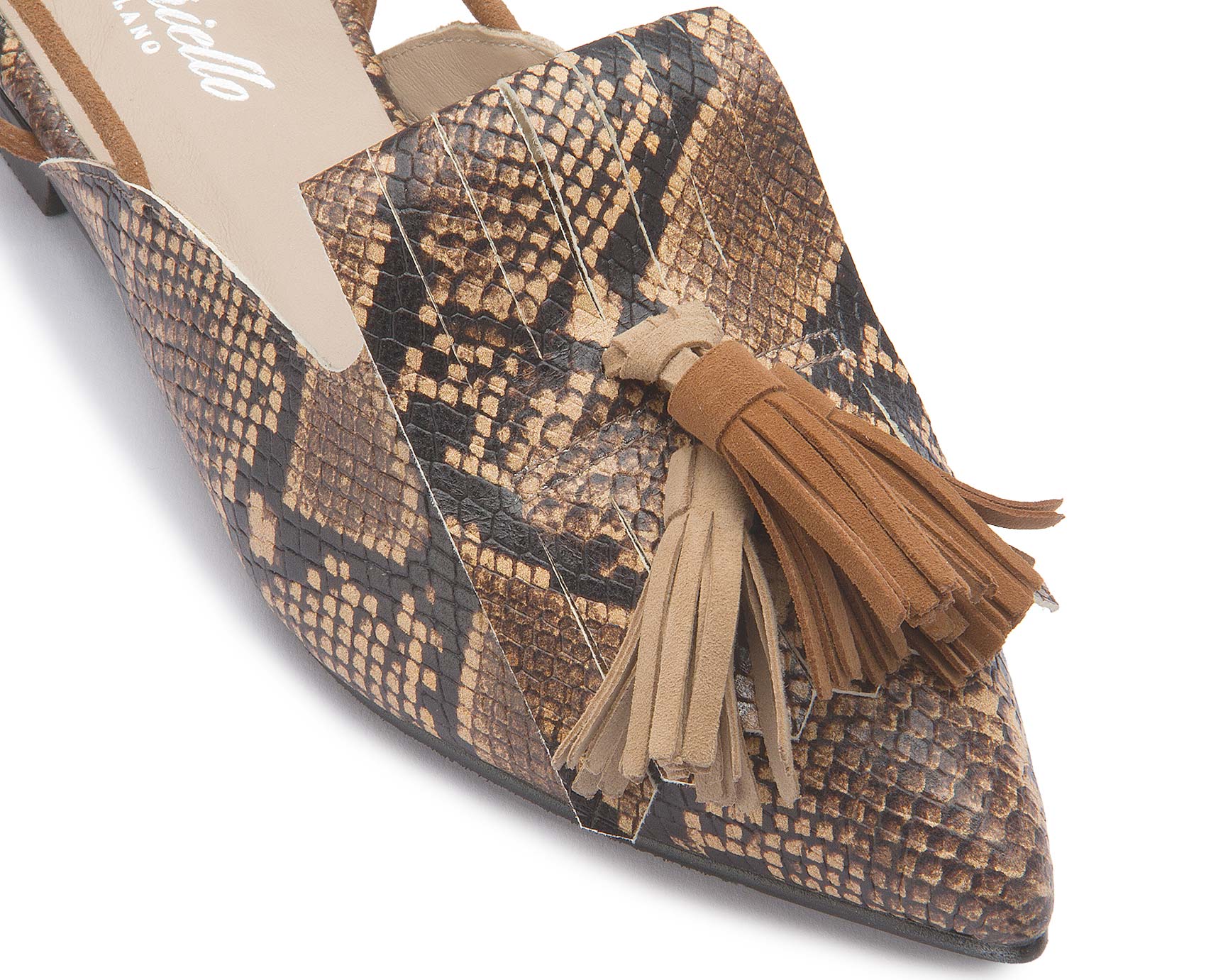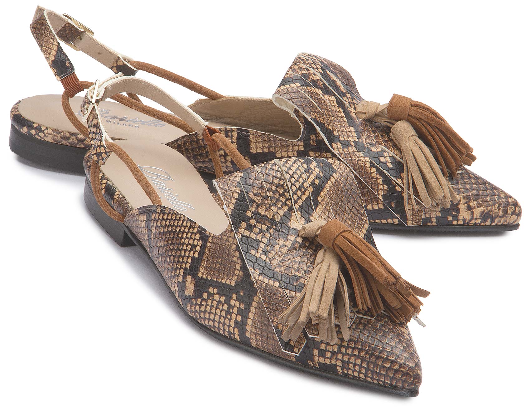 Der Sling von Bariello Milano zieht mit seinem markanten Schlangenprint und den dekorativen Quasten alle Blicke auf sich. Die spitz zulaufende Form verleiht dem Design eine elegante Silhouette, während der Fersenriemen für angenehmen Halt sorgt. Ein ausdrucksstarker Schuh, der jedem Outfit eine besondere Note verleiht.