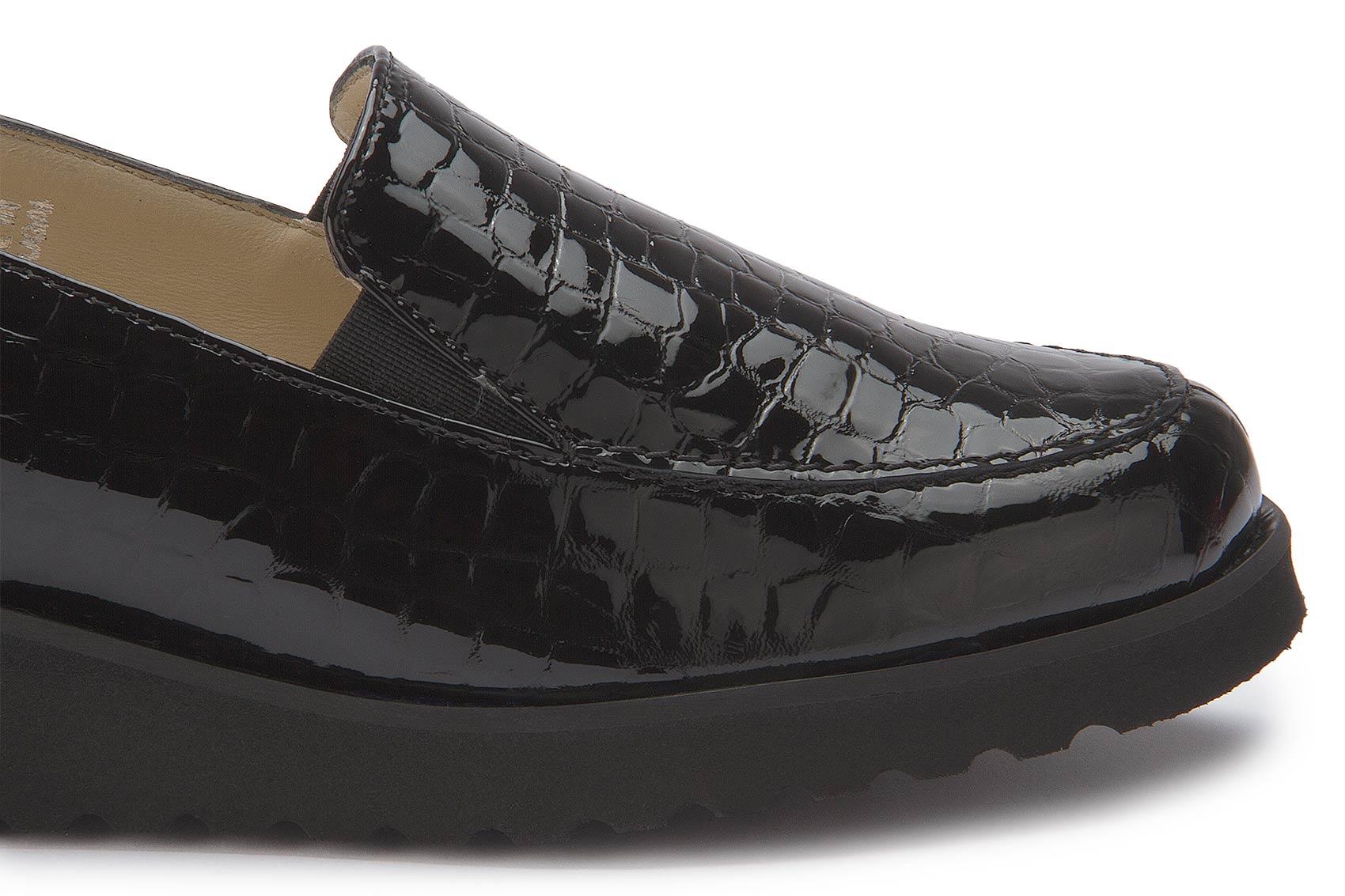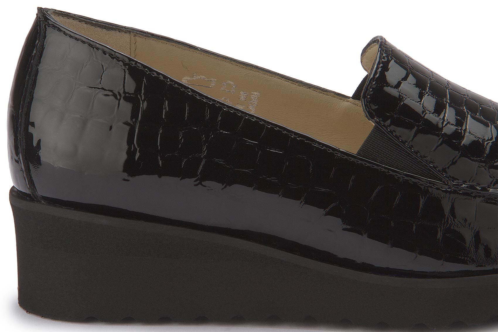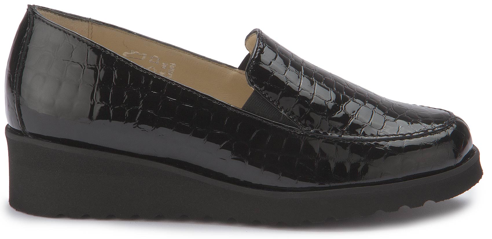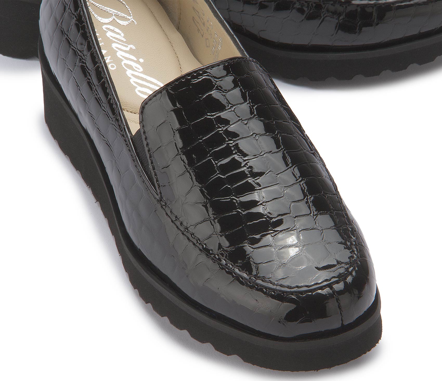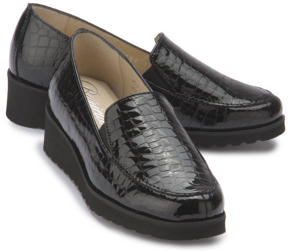 Eleganter Slipper von Bariello aus glänzendem Lackleder mit edler Krokoprägung – ein stilvoller Begleiter für jeden Anlass. Der bequeme Keilabsatz und die rutschfeste Sohle sorgen für hohen Tragekomfort im Alltag. Perfekt kombinierbar zu Business- oder Freizeitlooks.