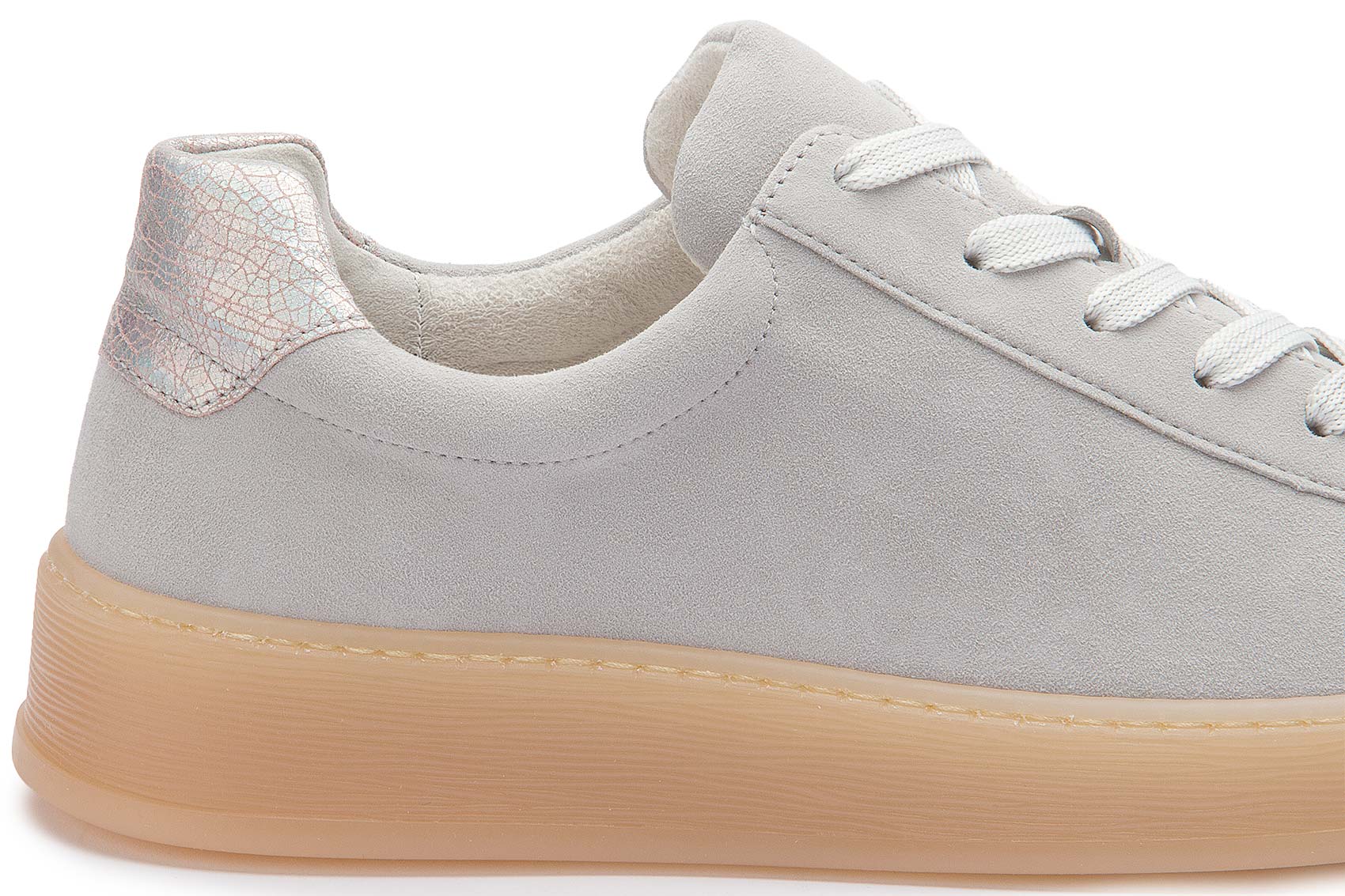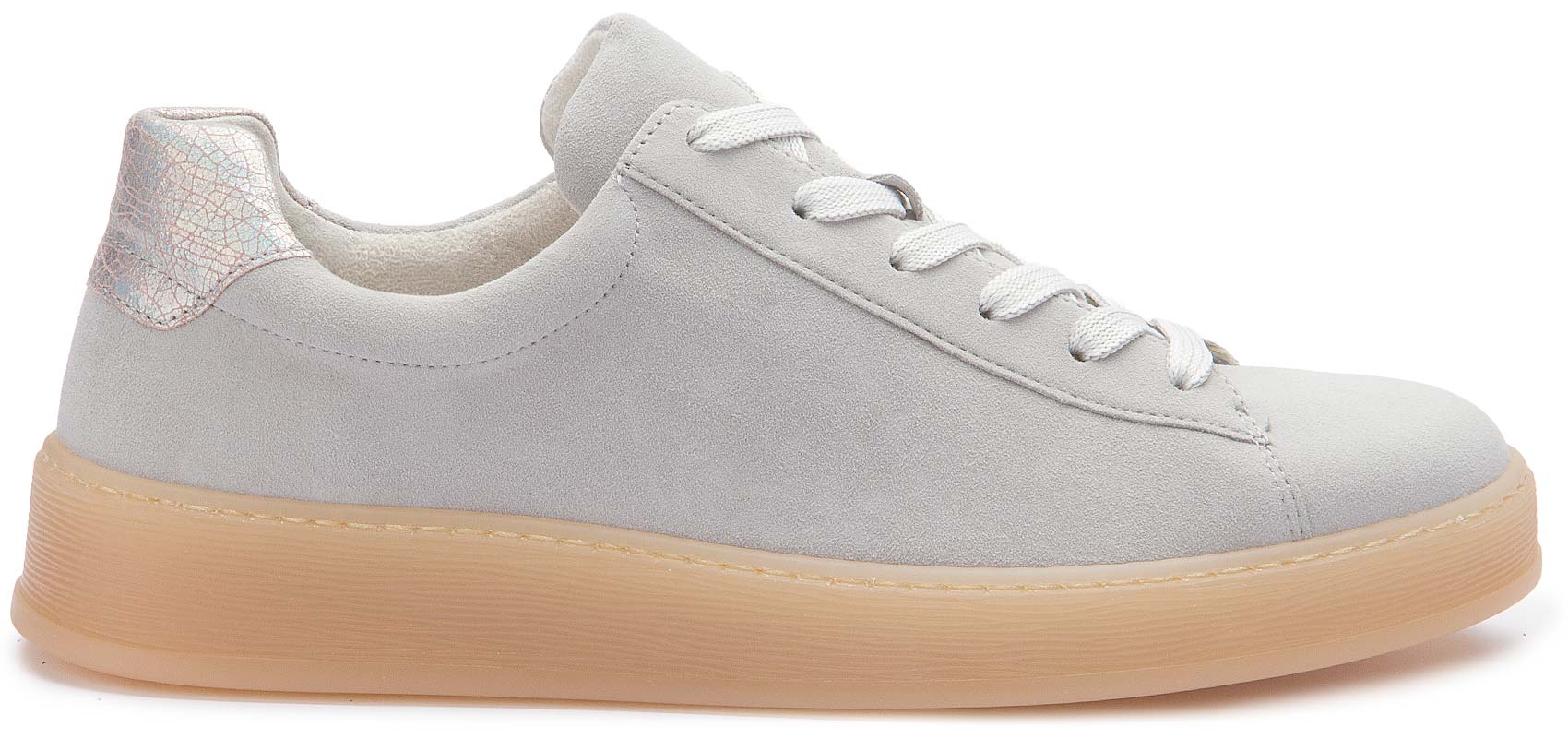 Diese stylischen Sneaker überzeugen mit ihrem schlichten, modernen Design in hellem Grau und einer trendigen, leicht transparenten Sohle. Dank der bequemen Passform und der cleanen Optik lassen sie sich vielseitig kombinieren – ob sportlich oder casual. Ein dezentes Highlight ist der schimmernde Fersenbereich, der dem Schuh einen besonderen Look verleiht.