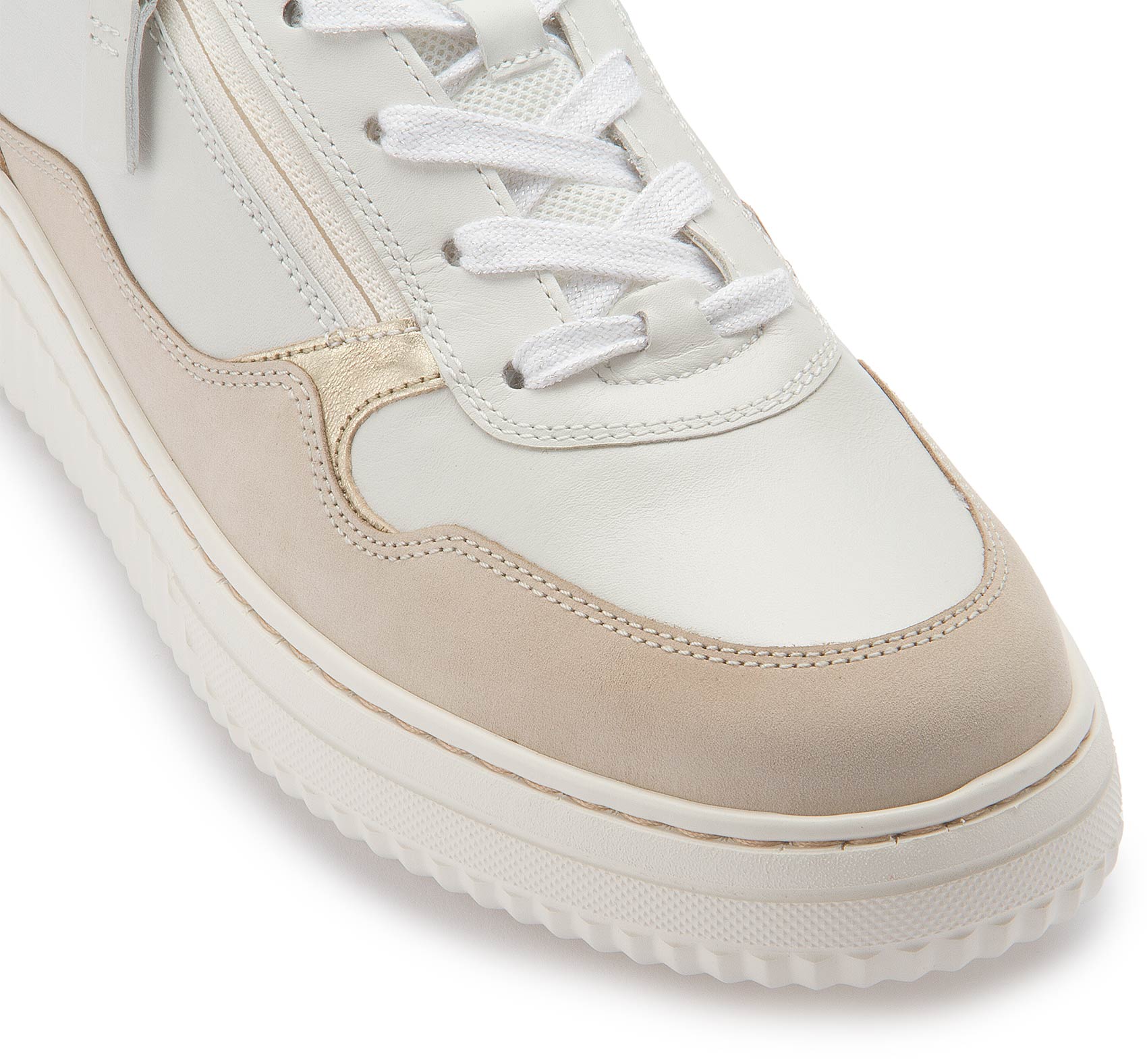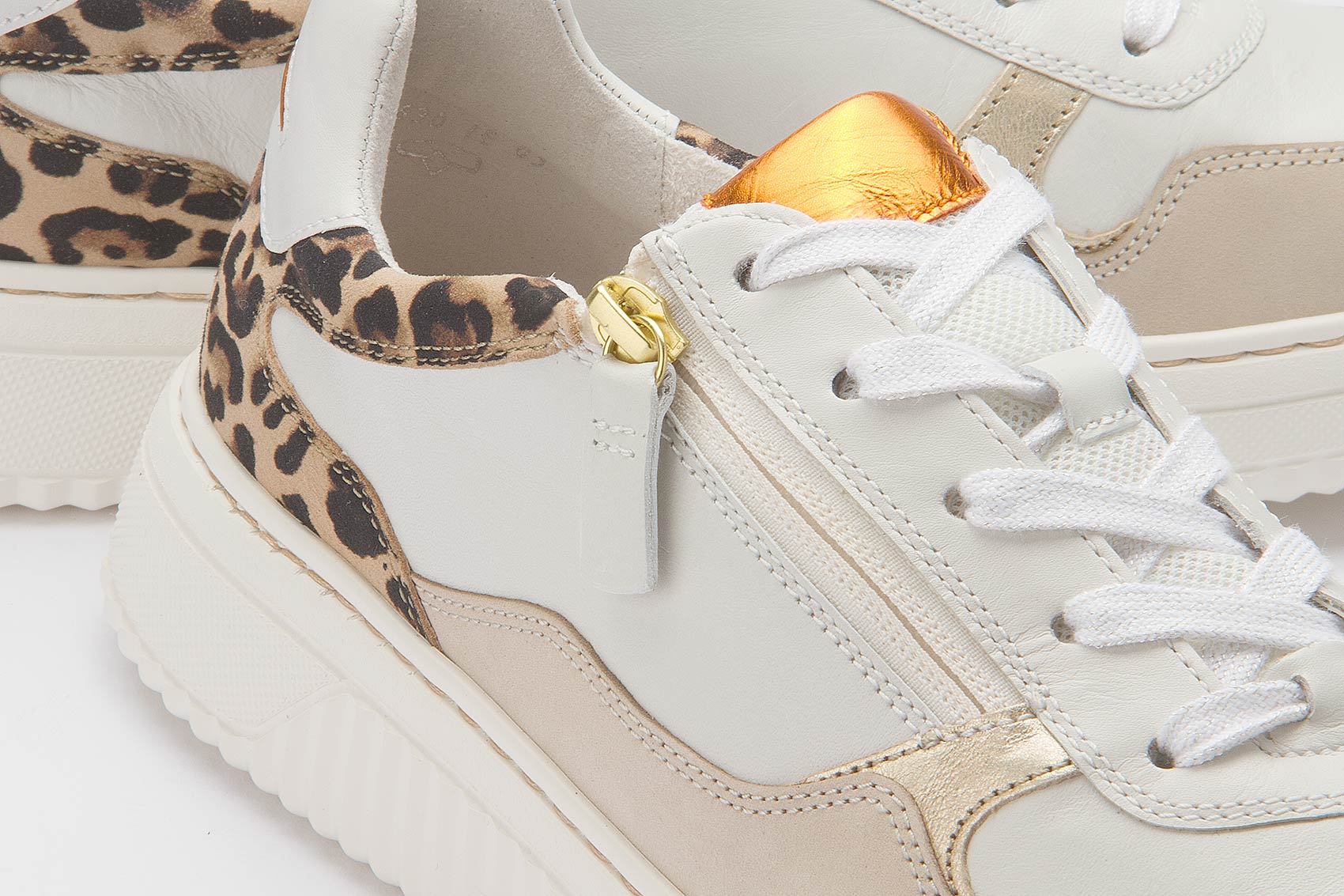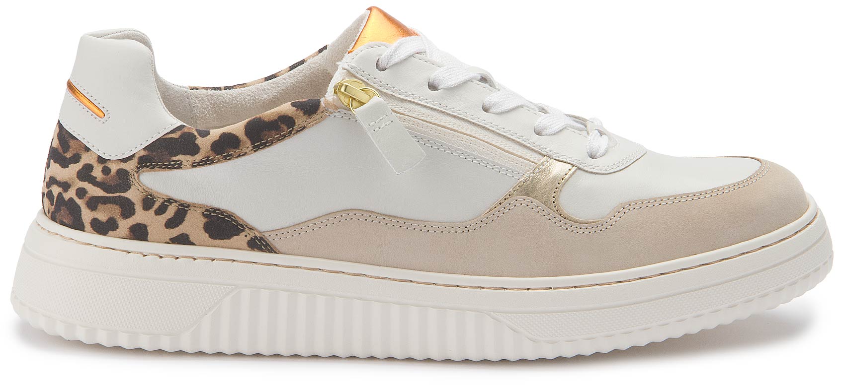 Cool, cooler, Gabor! Dieser Sneaker in Weiß mit Leo überzeugt auf ganzer Linie. Das Obermaterial aus weichem Ledermix gefertigt, ein Reißverschluss, der das Anziehen erleichtert, die Plateausohle, die jeden Schritt dämpft und eine Komfortweite K, machen diesen Sneaker im Retrolook zum absoluten Highlight!