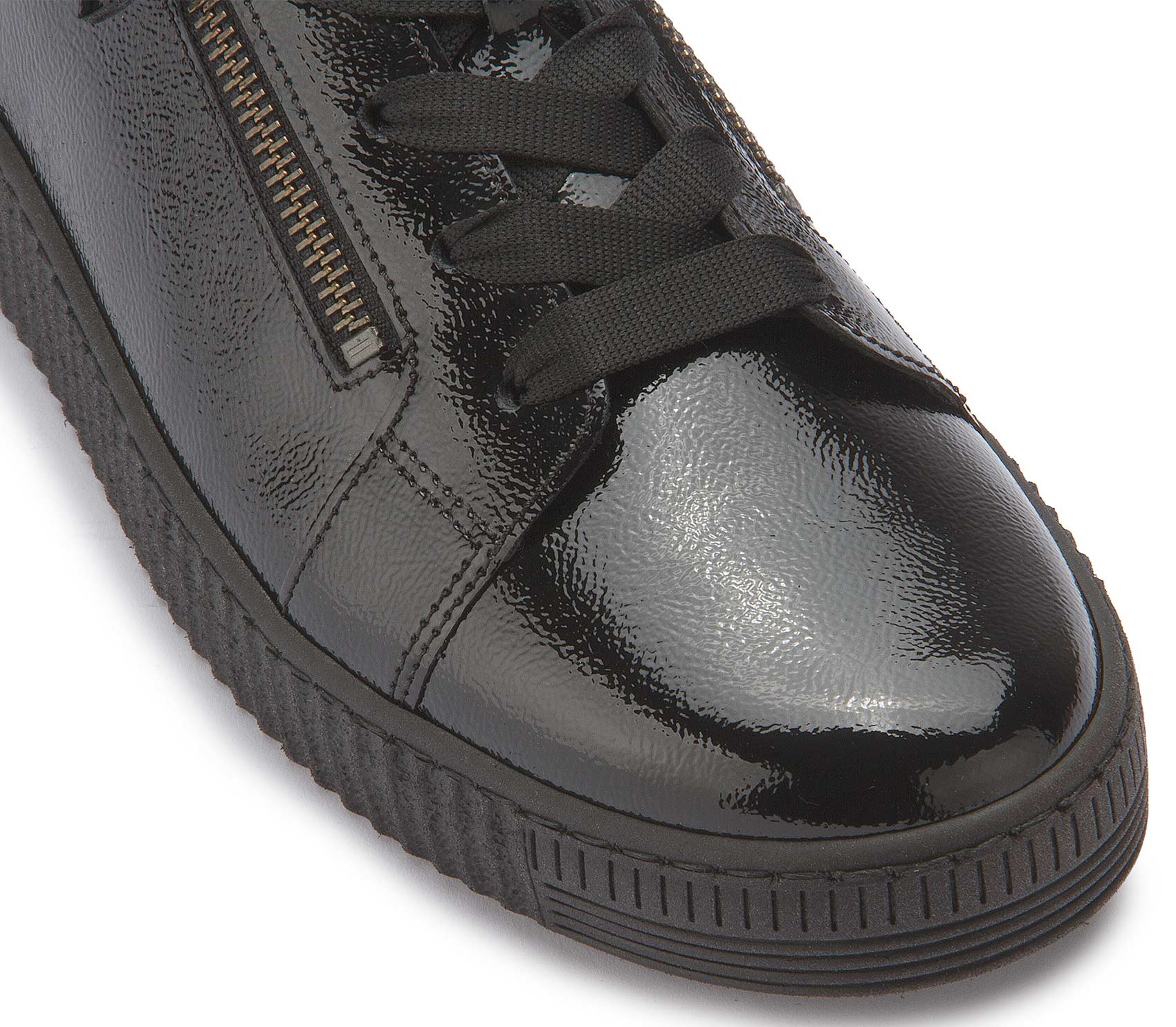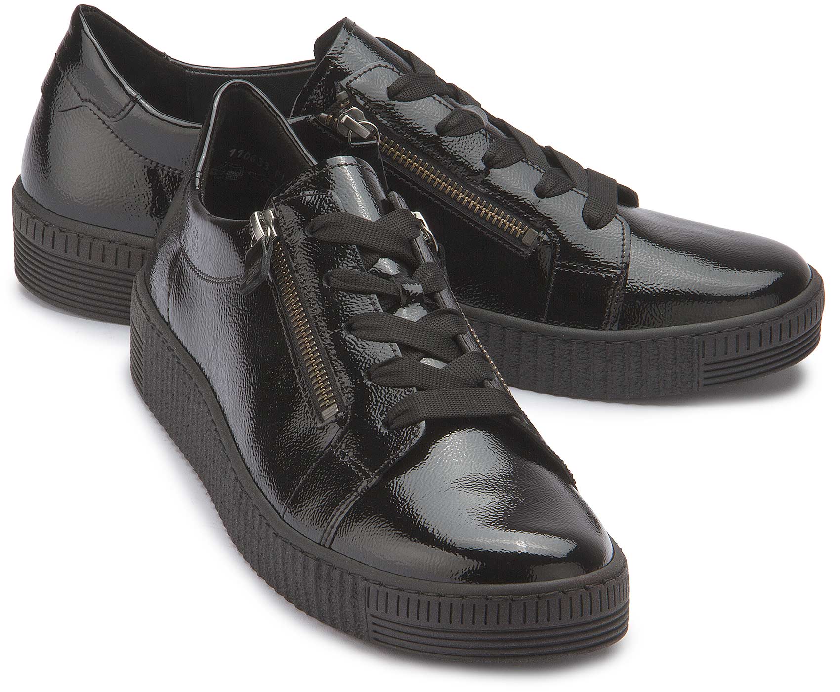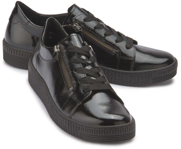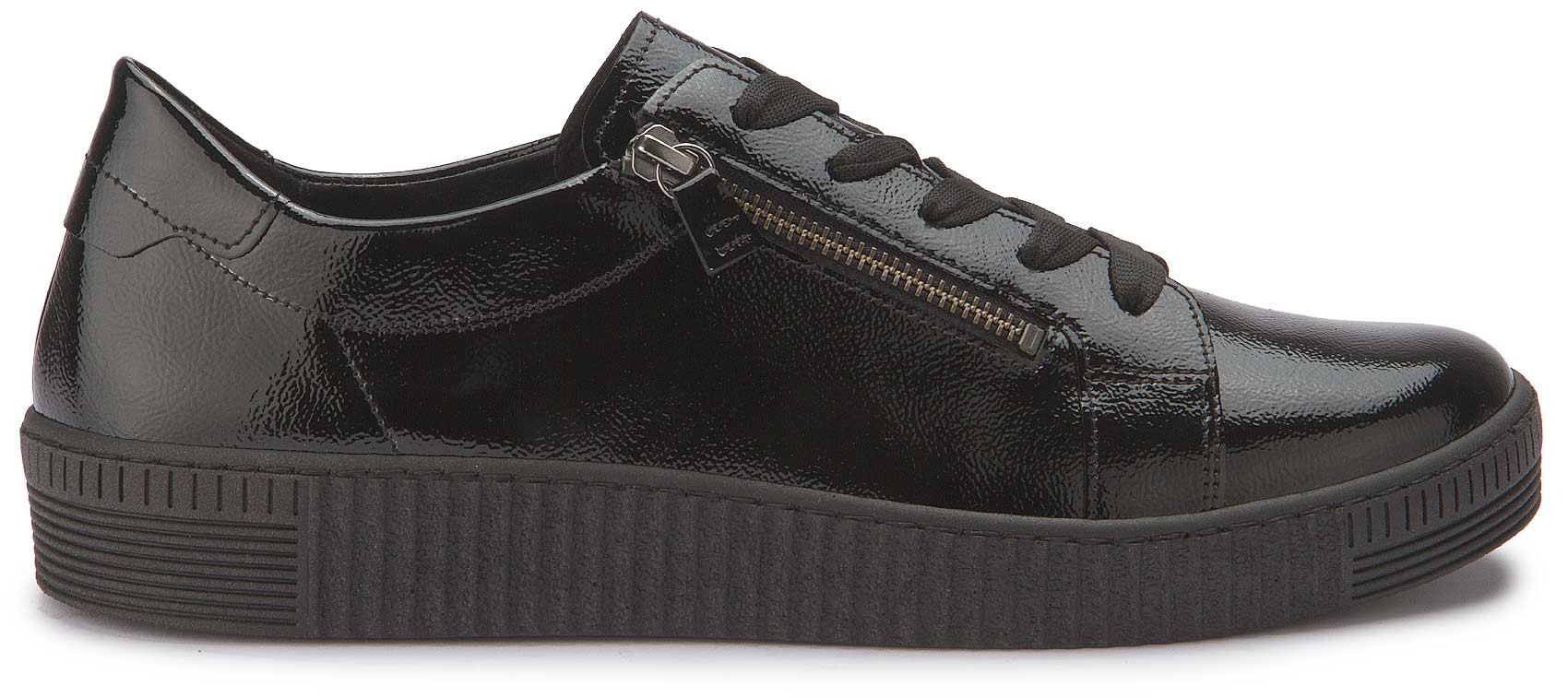 Gabor präsentiert einen trendigen Sneaker in Schwarz Lackleder mit Reißverschluss und runder Schuhspitze. Der Schuh vereint Stil und Komfort, ist leicht anzuziehen und bietet ein angenehmes Tragegefühl. Ein perfektes Accessoire für einen modischen und aktiven Lebensstil.