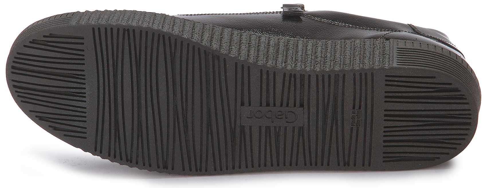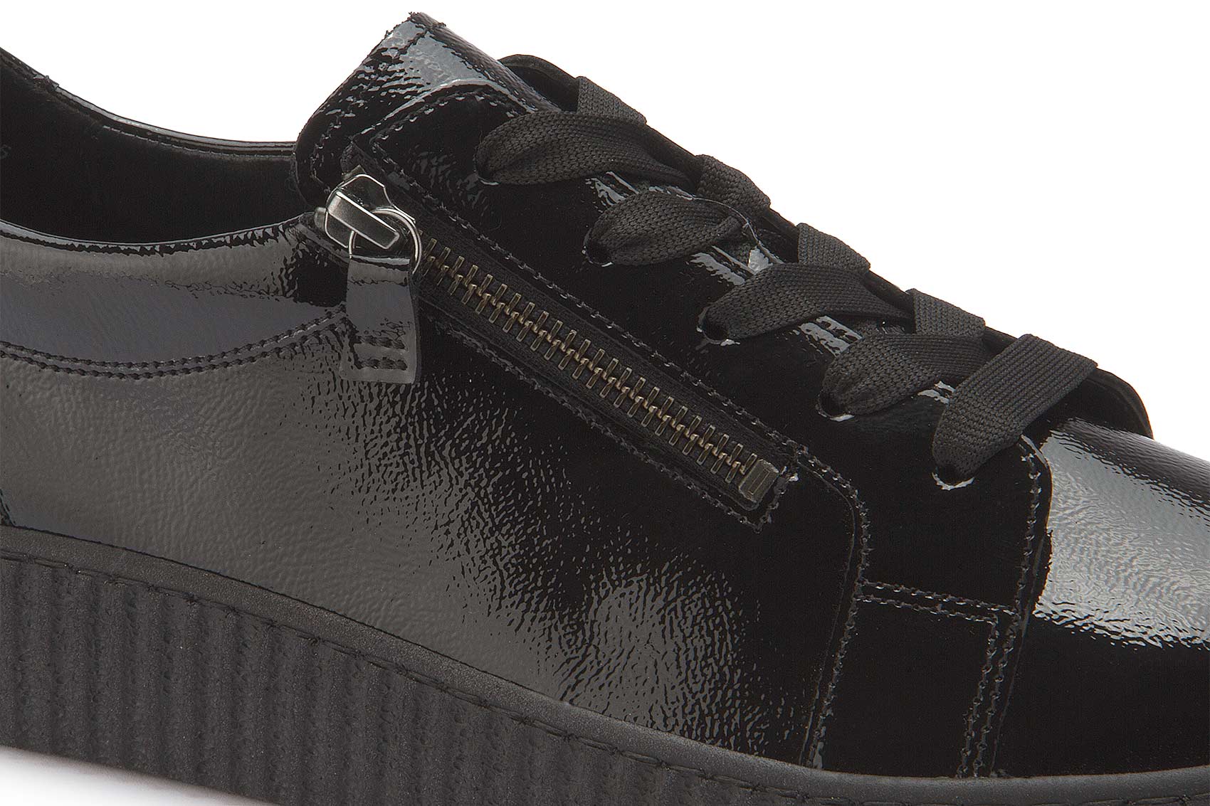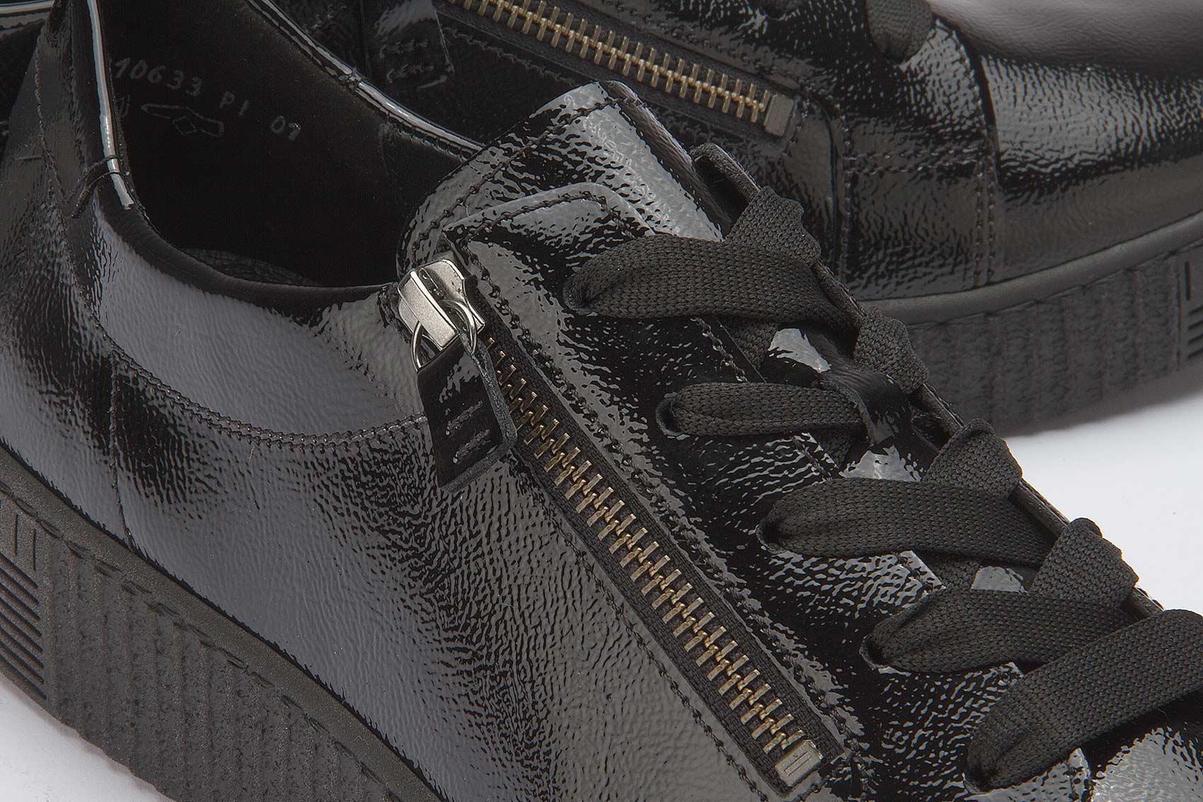 Gabor präsentiert einen trendigen Sneaker in Schwarz Lackleder mit Reißverschluss und runder Schuhspitze. Der Schuh vereint Stil und Komfort, ist leicht anzuziehen und bietet ein angenehmes Tragegefühl. Ein perfektes Accessoire für einen modischen und aktiven Lebensstil.