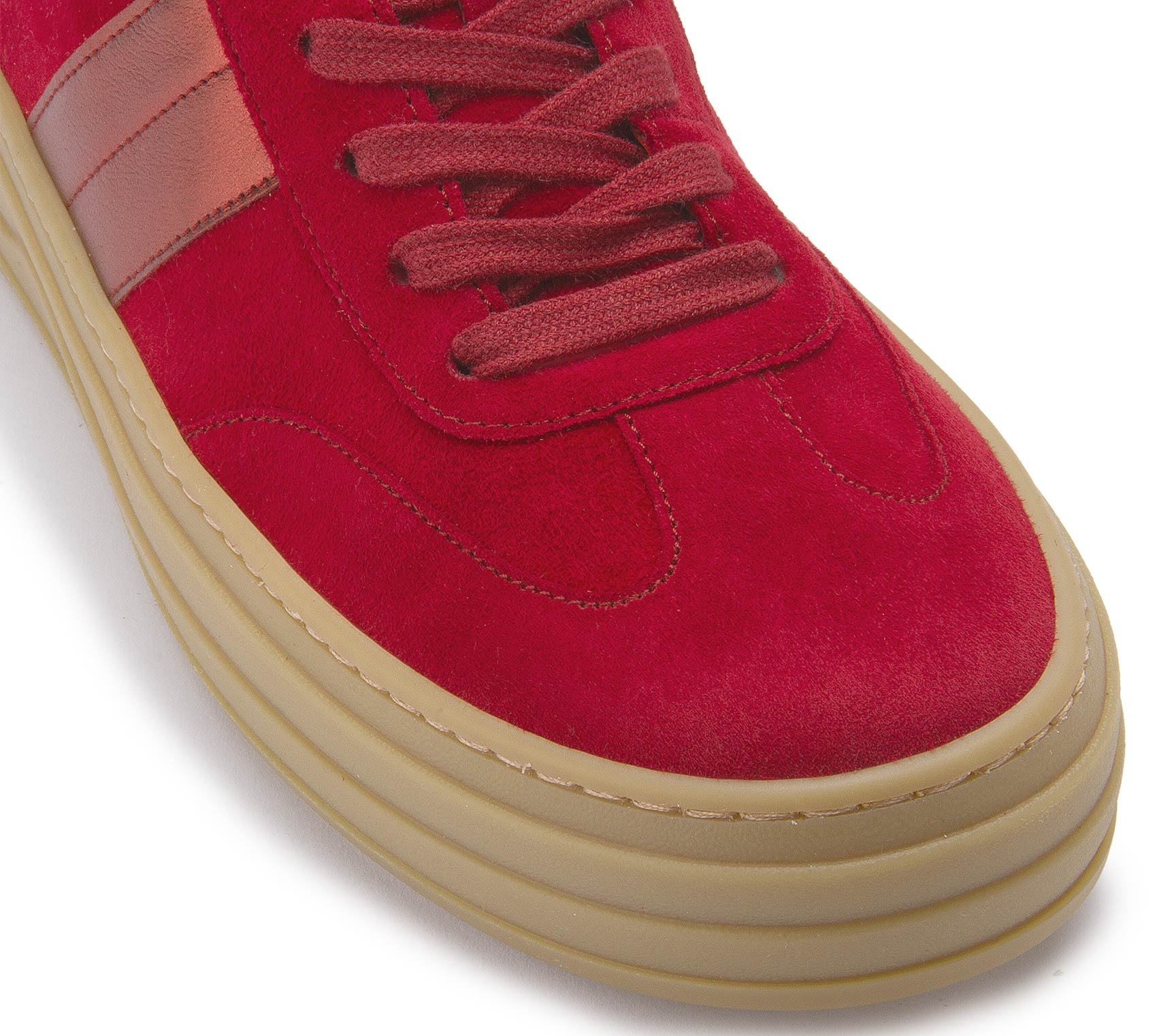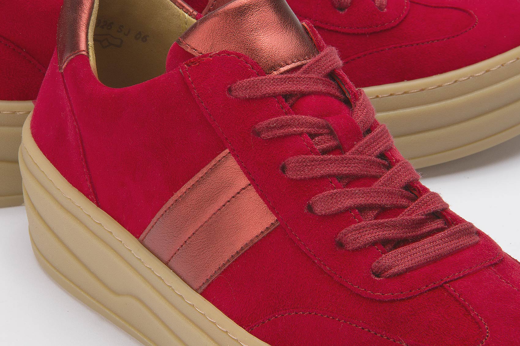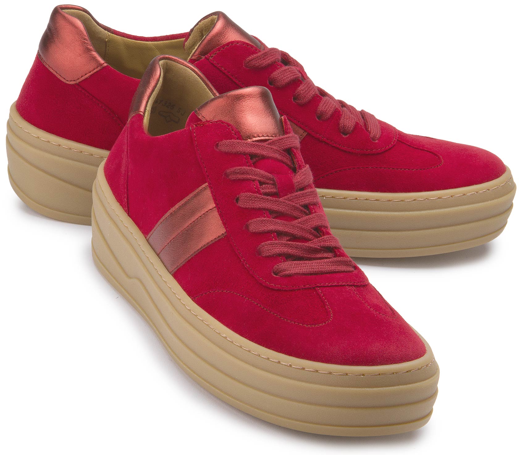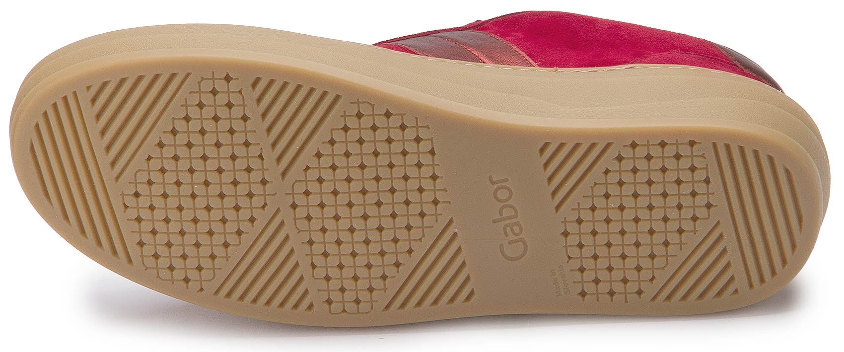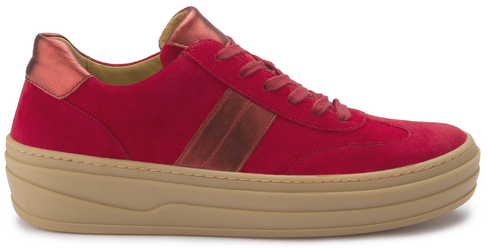 Dieser modische Sneaker von Gabor vereint samtiges rotes Rauleder mit glänzenden Metallic-Akzenten und setzt damit ein echtes Fashion-Statement. Die komfortable Plateau-Sohle und das praktische Wechselfußbett sorgen für ein angenehmes Tragegefühl – ideal für modebewusste Frauen, die Wert auf Stil und Bequemlichkeit legen.